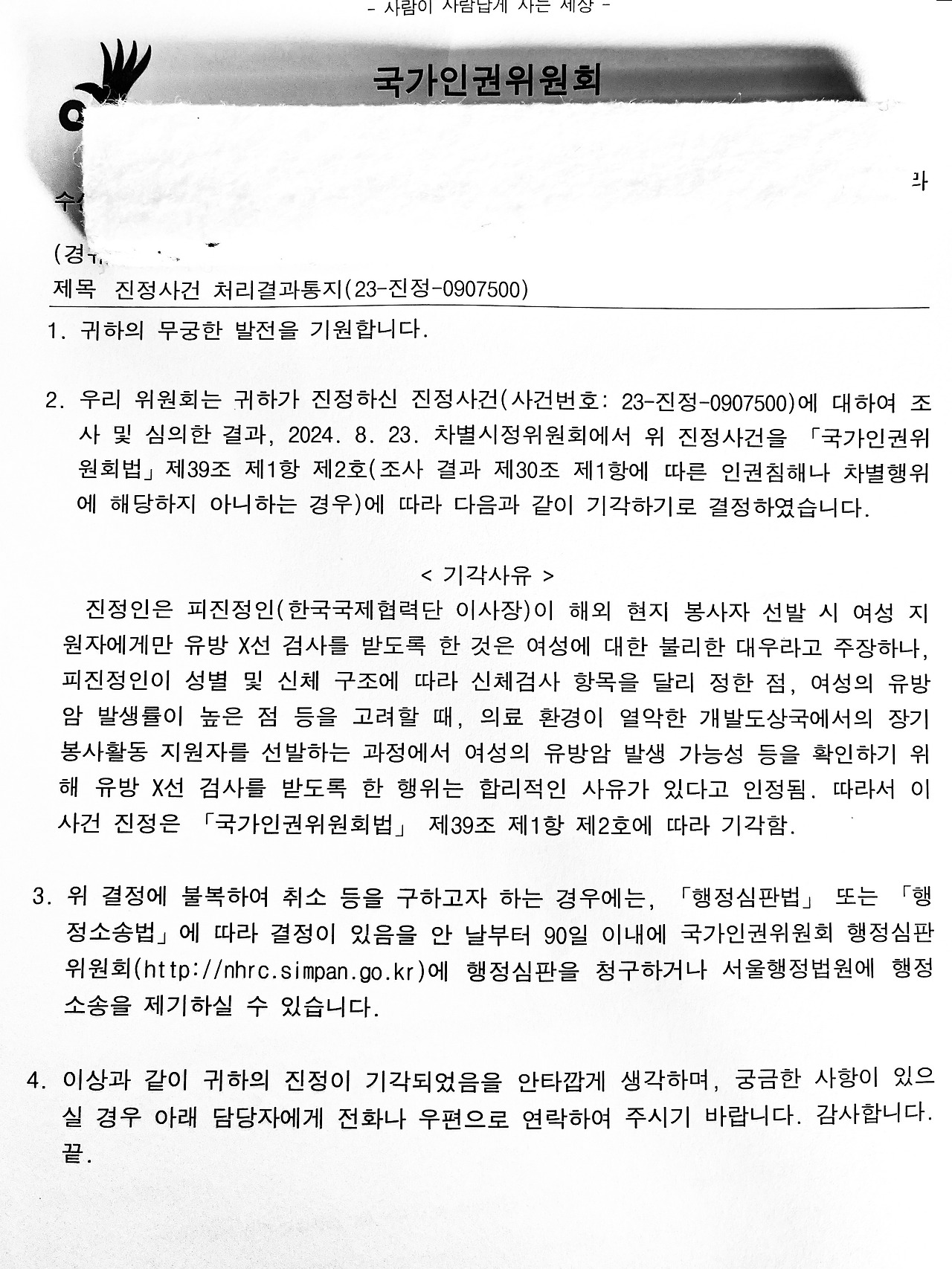 내용인 즉 인권 위원회 진정 사건이 기각되었다는 통보였다.