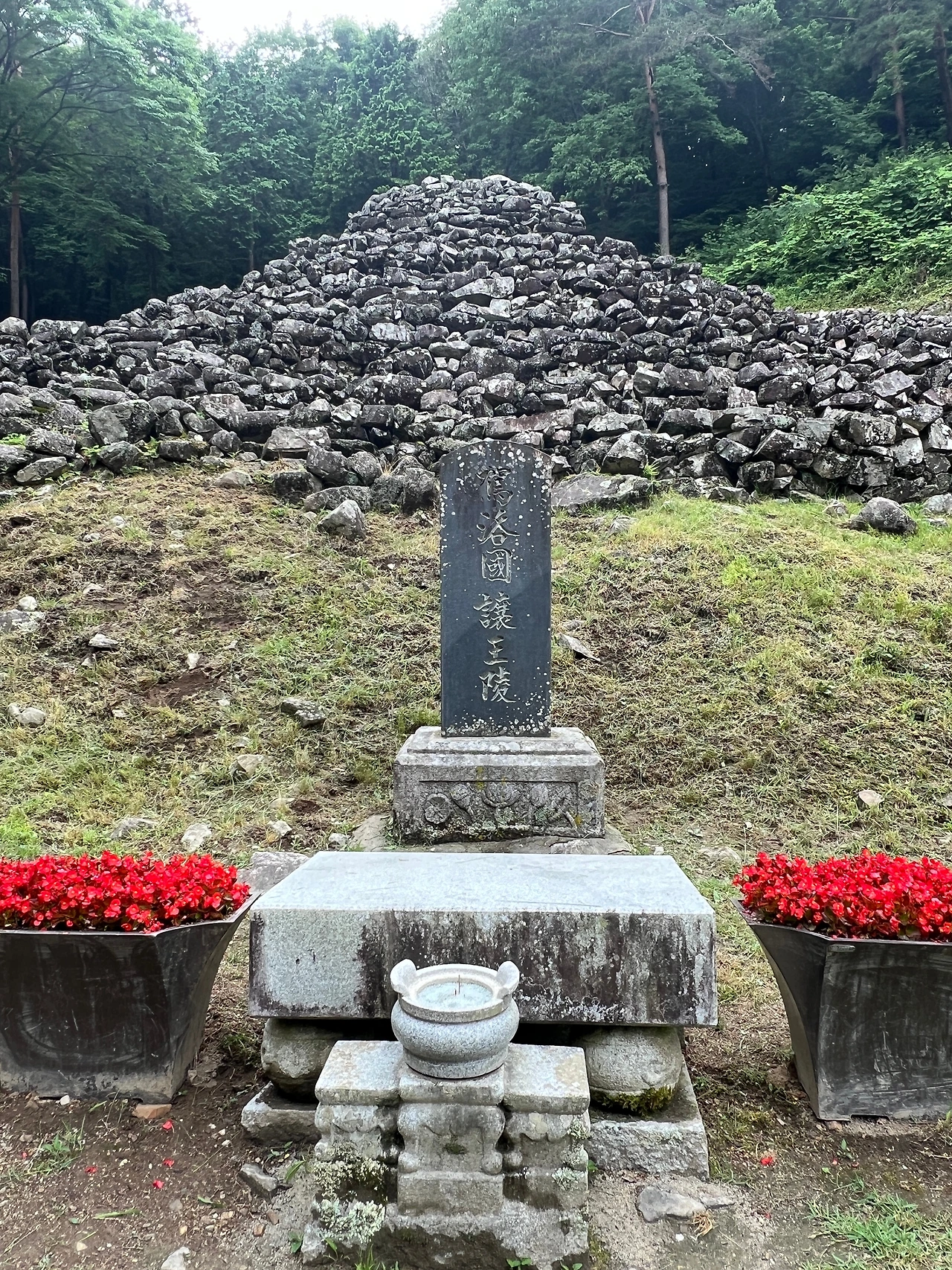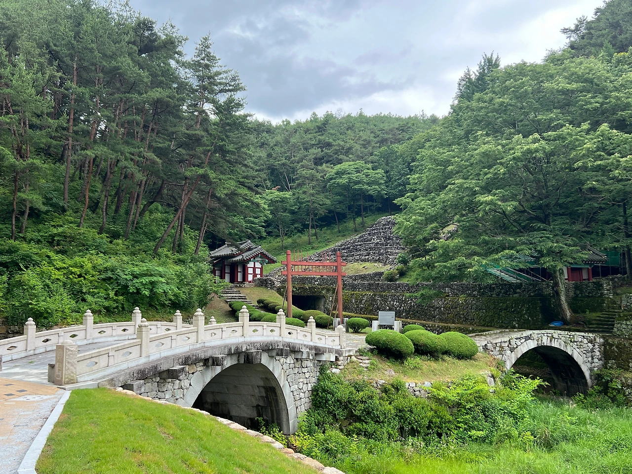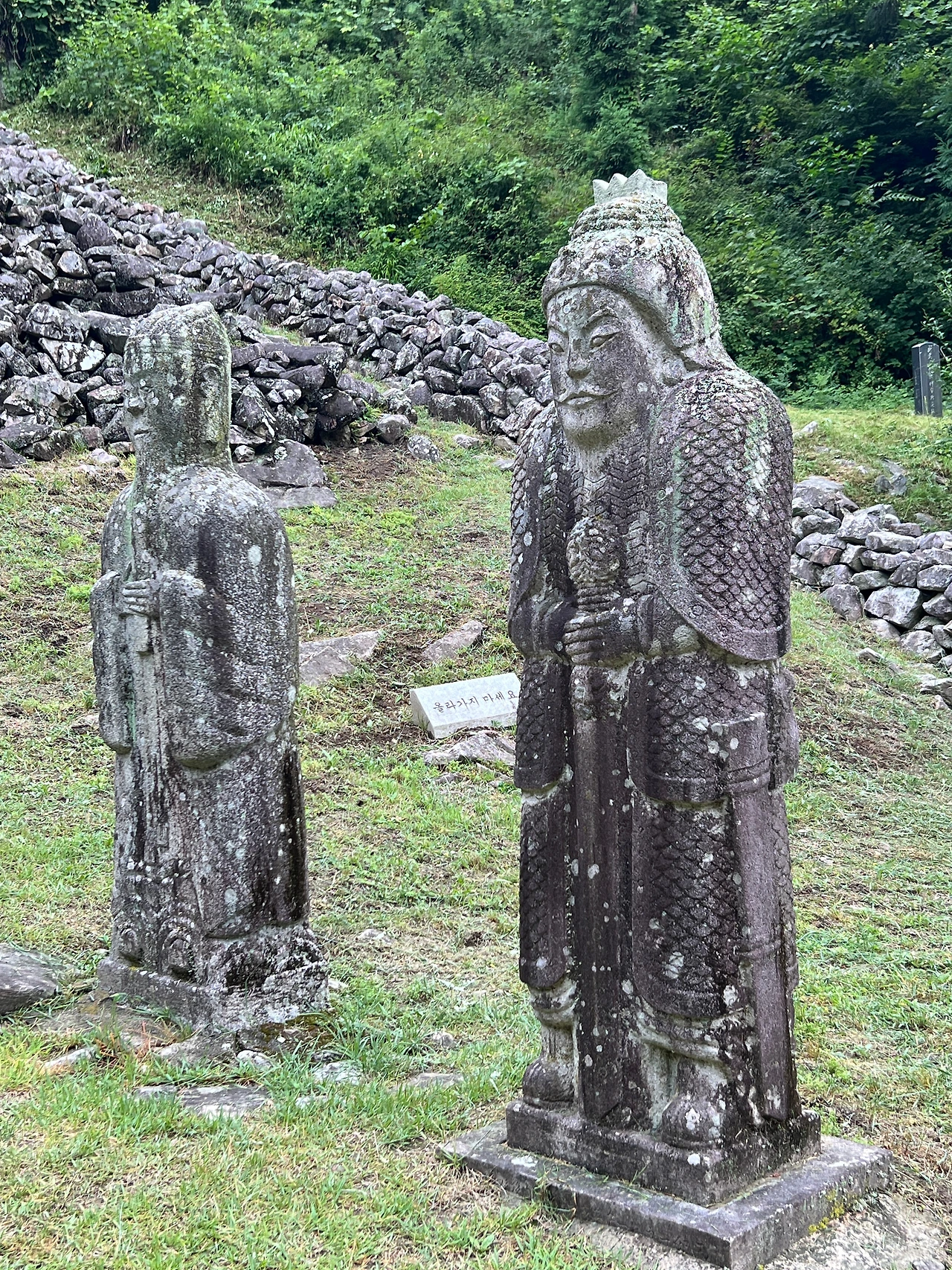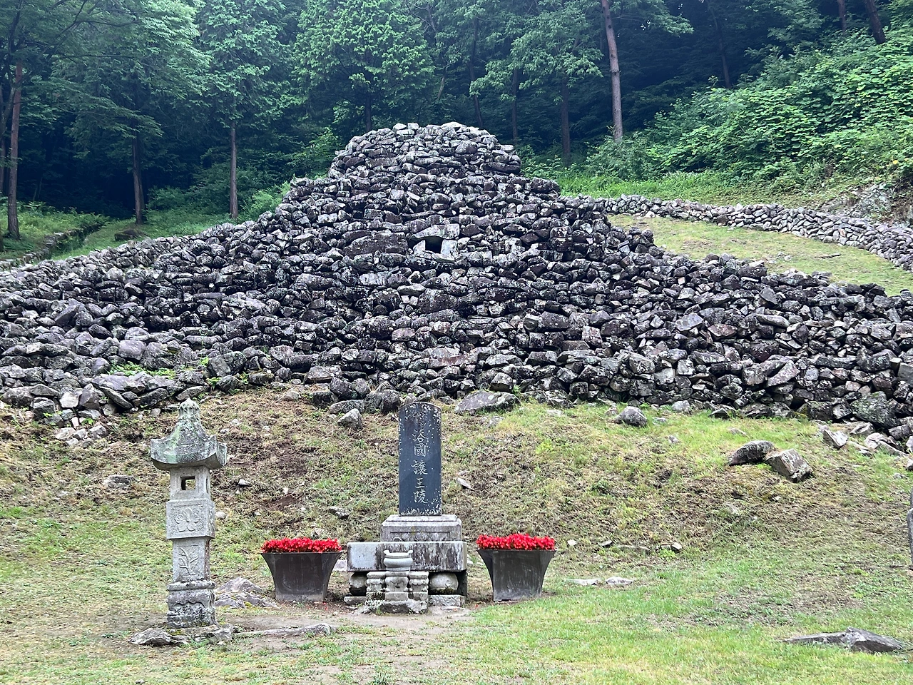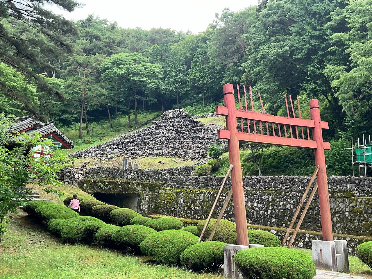 경주에서 본 많은 왕릉들과는 확연히 다르게 돌들이 쌓여져 있는 피라미드형식의 무덤이었다. 아, 우리나라에도 이런 형식의 무덤이 있었구나! 새로운 사실을 알게 되었네~ 하지만 첫 느낌은 왕릉이라고 하기에는 좀 허름하고 소외된 듯한 느낌이 들었는데 왜 그럴까 생각을 해보니 일단 무덤이 돌로 쌓여져 있고 주변이 휑한 느낌이라 그런 듯 했다. 기도를 드리고 있는 분은 한참을 고개 숙여 참배하고 계셨다.