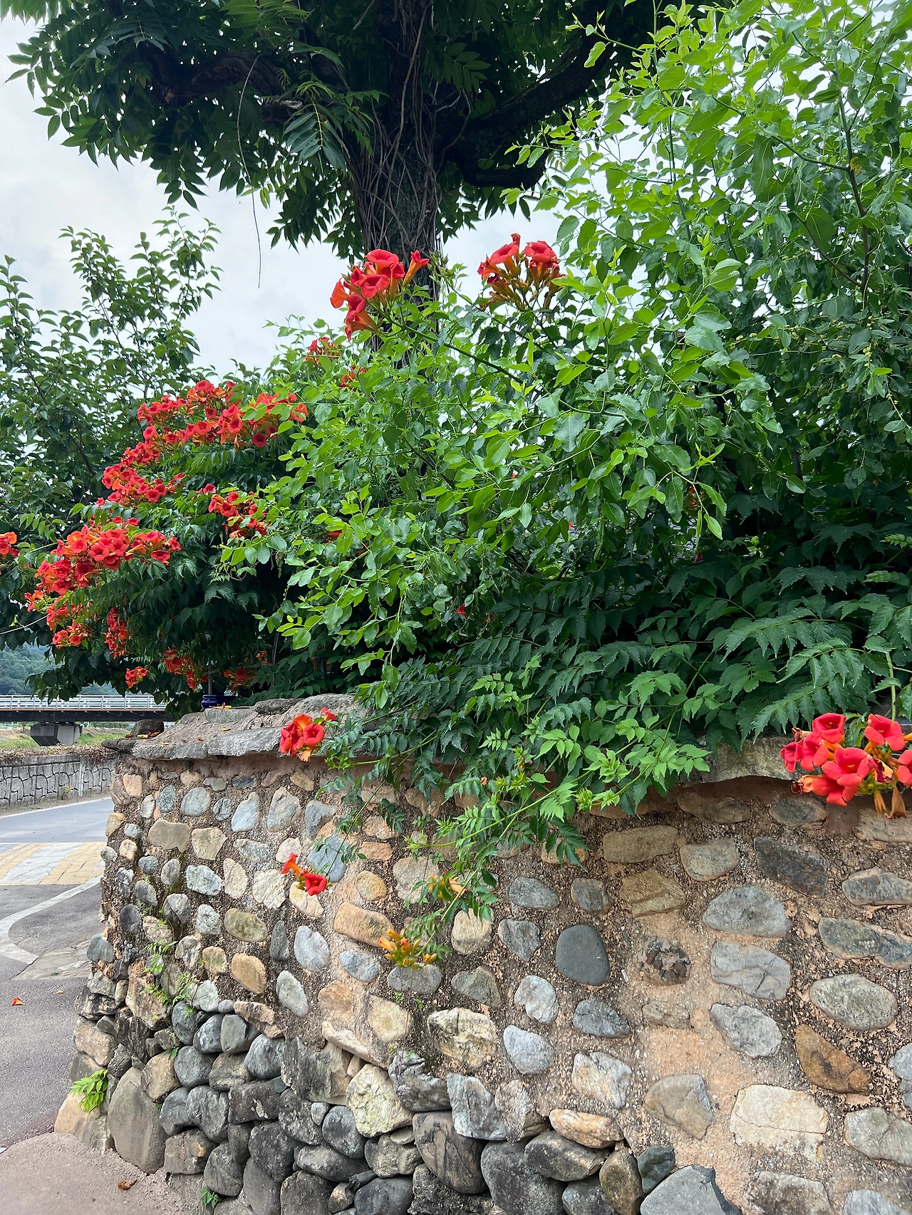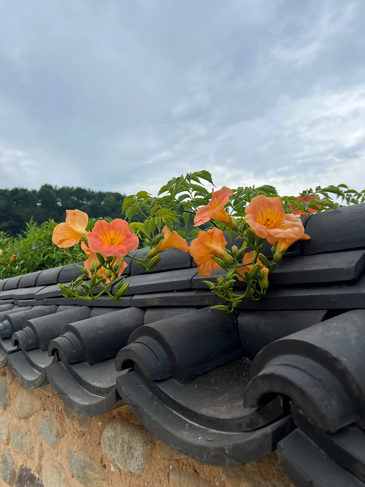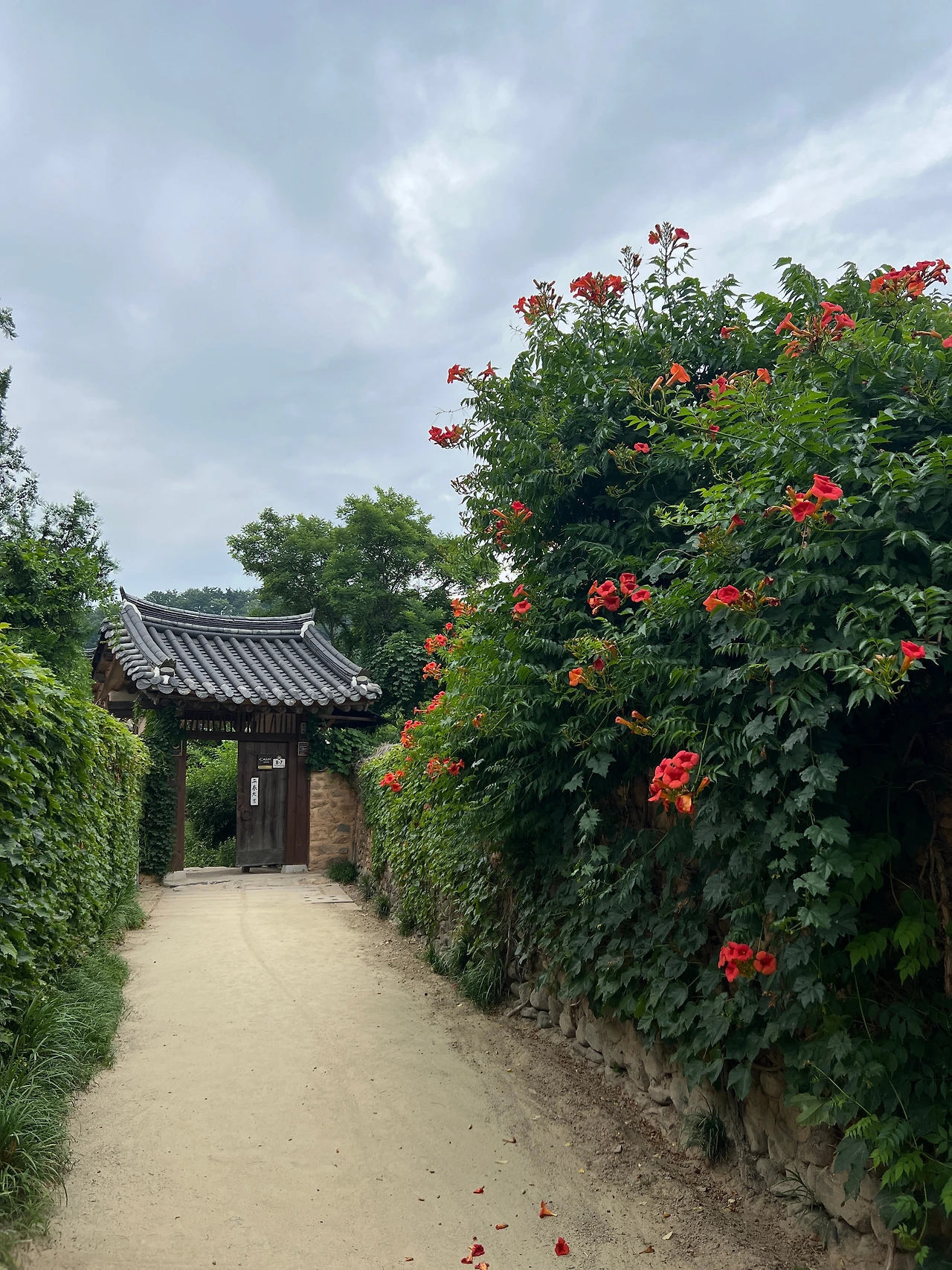 흙으로 만들어진 담에 담쟁이 넝쿨이 가득하고 능소화가 수줍은 듯 선을 넘는다.