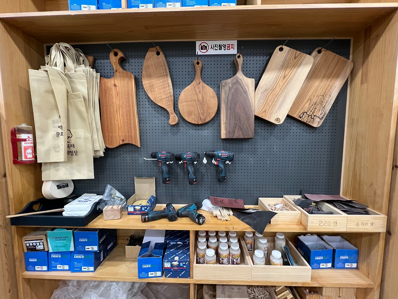 견본품을 꼼꼼히 살펴본 후 '도마 만들기'를 선택했는데, 도마는 어떤 나무를 선택하느냐에 따라 가격이 달라졌다. 느티나무 도마는 35,000원, 편백나무 도마는 25,000원이었다. 목재지도사님은 편백나무 도마를 추천해주셨다. 느티나무는 강도가 세고 단단해서 오히려 칼이 무뎌질수도 있다고 한다.