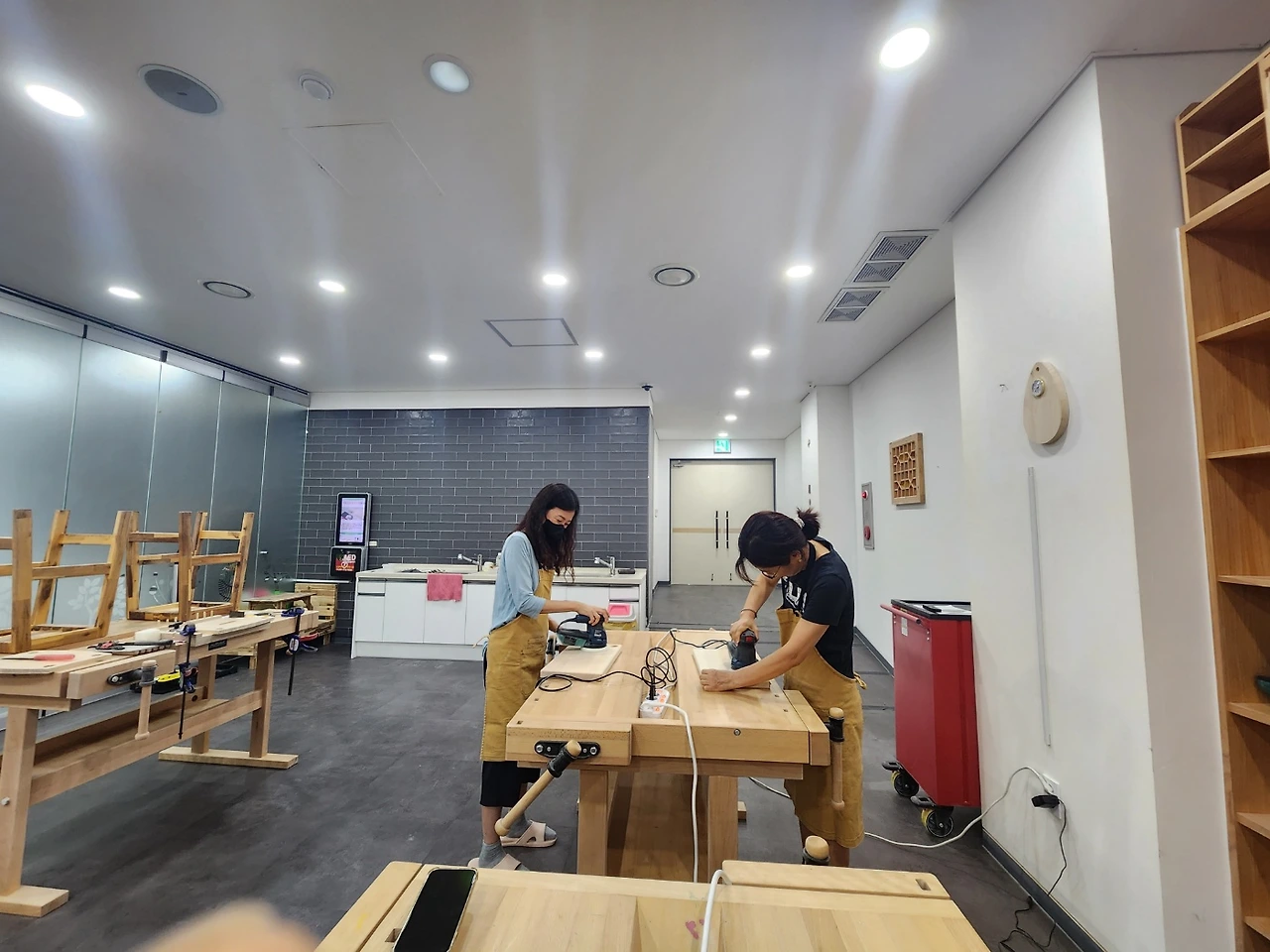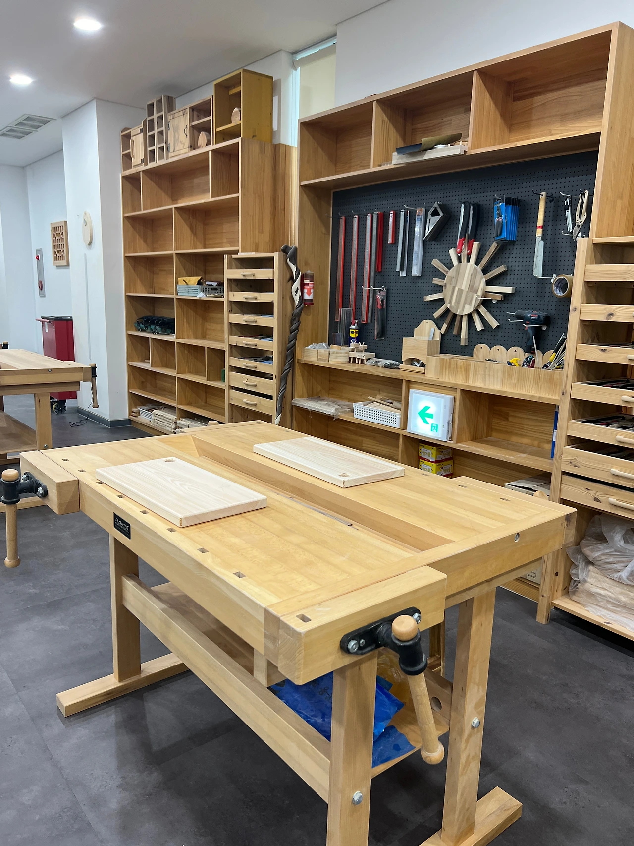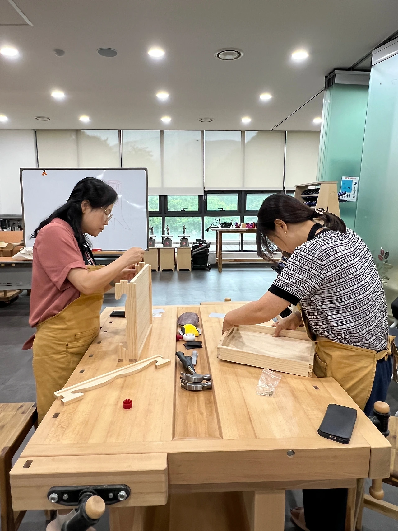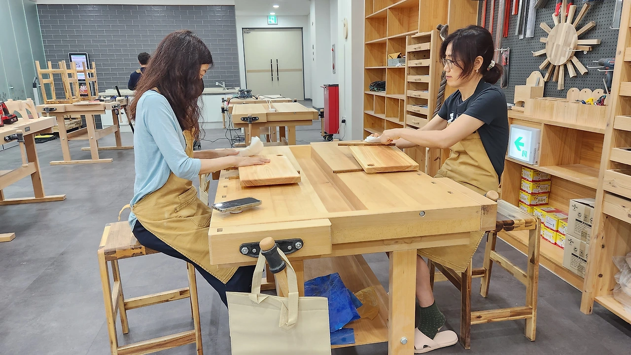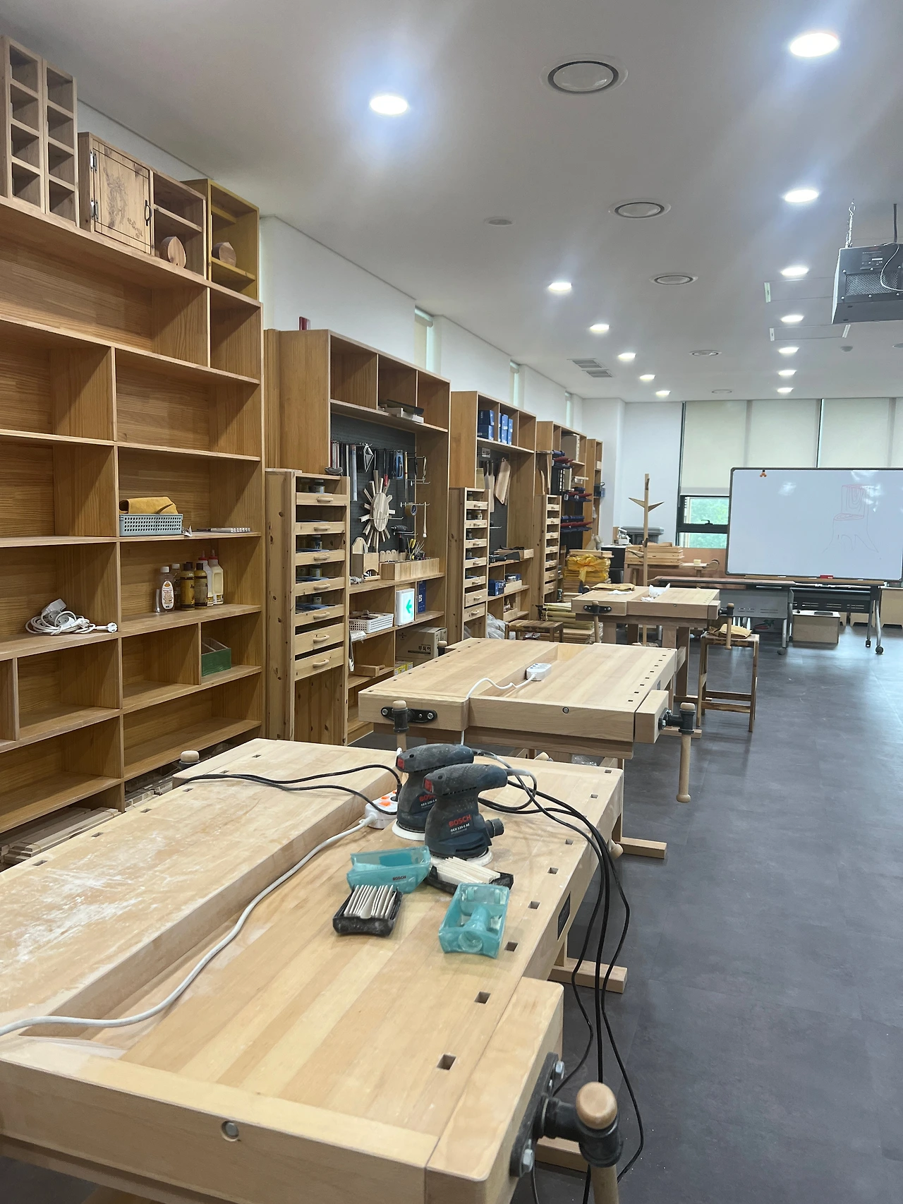목재체험실은 우선 목재 향기가 가득했고 목재로 만든 테이블과 여려가지 장비들이 준비되어 있었다.