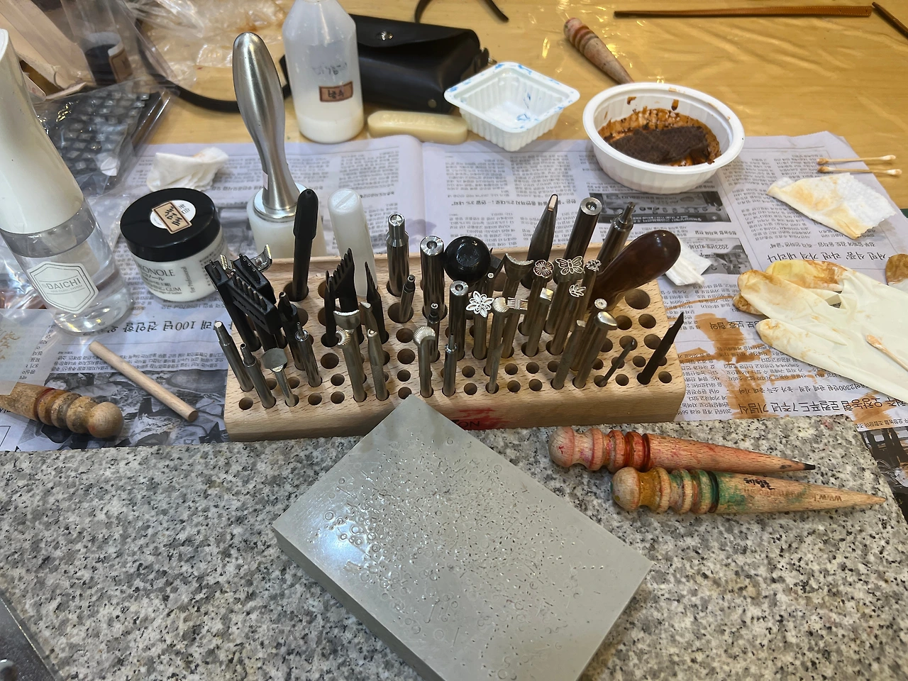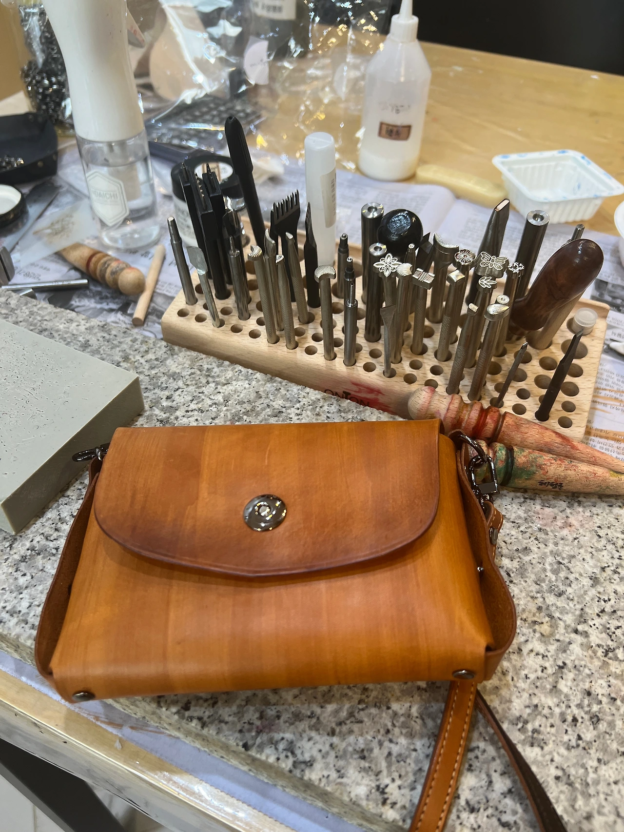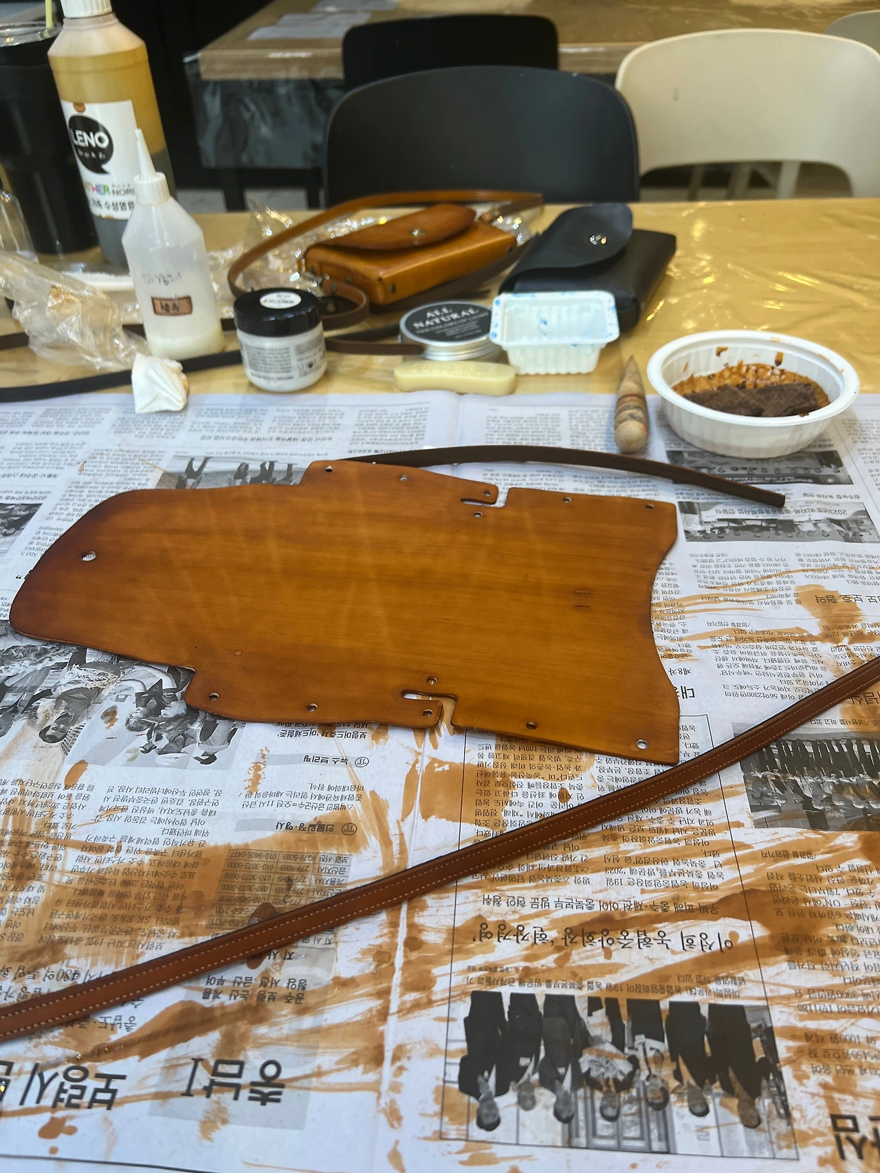 가방 만들기는 일단 가죽이 모두 재단되어 나와 있는 상태였고 여기에 가죽의 안쪽과 바깥쪽 모두 염색을 진행하게 된다. 브라운 색을 선택해서 염색을 마치고 오일을 바른 후, 가죽의 옆면을 도구를 이용하여 계속 다듬어 매끈하게 만들어 준다. 가방 끈도 있어서 시간이 꽤 걸린다. 염색과 밑작업을 다 끝내면 징을 박아 가방을 완성. 이 부분에서 선생님이 많이 도와주셨다. ㅎㅎ