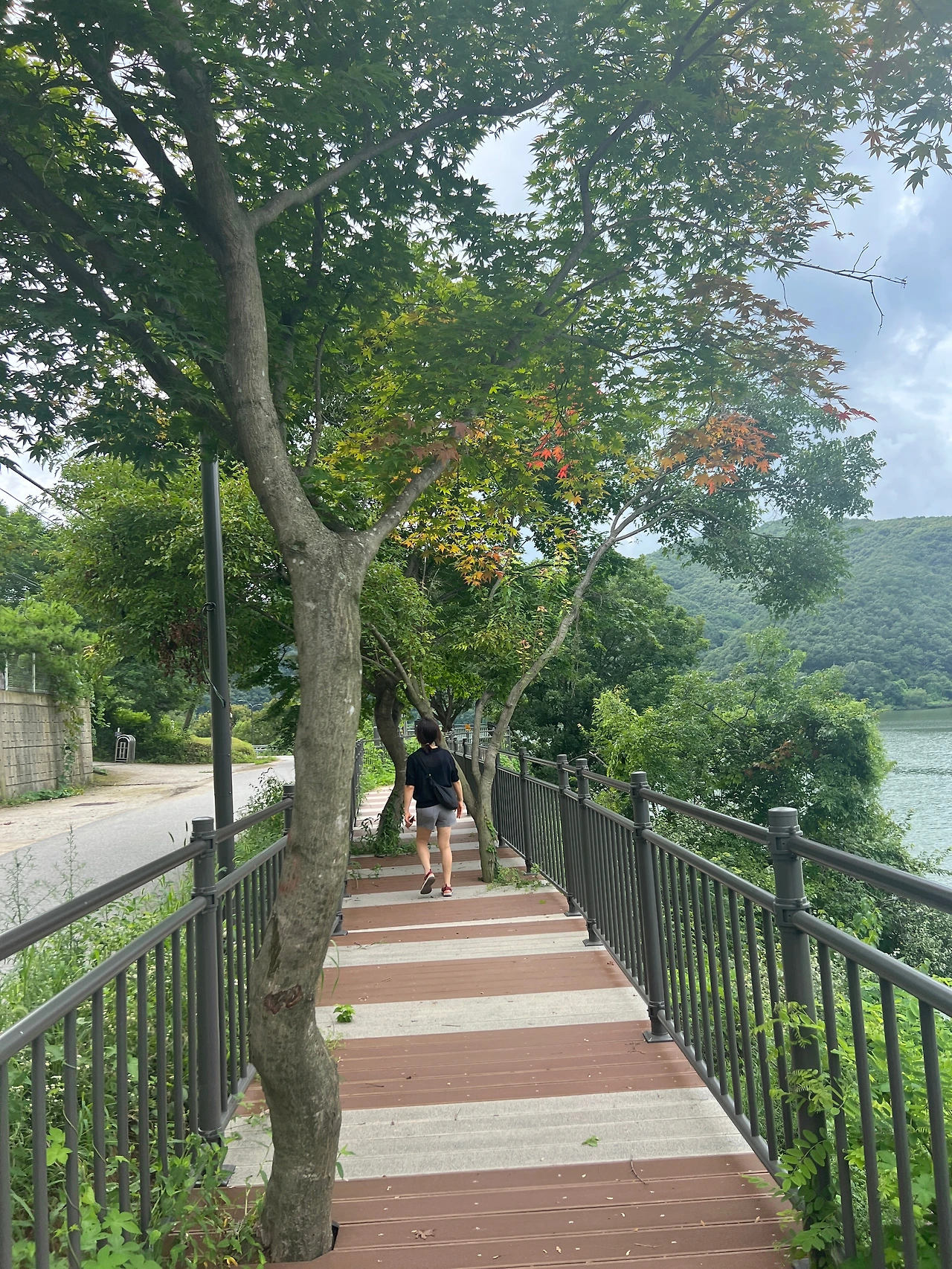 품바 재생촌과 원남 저수지는 지척이다. 간단한 점심과 카페에서의 휴식이후 원남저수지 둘레길에 도전했다. 눈으로 보기에는 금방일 거처럼 보였다. 카페 윤슬에서 시작되는 데크길은 걷기에 너무 좋았다. 타박 타박 발걸음을 옮기며 저수지도 구경하고 시원한 바람과 더불어 기분좋게 나선다. 그런데 한참을 가다보면 데크길이 끊긴 부분이 있었다. 아직 공사중인듯하다. 그럴땐 차도로 살짝 나와 길을 걷고 다시 데크길로 들어간다.