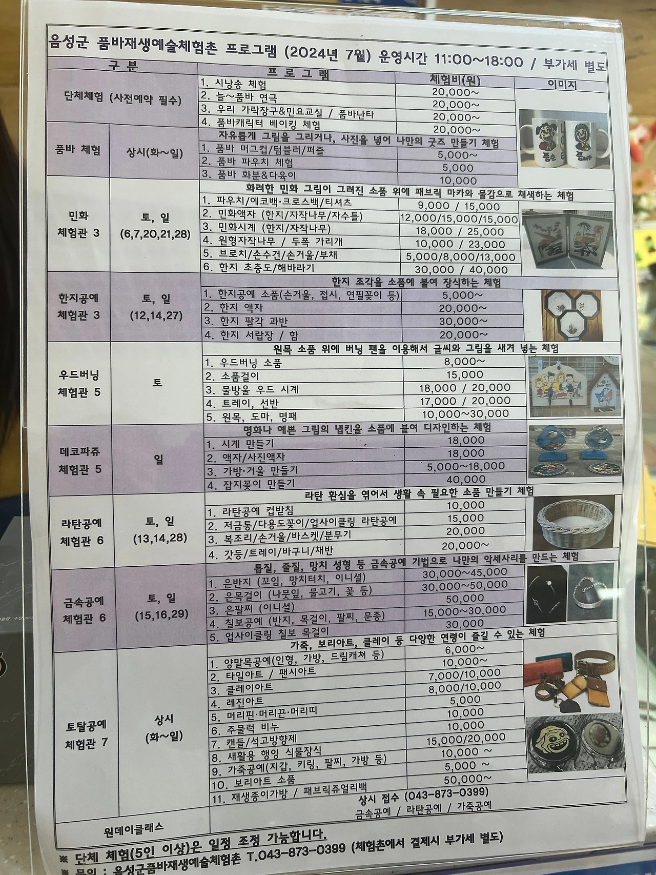음성군 품바재생예술체험촌은 음성군의 특색있는 콘텐츠인 품바와 환경에 대해 다시 생각해 보는 재생예술을 함께 접할 수 있는 관광명소다. 품바 리듬을 배울 수 있는 아카데미와 재활용체험을 할수 있는 재생예술 프로그램, 그리고 실제 작가들이 내려와 직접 가르쳐주는 체험활동(주말 한정)을 제공하고 있다. 아이부터 성인까지 다양하게 체험할 수 있는 프로그램이 있다는 것이 장점.