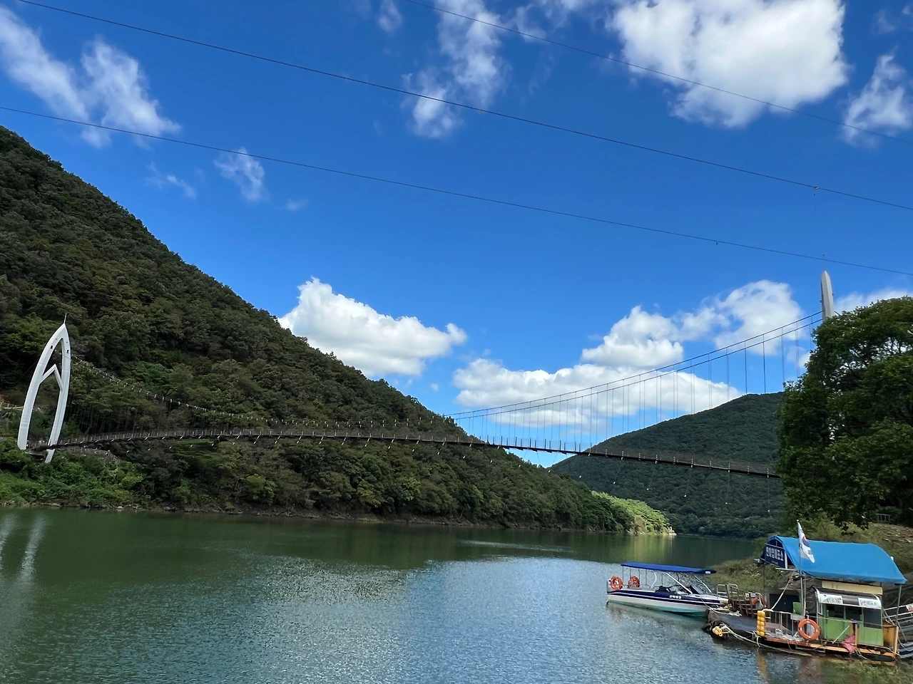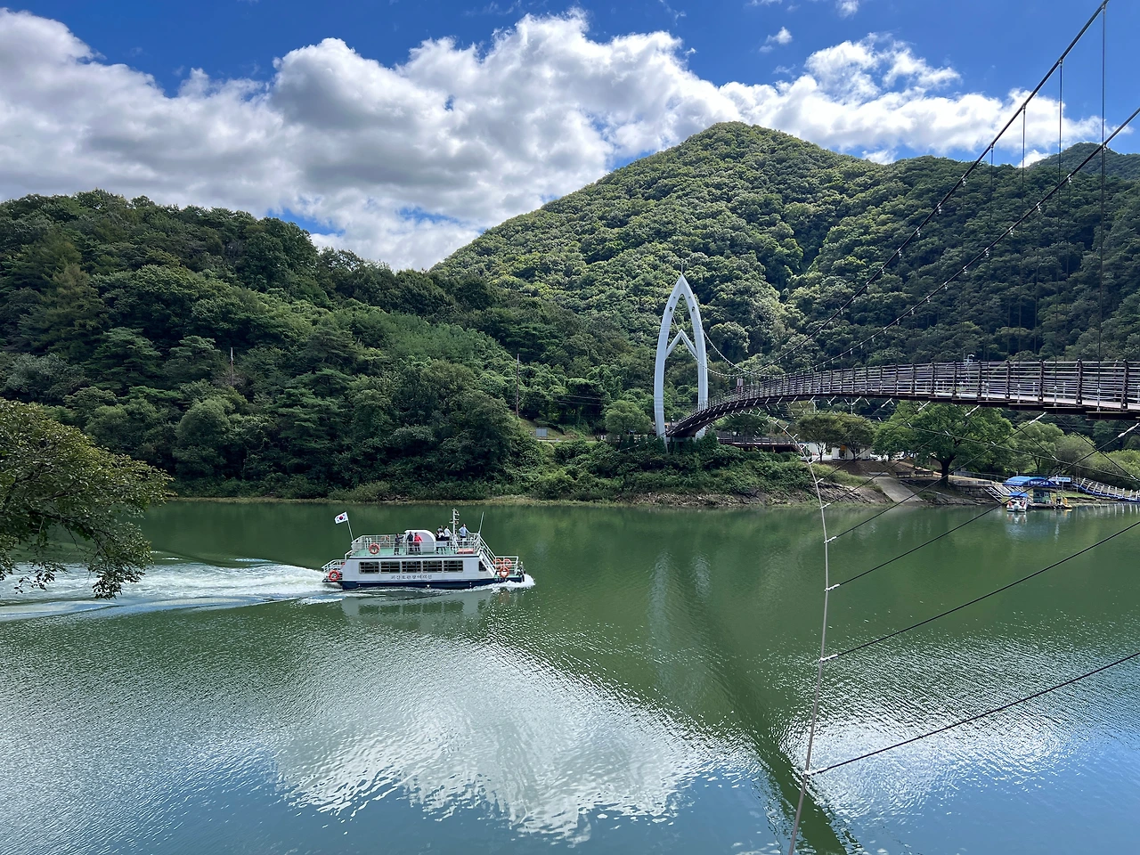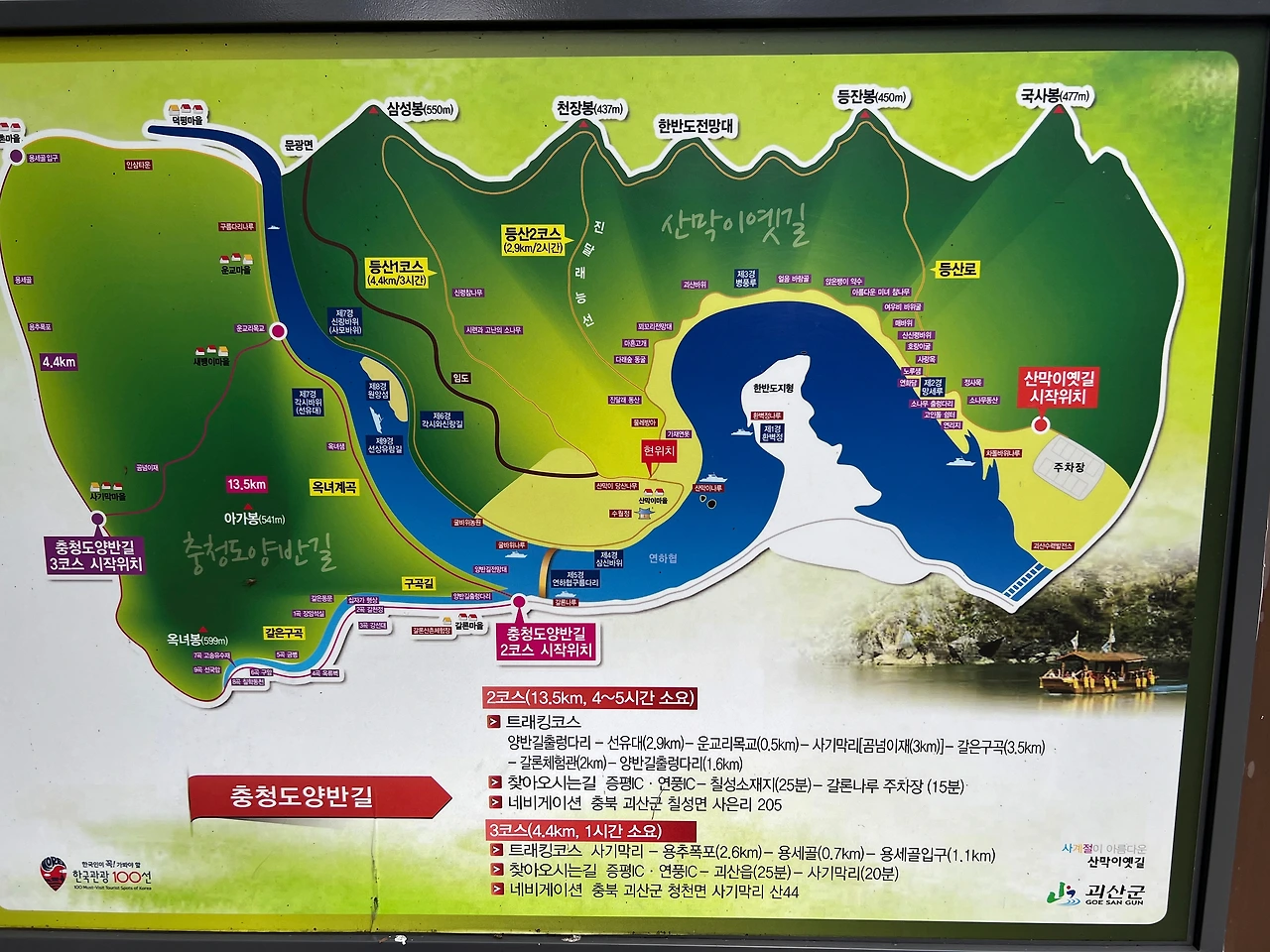 다리를 건너면 충청도 양반길로 갈 수도 있고 이곳 괴산댐 선착장에서 배를 타고 더 나아가 신랑바위와 각시바위를 보고(이곳에 세뱅이 선착장이 있다) 돌아가 산막이옛길 시작점에 있는 차돌바위 선착장으로 갈 수 있다.