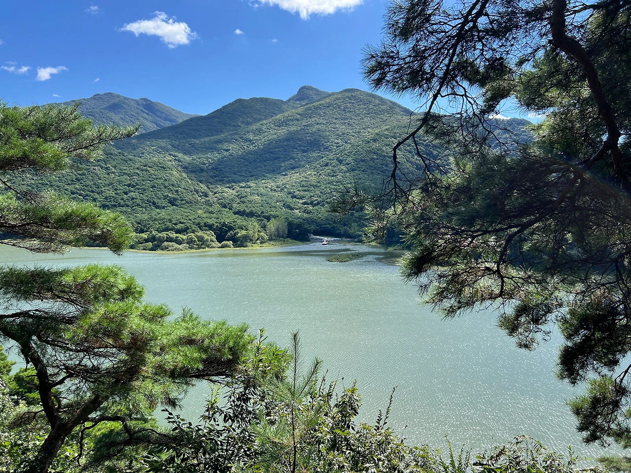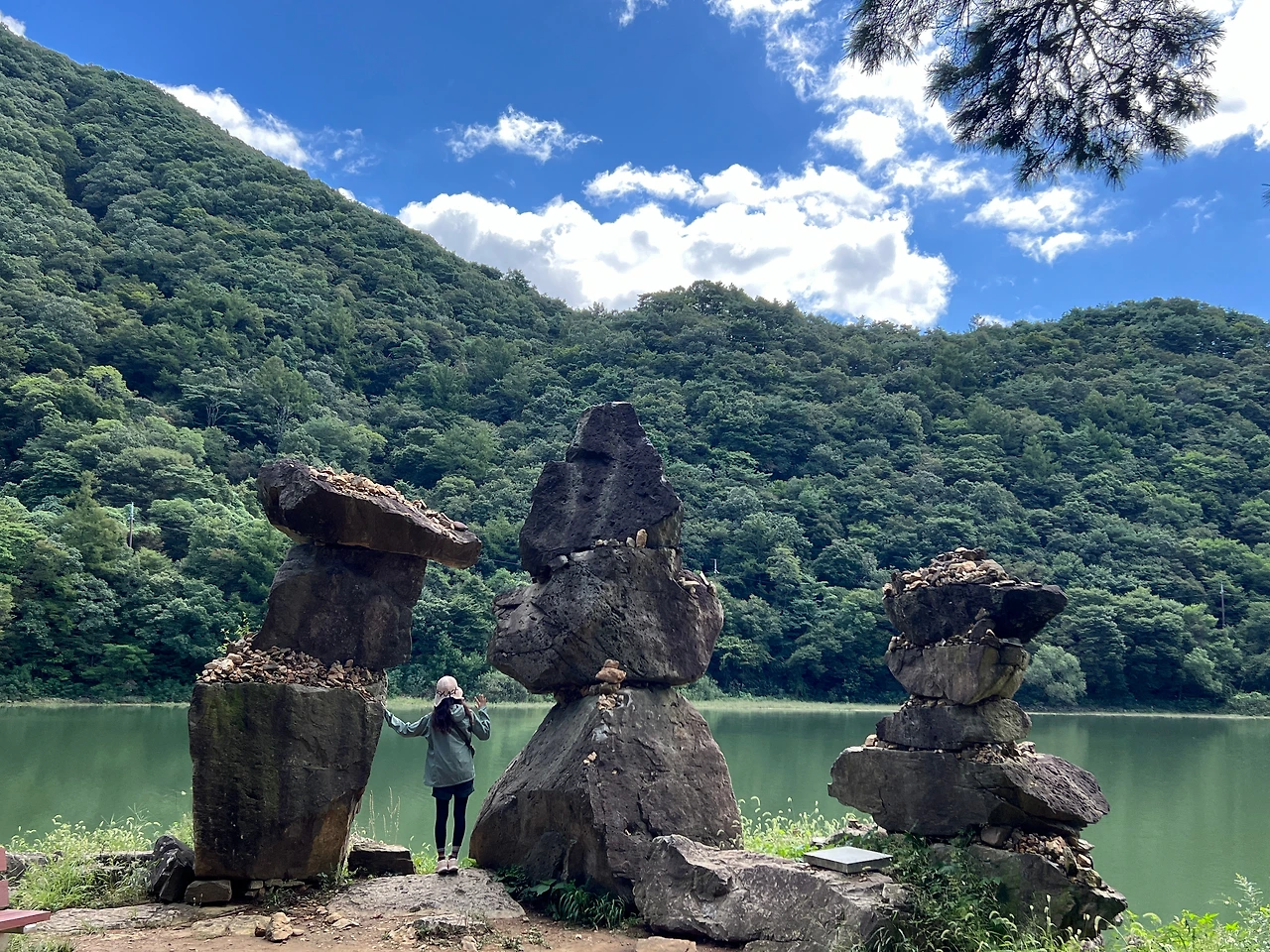 삼신바위가 있는 곳 경치가 끝내주게 좋다. 바위도 멋지고 구름도, 그리고 구름이 반영된 호수물도 유리처럼 맑고 깊다.