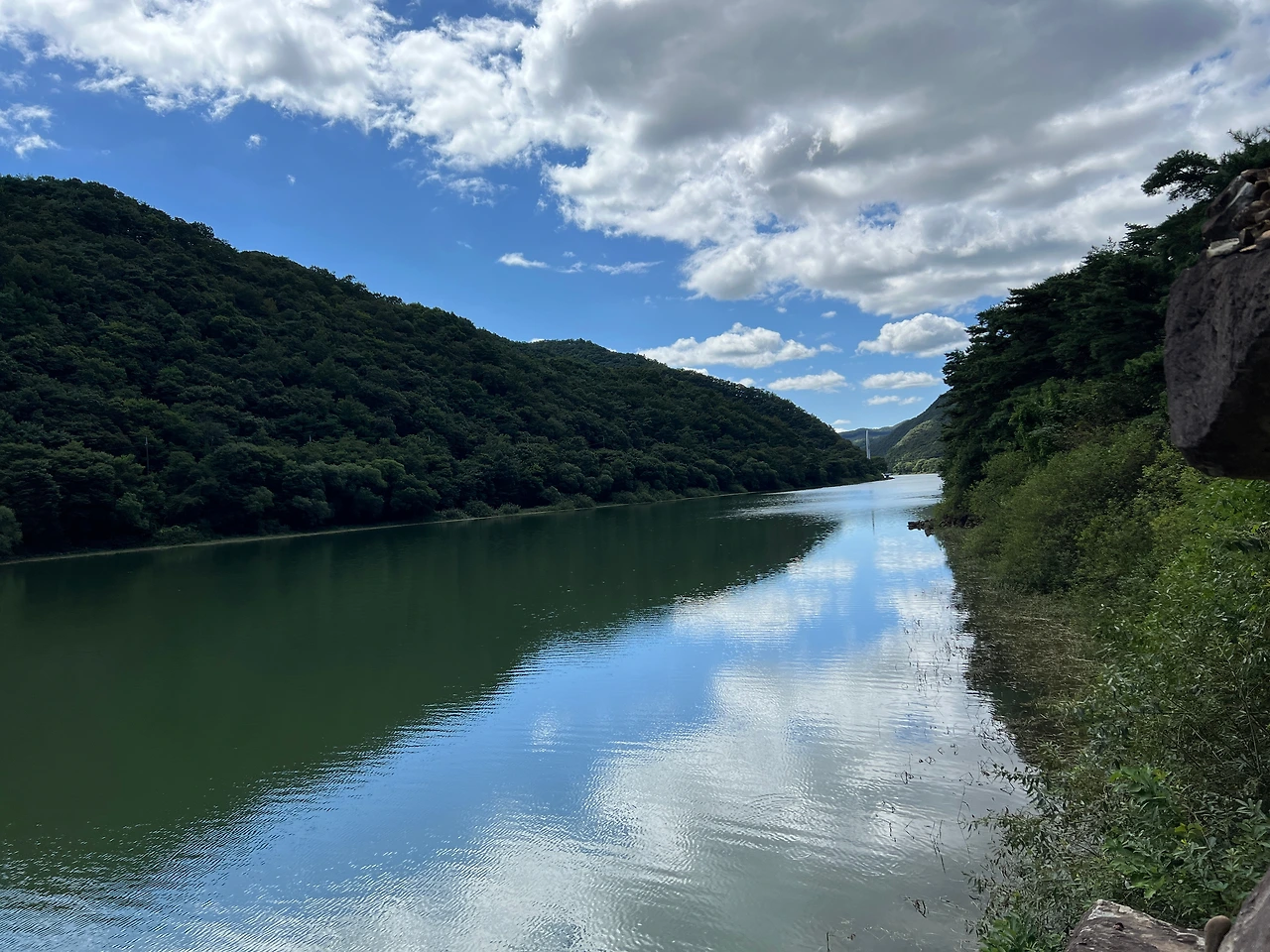 괴산호는 그저 덩치만 무작정 큰 저수지가 아니다. 마치 물길이 있듯 주변 지형에 따라 모양이 형성되어 있어 다채로운 모습을 보여준다. 괴산호 너머로 보이는 산도 이쁘다.