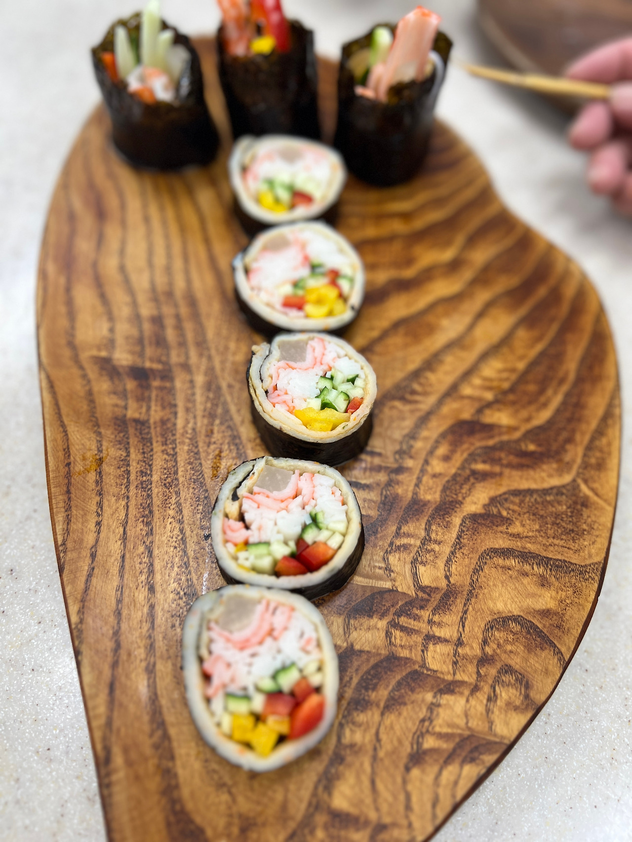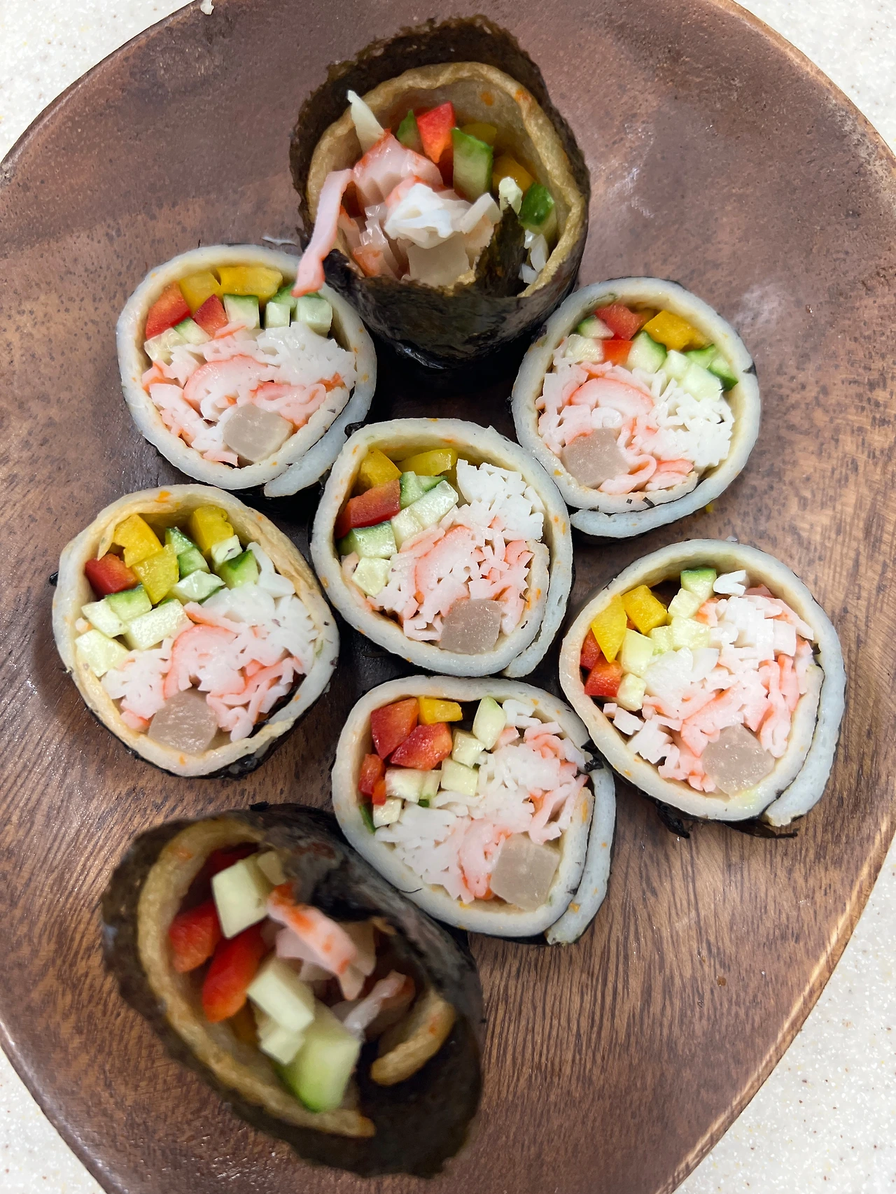 그리고 그 위에 맛살을 찢어 넣고 단무지, 파프리카, 오이를 듬뿍 넣은 후 돌돌 말아주면 끝!