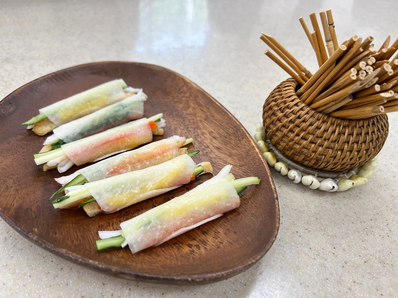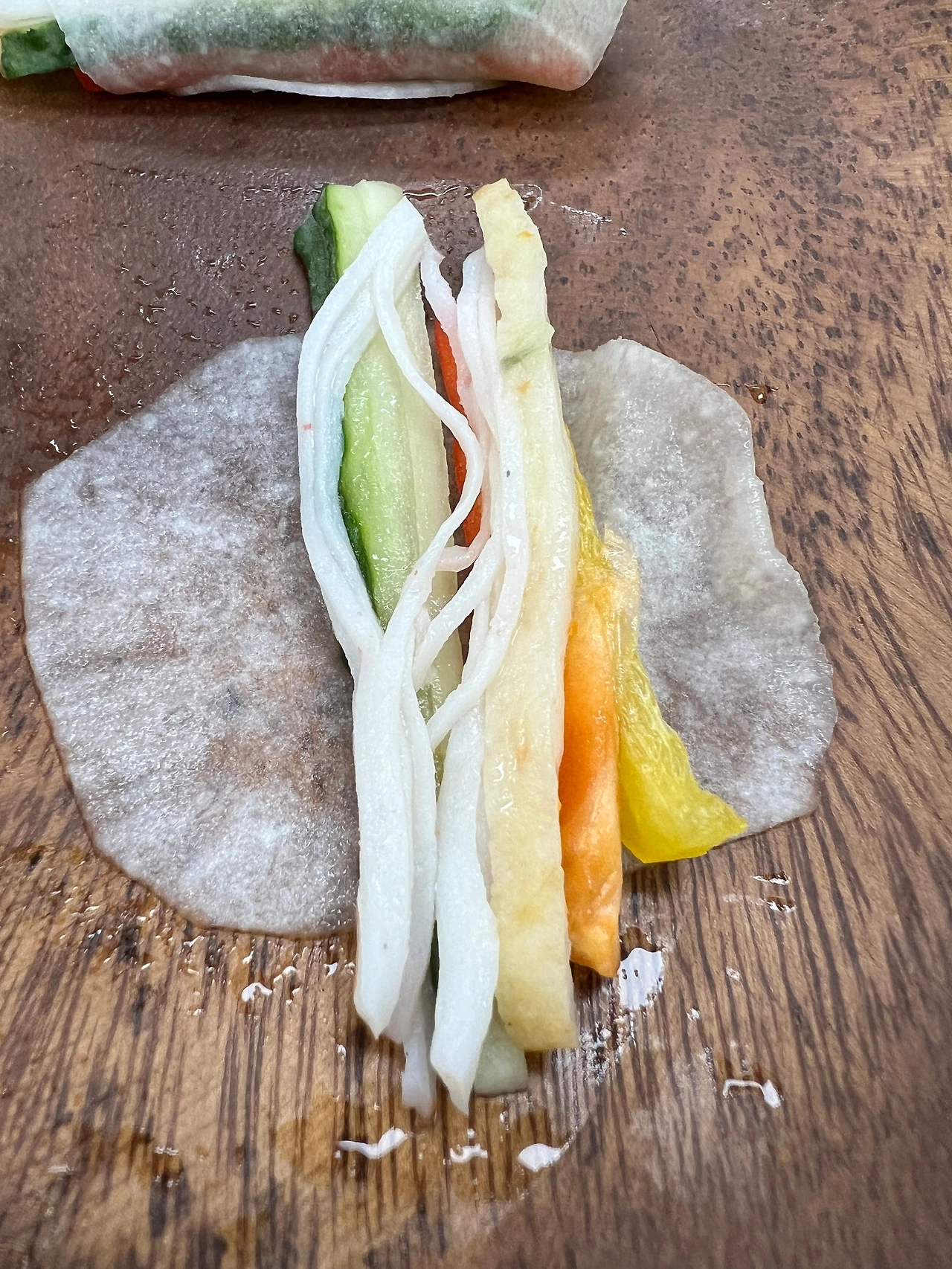 일단 무쌈은 안에 맛살과 어묵, 파프리카와 오이를 넣었다. 그리고 무쌈으로 말아주면 끝!