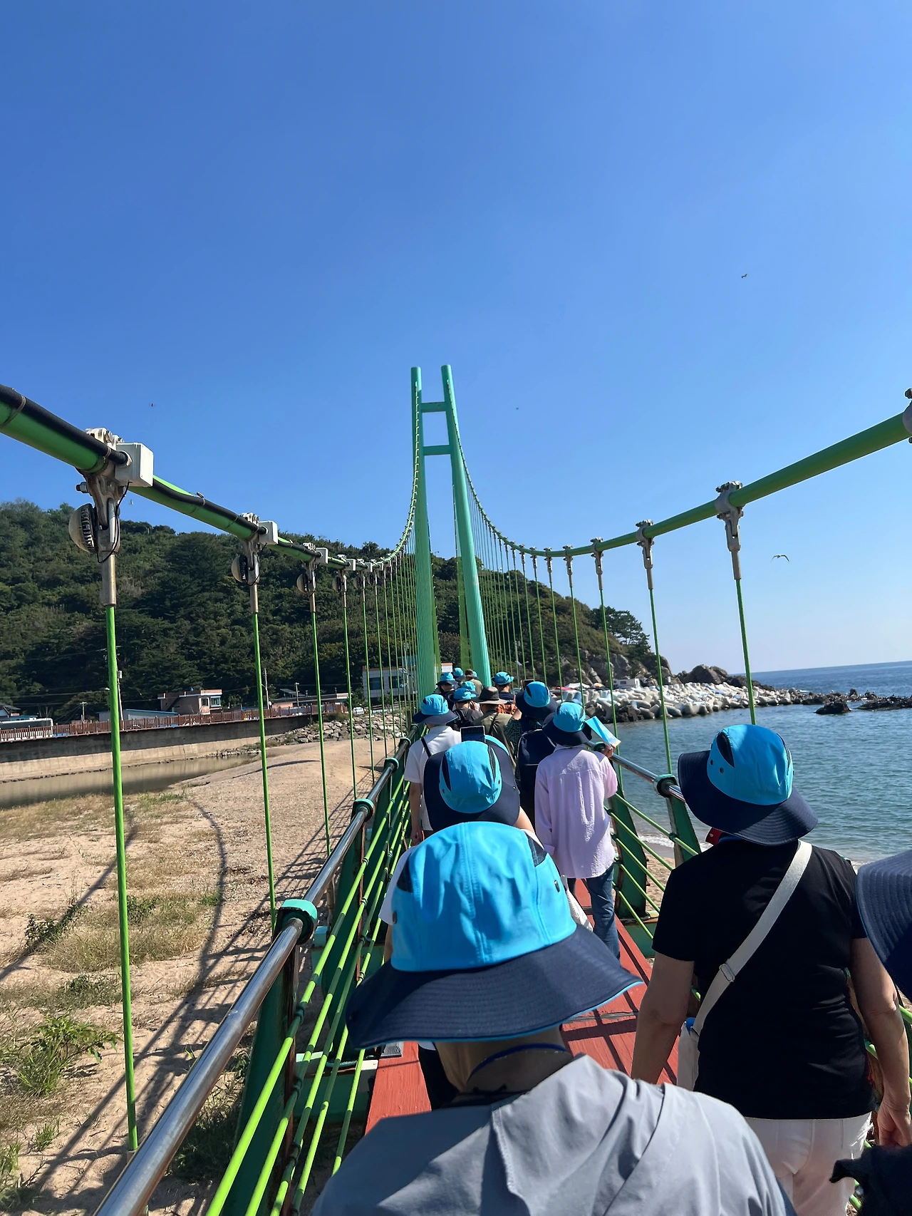 축산항에서 물가지미 정식을 먹고 죽도산으로 향했다. 죽도산은 강구항과 더불어 영덕의 대표적인 항이다. 죽도산은 바로 이 축산항 바로 뒤에 위치해있다. 원래는 섬이었으나 매립공사를 통해 육지와 이어지면서 자연스럽게 산이 되었다고 한다. 높이는 겨우 87미터고 대나무가 많아 죽도산이라 불리우게 되었다. 산꼭대기에 지상 7층 높이의 죽도산 전망대가 위치해 있다. 축산항에서 죽도산을 가려면 출렁다리를 건넌다. 바다위의 출령다리...멋진데? 그런데 한쪽은 바다, 다른 한쪽은 모래더미다.