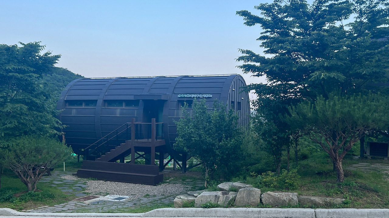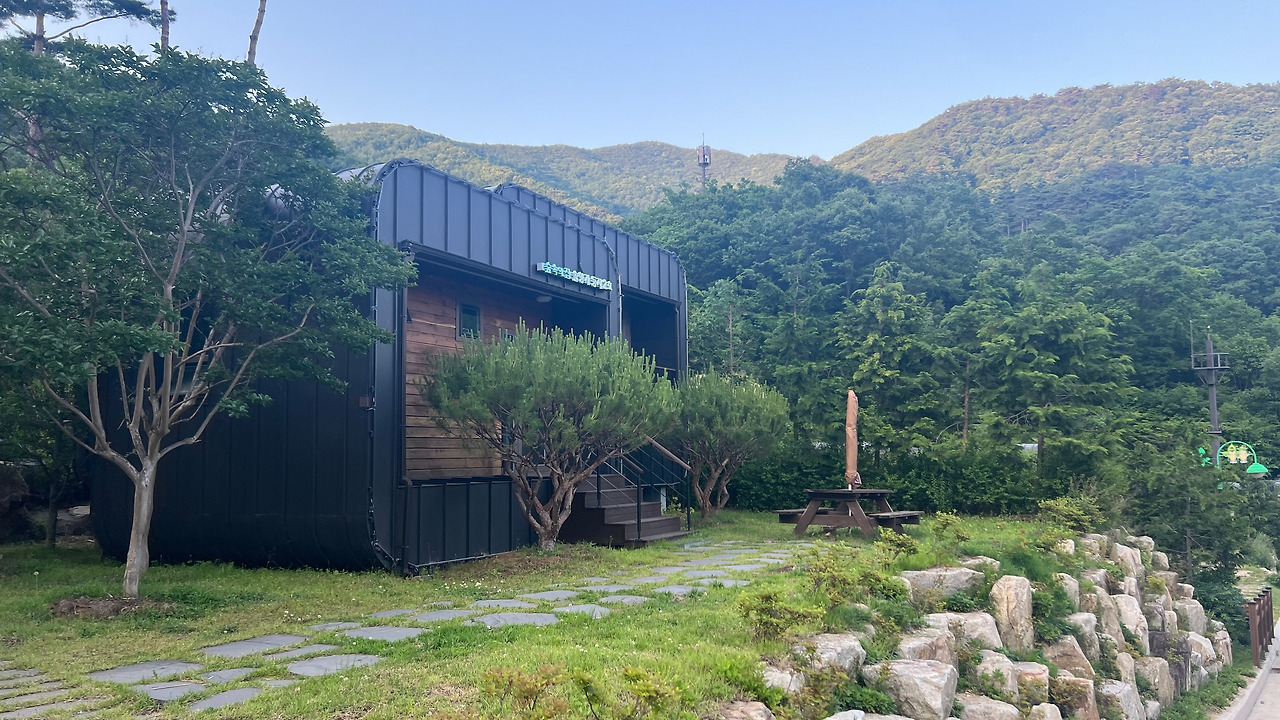 숲속의 집 대나무는 생긴 보양이 정말 대나무통을 닮았다. 바로 앞에 주차가 가능하고 그 옆에 파라솔이 있어 야외에서 음식을 먹거나 피크닉을 즐길 수도 있다.