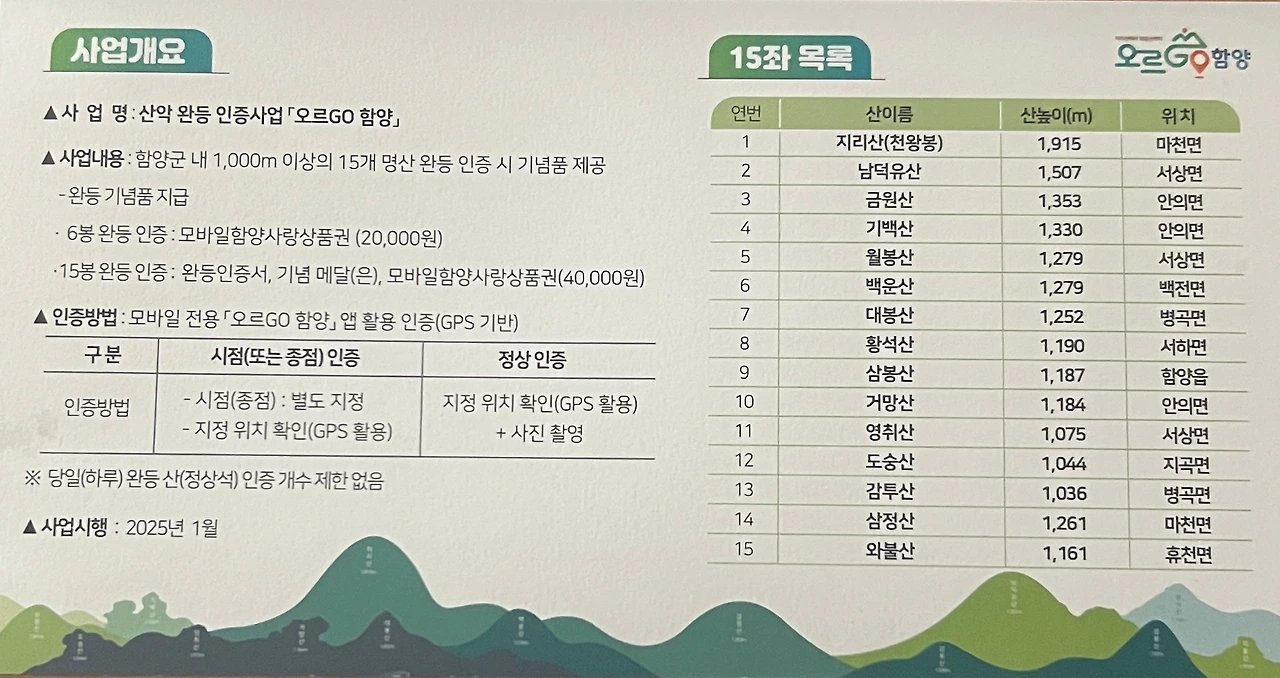 오르GO 함양은 산악 완등 인증사업으로 함양군내 천 미터이상의 15대 명산을 완등 인증시 기념품을 제공하는 프로그램이다. 6봉 완등을 하면 모바일 함양사랑상품권(이만원)을 주고 15봉을 완등한 경우 완등인증서. 기념메달, 모바일함양사랑상품권(사만원)을 증정한다.