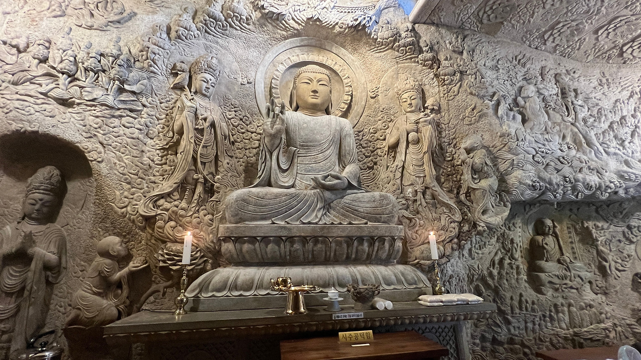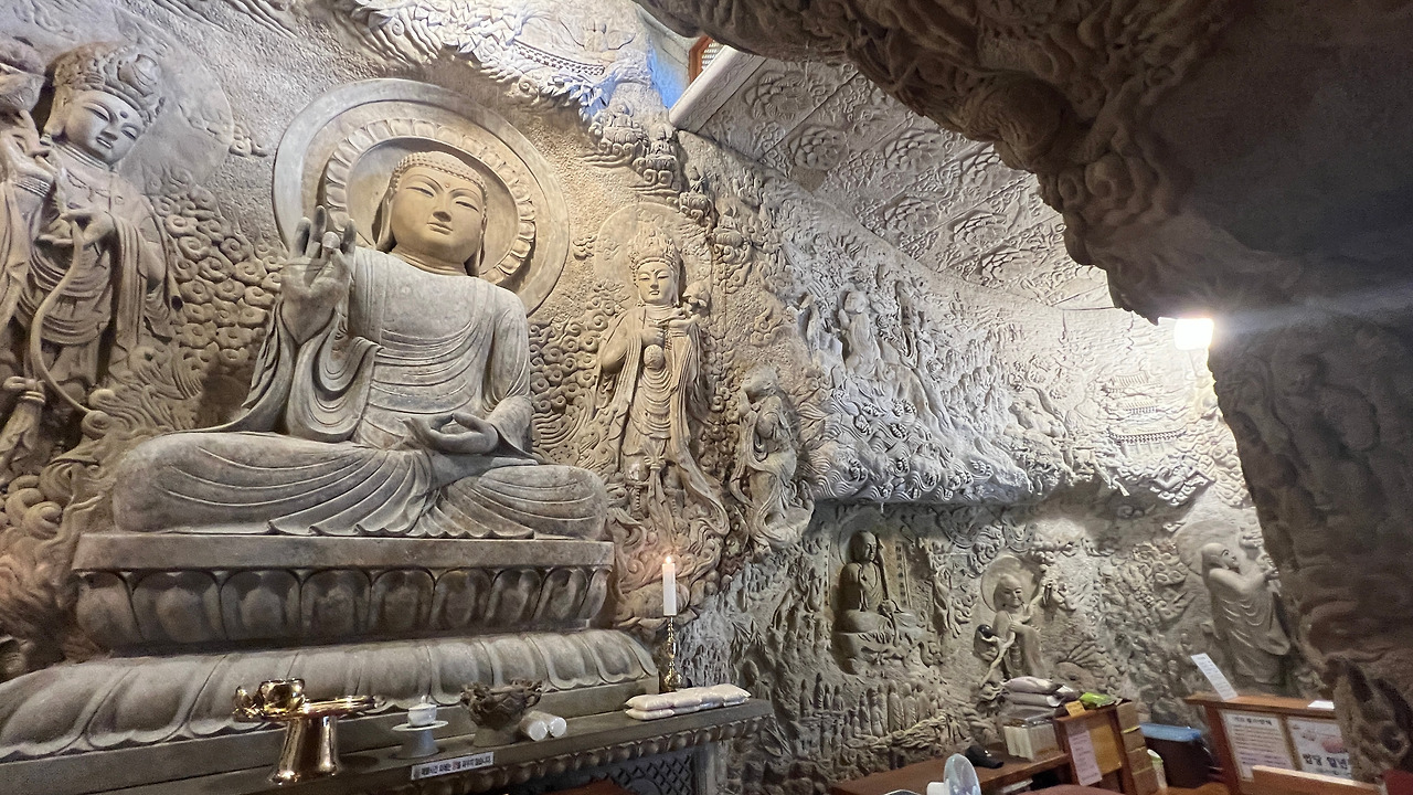 석굴법당 내부는 촬영금지인데 입구에 앉아계시는 보살님의 허락으로 사진촬영 허락을 받았다. 다른 사람들이 나오면 안된다고 하시며.....조심히 찍으라 하셨다. 사진은 여행기에 사용한다고 말씀을 드렸다.