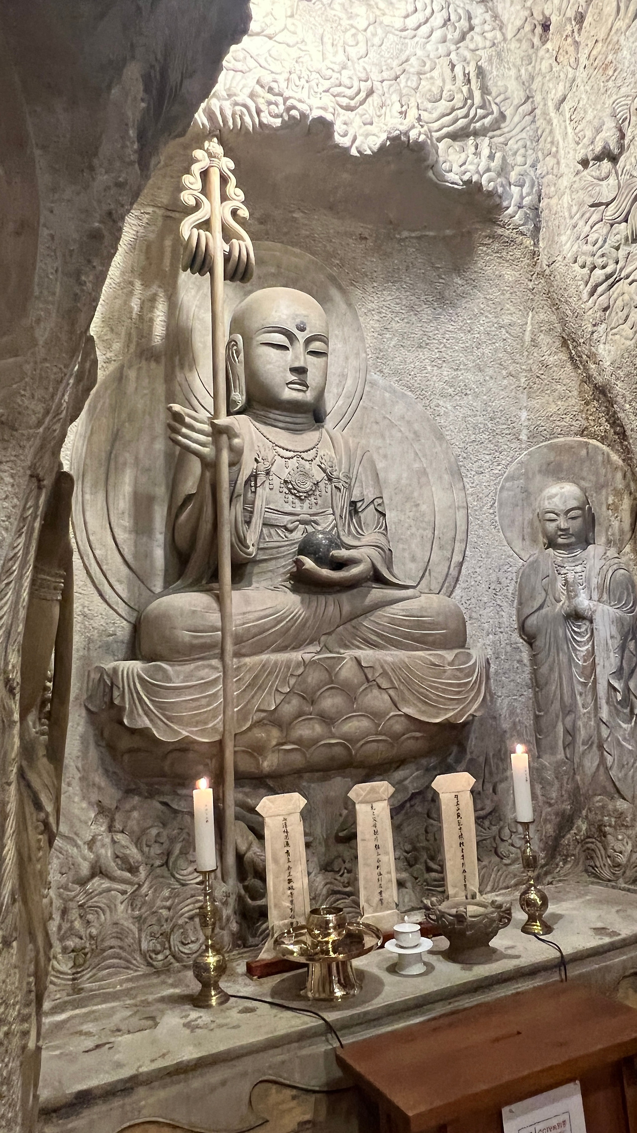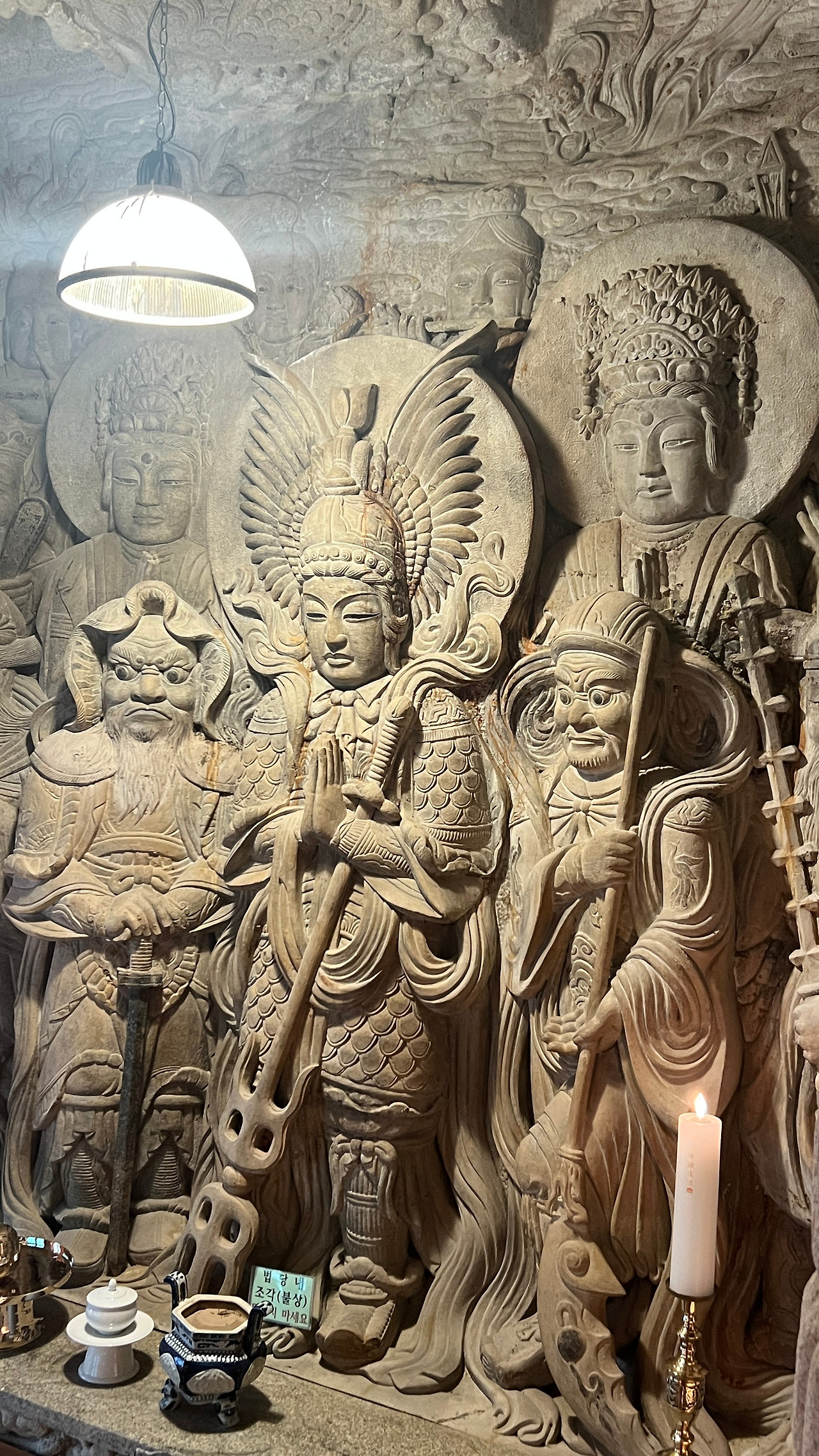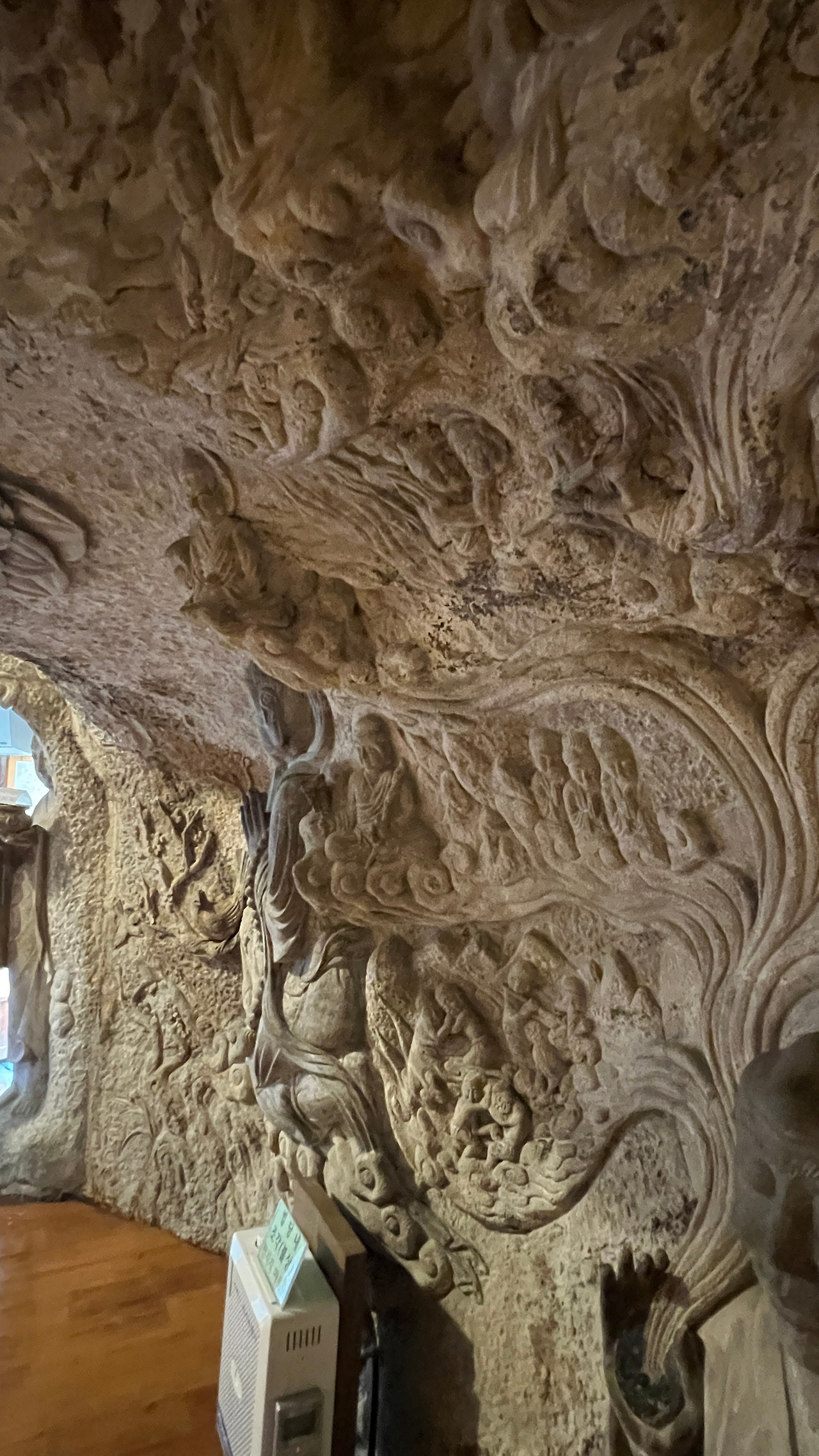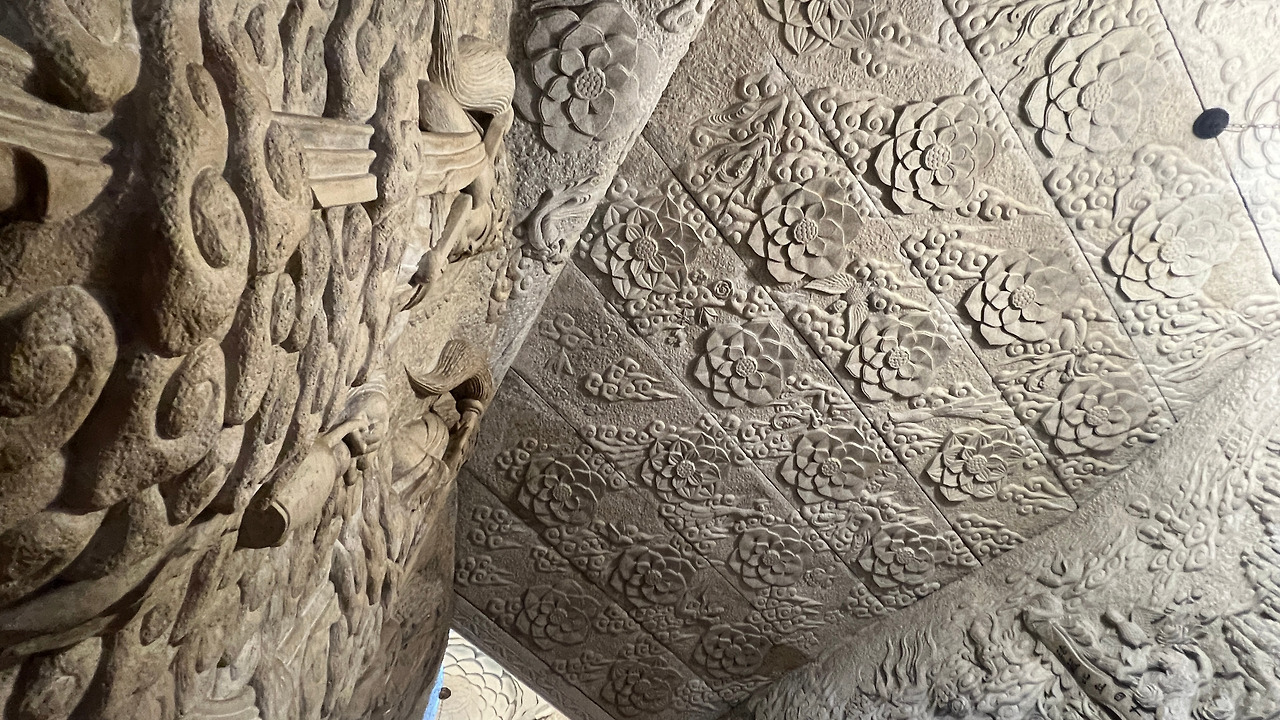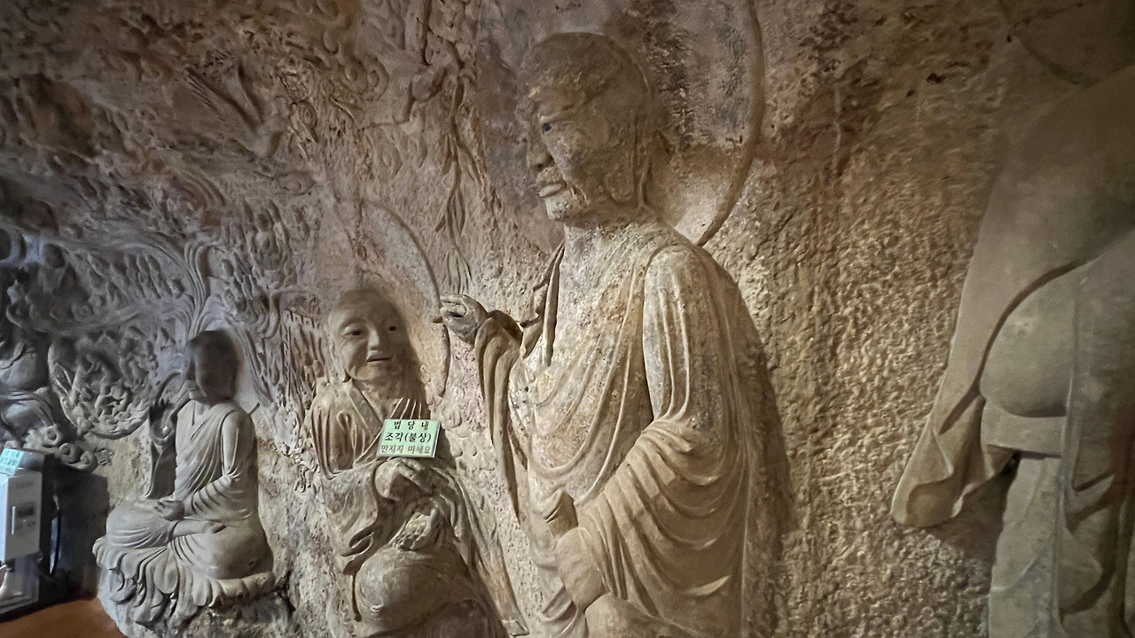 석굴 안으로 들어서는 순간, 나도 모르게 숨을 멈췄다. 석굴법당 내부는 정말 엄청났다. 바위를 직접 조각해 만든 구조로, 인공이 아닌 자연석 자체를 깎아기며 구현했다. 한 점의 조각이 아닌, 바위 전체를 법당으로 변모시켰다. 내부 벽면 전체에 아미타불, 관세음보살, 지장보살, 문수보살 등 수많은 불보살상 등이 양각으로 촘촘히 그리고 빼곡하게 조각되어 있었다. 이 모든 조각이 한 장인이 만들었다는 것이 믿어지지 않는 정교함이다.