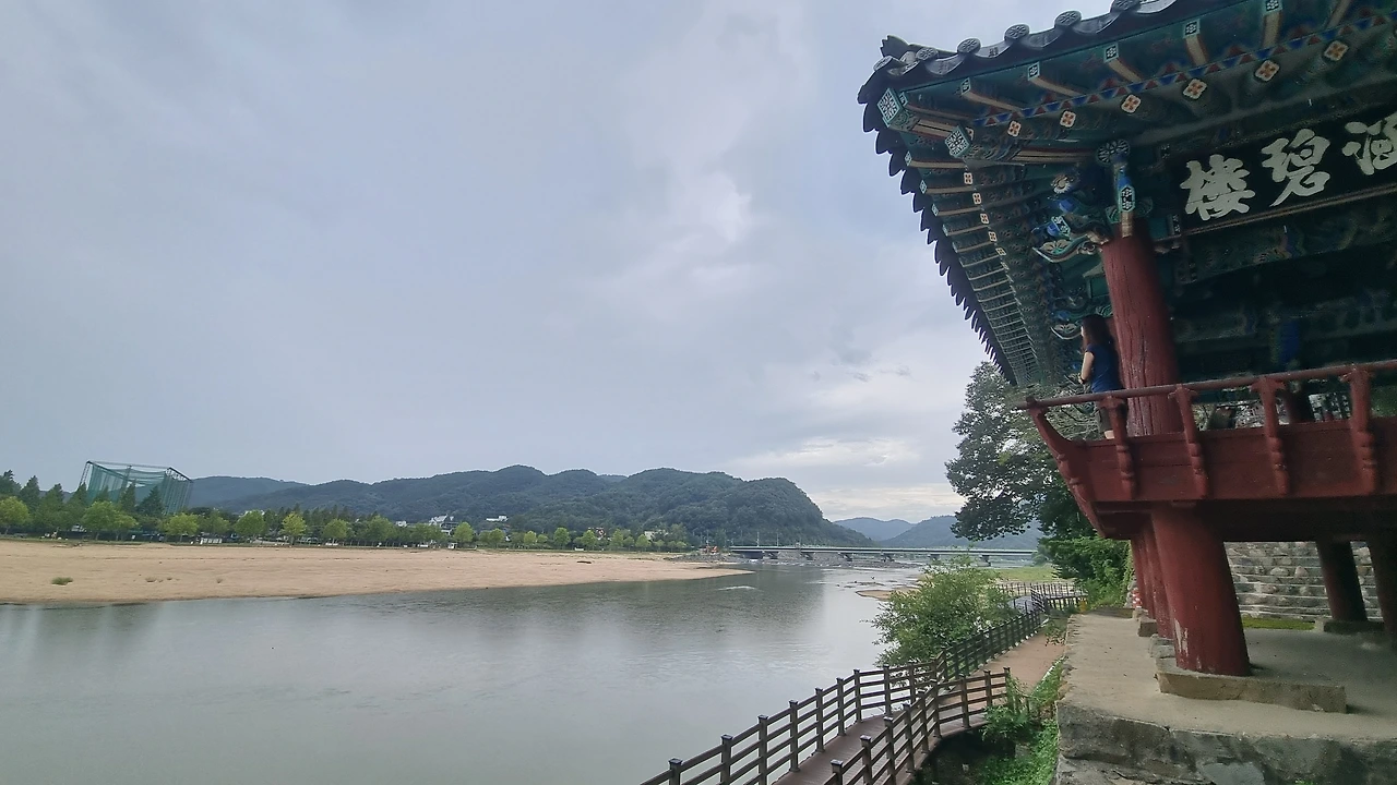 앞면 3칸, 옆면 2칸 규모로 누각 처마의 물이 황강으로 떨어지도록 배치되었다고 한다. 가파른 벼랑에 지어져 있는 함벽루는 마치 강 위에 떠 있는 듯한 착각을 불러일으키기도 한다. 특히 강물이 불어날 때면 누각 아래까지 물이 차오르면서 정말로 물 위의 누각이 되기도 한다는데, 내가 여행했을 당시는 황강의 물이 많이 줄어서 그런 느낌은 전혀 받을 수 없었다. 그저 고요하기만 했다. 정말 물멍을 하기에 최적의 장소라는 느낌이 든다.