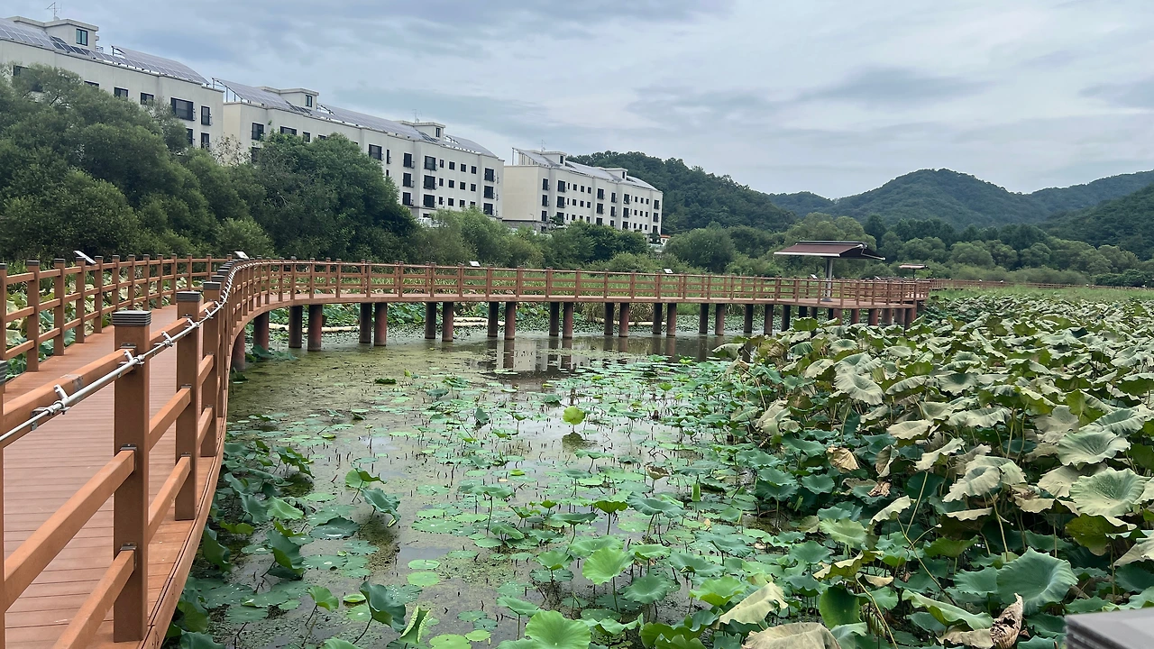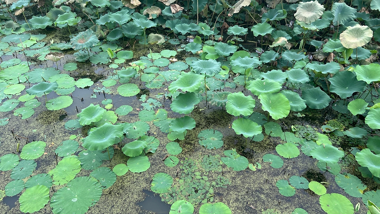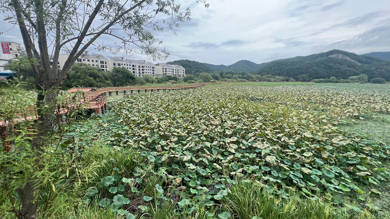 연꽃이 만발하는 계절은 이미 지났지만 잎사귀들은 무성하여 습지를 뒤덮고 있었다.