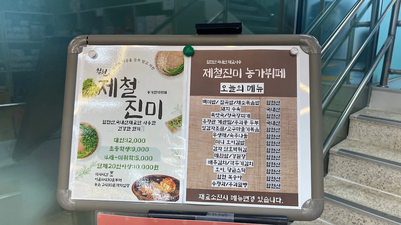 반복해서 쏟아붓는 폭우로 관람을 강제종료하고 출구로 나가는데 출구쪽에서 카페와 음식점을 발견했다. 이미 점심을 먹어서 먹어보지는 못했으나 제철진미라는 이름으로 농가부페를 운영하고 있다. 합천산 국내산 재료로 만든 한식 부페인데 무척 깨끗하고 맛있어 보였다. 성인 12000원으로 가격도 좋다.