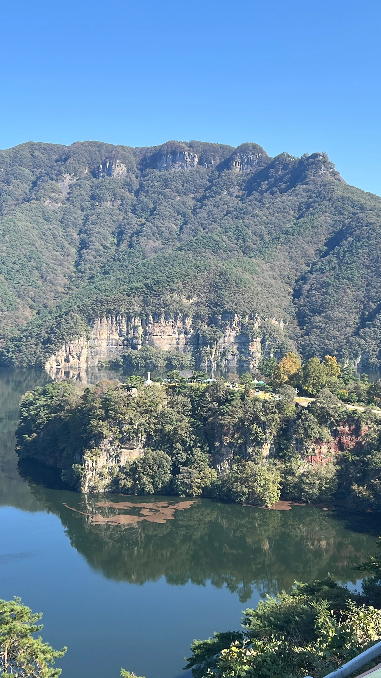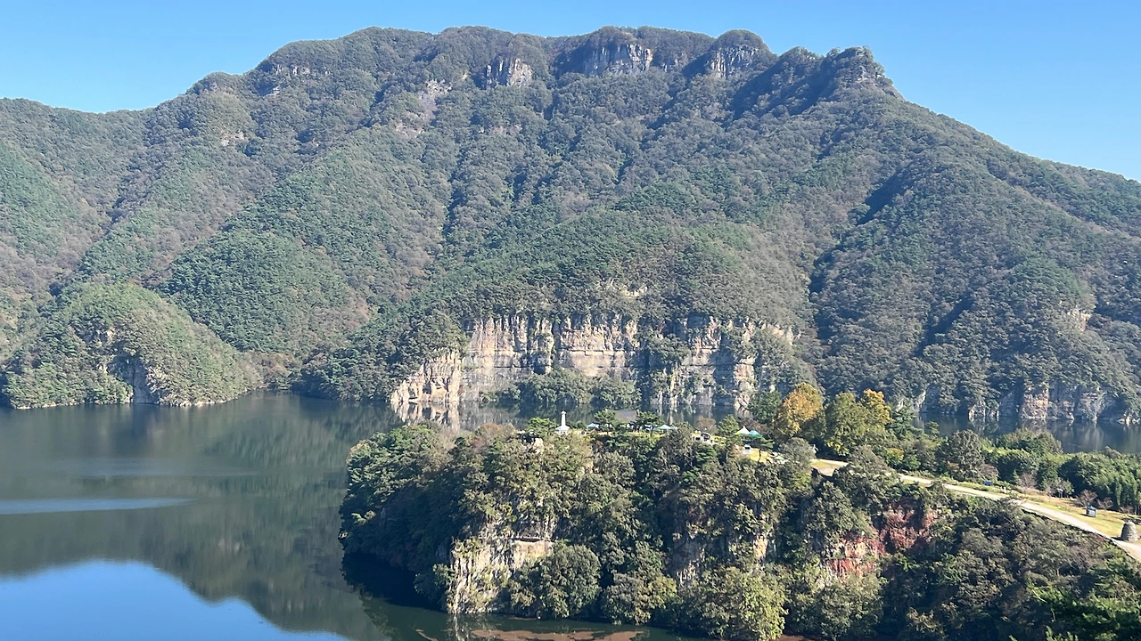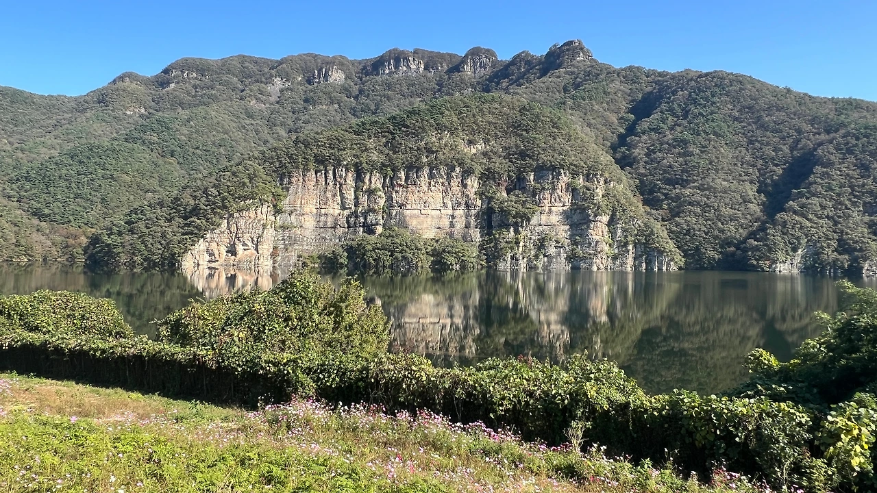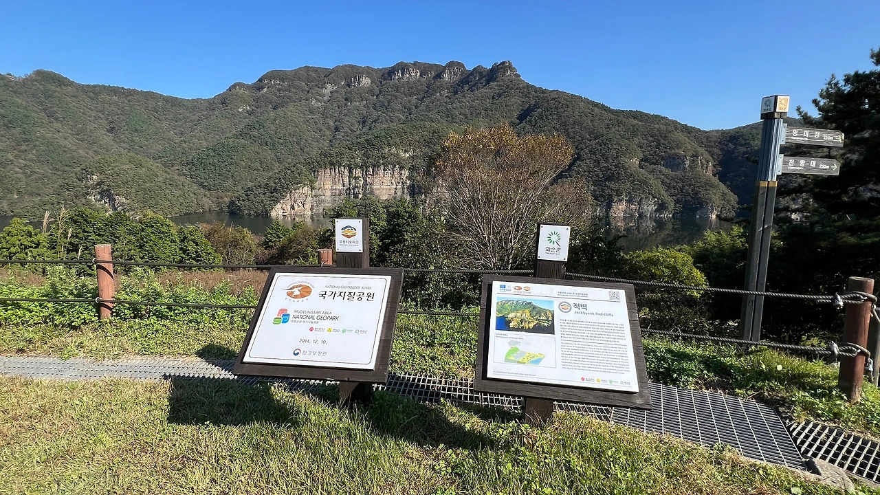진짜 물위에 적벽의 모습이 그대로 비춰 마치 벽이 물속까지 이어지는 듯 느껴진다. 적벽 뒤로는 옹성산이 자리잡고 있는데 옹성산(甕城山)’이라는 이름은 큰 항아리(옹·甕)처럼 생긴 바위가 산 정상 주변에 여러 개 있어 붙여진 이름이라고 한다. 진짜 자세히 보니 항아리를 뒤집어 놓은 듯한 모습이 신기하다.
