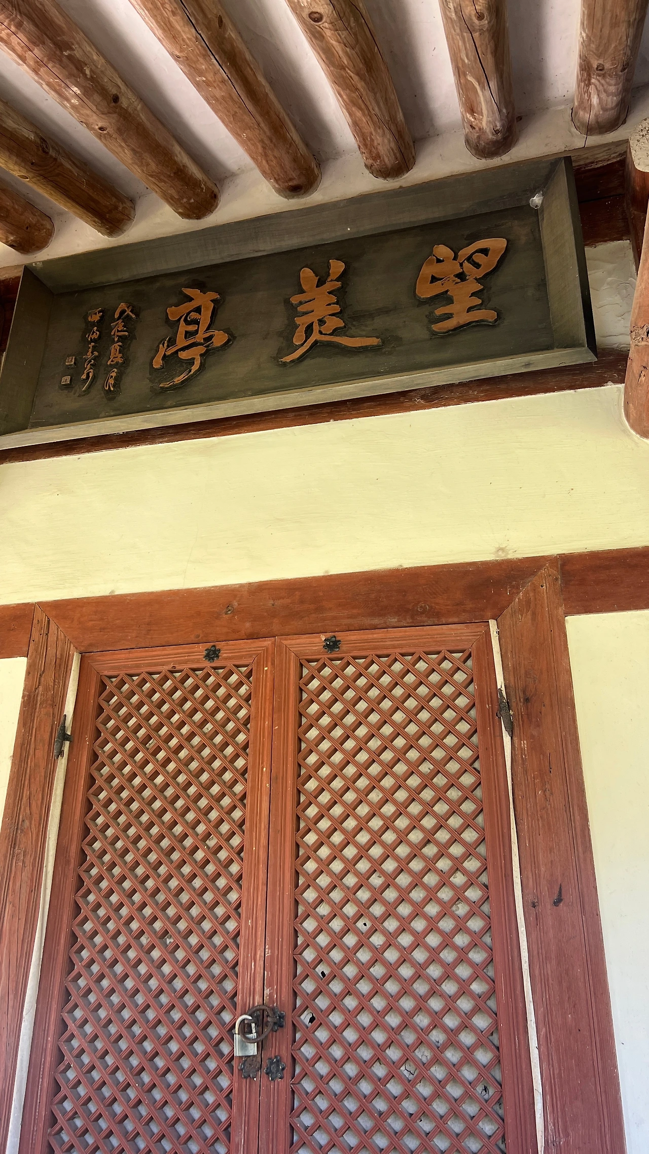 망미정은 정면에 있는 현판은 예부터 전해져 온 것이나 측면에 현판이 하나 더 있었는데 이것은 김대중 전 대통령님이 쓰신 것이라고 한다. 서예를 엄청 잘 쓰셨나보다. 이 현판은 인기가 많아 사람들이 사진 찍느라고 바쁘다. 이제 노루목 적벽을 정말 코 앞에서 볼 수 있는 시간이다. 망미정 앞 너른 풀밭을 가로지르면 노루목 적벽이 바로 눈 앞이다.