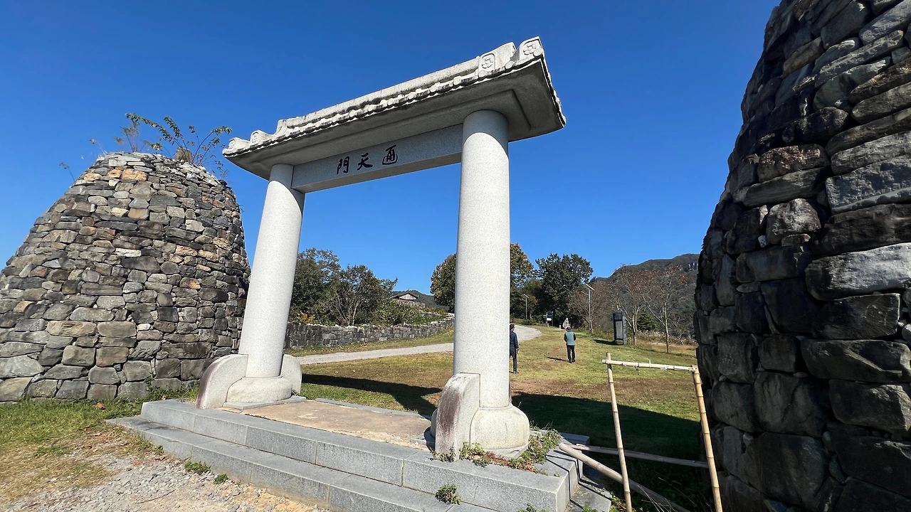 노루목 적벽을 떠나 잠시 버스로 이동하면 통천문이 나온다. 통천문 인근에는 더위에 대비해 양산을 빌려주는 곳이 있었다. 당연히 무료고 색상이 다양하고 예뻐서 가이드님은 거의 강제로 모두 쓰게 만드셨다. ㅎㅎ