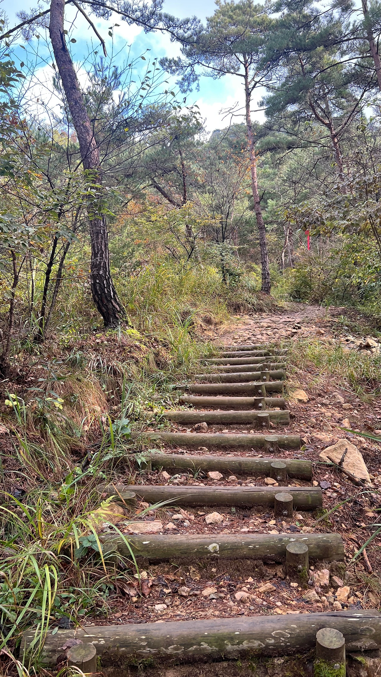 나무가 많아 하늘이 잘 보이지 않을 정도로 숲이 우거졌다. 가다보면 이렇게 나무 의자가 마련된 곳이 많은데...힘드니 쉬어가라는 의미일거다. 올라가는 내내 가파르다. 등산객에 대한 배려가 아주 좋은 산이다.