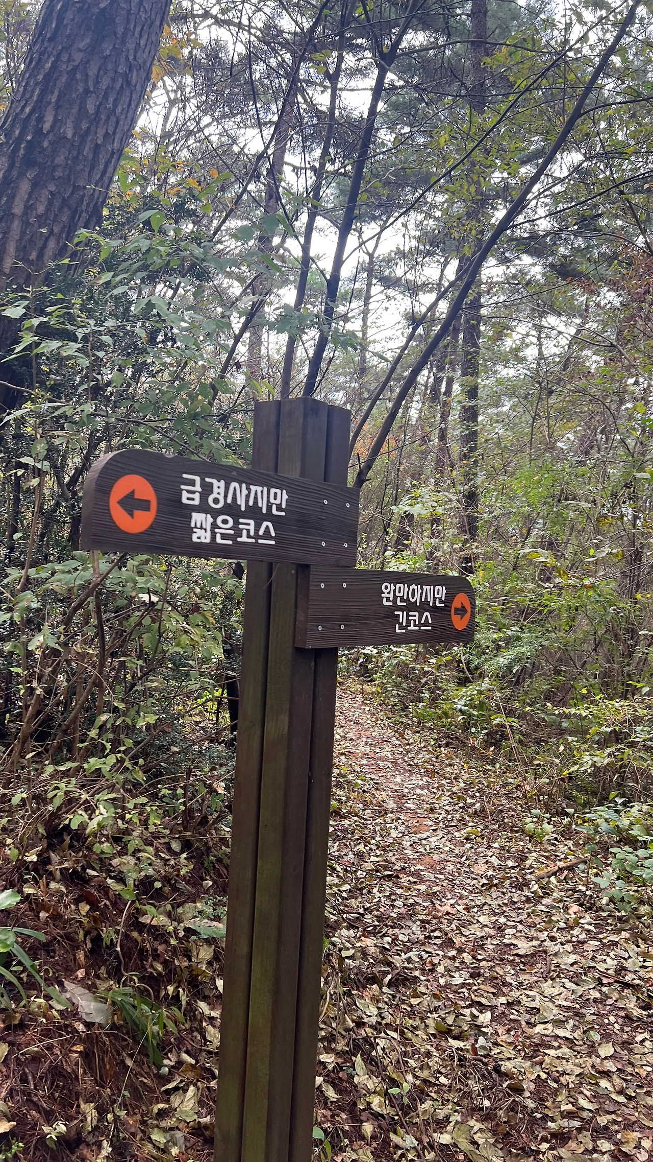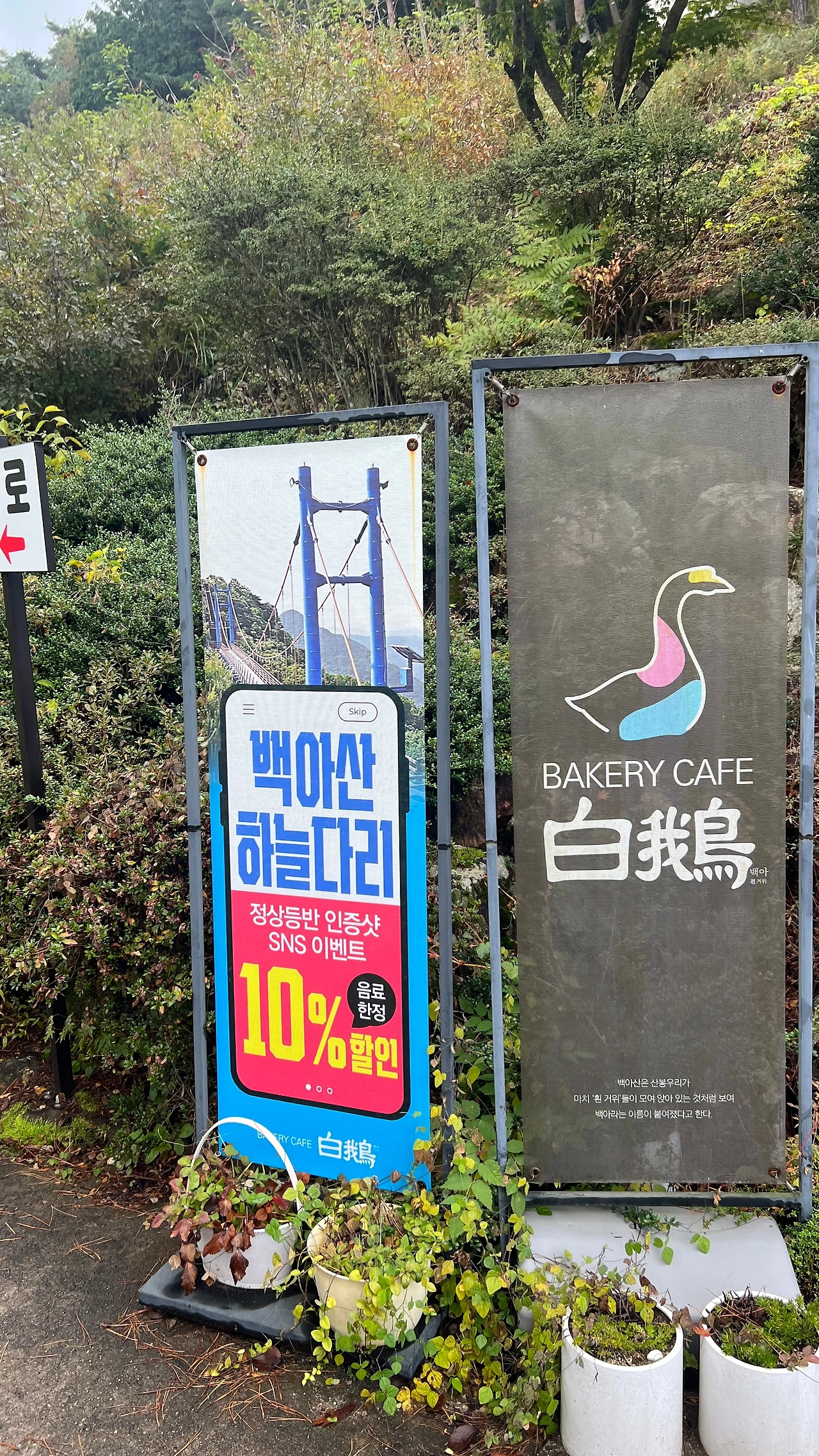 백아카페에서 하늘다리까지는 2km 정도이지만 거의 계단과 가파른 경사길로 이루어져 있다. 산책을 한다는 마음으로 나서면 살짝 당황할 수도 있다. 조금 가다 보니 갈림길이 나왔다. 급경사지만 짧은 코스와 완만하지만 긴코스. 당신의 선택은? 내가 본 모든 사람들은 급경사지만 짧은 코스를 택했다. 나도 역시 마찬가지고~~ㅎㅎ