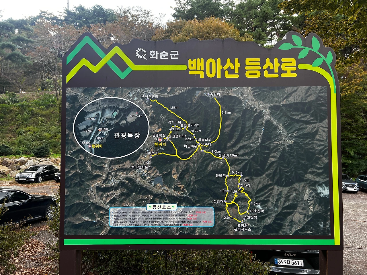 백아산 하늘다리로 가기 위해선 백아산관광목장(백아카페) 주차장에 차를 세워야 한다. 무료주차장이고 그래도 생각보다 주차공간은 넓었다. 등산로 입구의 이정표를 확인하니 하늘다리까지는 약 1시간 정도 소요된다. 시간이 많지 않았기 때문에 백아산관광목장(백아카페)에서 출발을 해서 하늘다리까지 오르고 다시 내려오는 원점회귀 코스를 선택했다. 왕복 2시간이면 충분하다. 만약에 하늘다리에서 정상을 향해 간다면 올라왔던 길로 내려오지 않고 다른 길로 원점회귀를 할 수도 있었다.