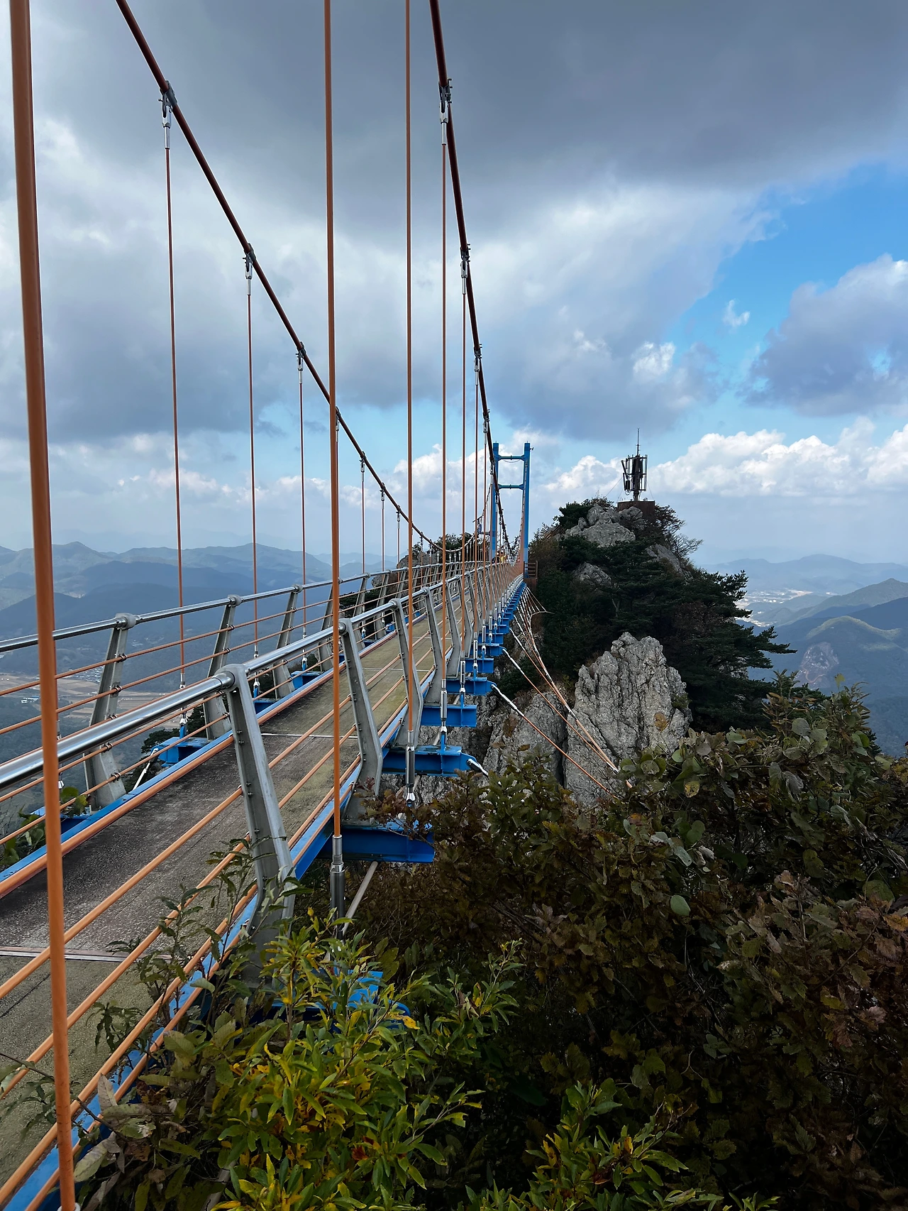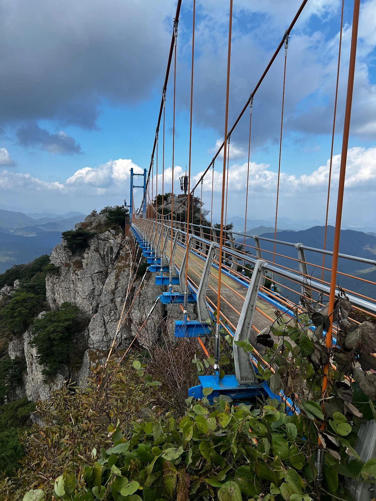 그리고 드디어 모습을 드러낸 하늘다리. 아래에서 봤을때 아주 작게 보였는데 막상 올라와보니 무지 탄탄하고 강인해보이는 모습이랄까. 진짜 아름답고 멋지다!! 다리를 건너다 보니 중간 중간 바닥에 강화유리로 된 부분이 있다. 내려다 보니 아찔해서 차마 밟지 못하고 피해서 간다. 안무섭다고 하기에는 조금 무섭고, 무섭다고 하기엔 무리가 있다. 심장이 좀 쫄깃해지는 정도랄까. 바람때문인지 사람때문인지 약간 흔들리기도 한다. 제발 이런 곳에서 일부러 더 흔들며 장난치는 사람 없었으면 좋겠다!