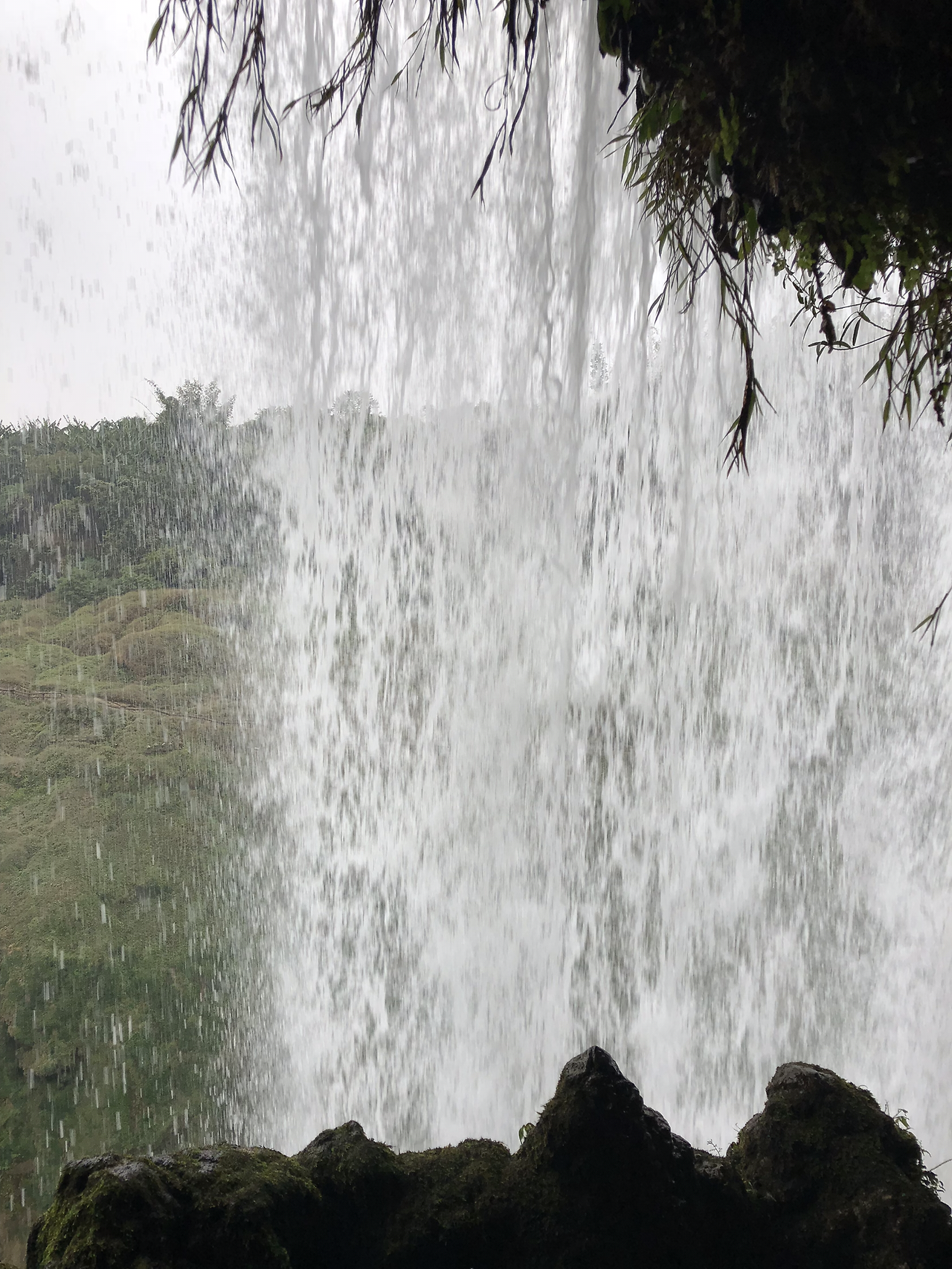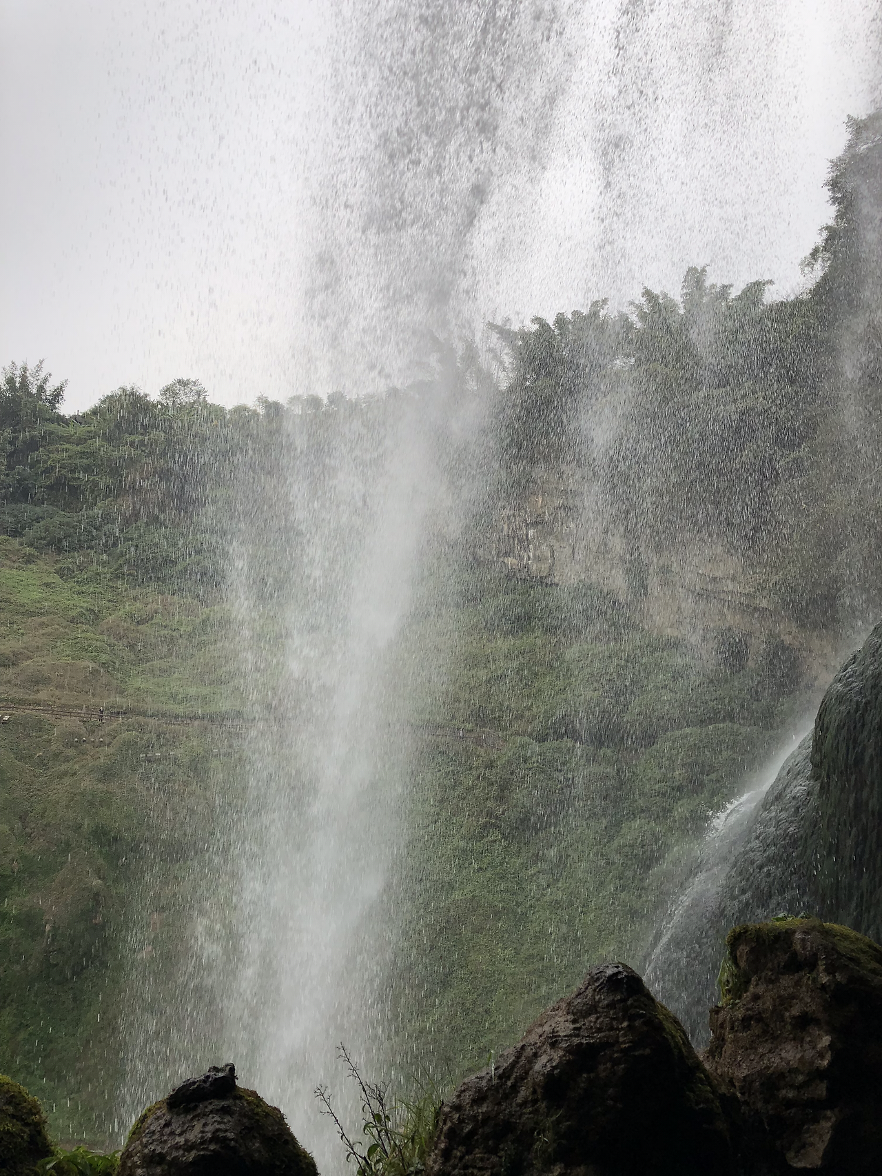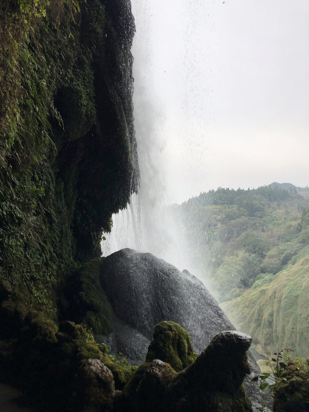 사람이 많진 않지만 폭포수가 내려 떨어지는 곳에는 사람들이 줄서서 사진을 찍으려고 기다린다. 그런데 물이 너무나 많이 튀어서 사진을 잘 찍기가 힘든 상황. 휴대폰도 물이 들어갈까봐 대충 몇장만 찍고 만다. 폭포 뒤에 있는 수렴동은 폭포 40m 지점에 형성되어 있다는데 정말 천혜의 자리가 아닌가 싶다. 황과수 폭포 가는 사람들은 여기를 꼭 가보기를 추천한다.