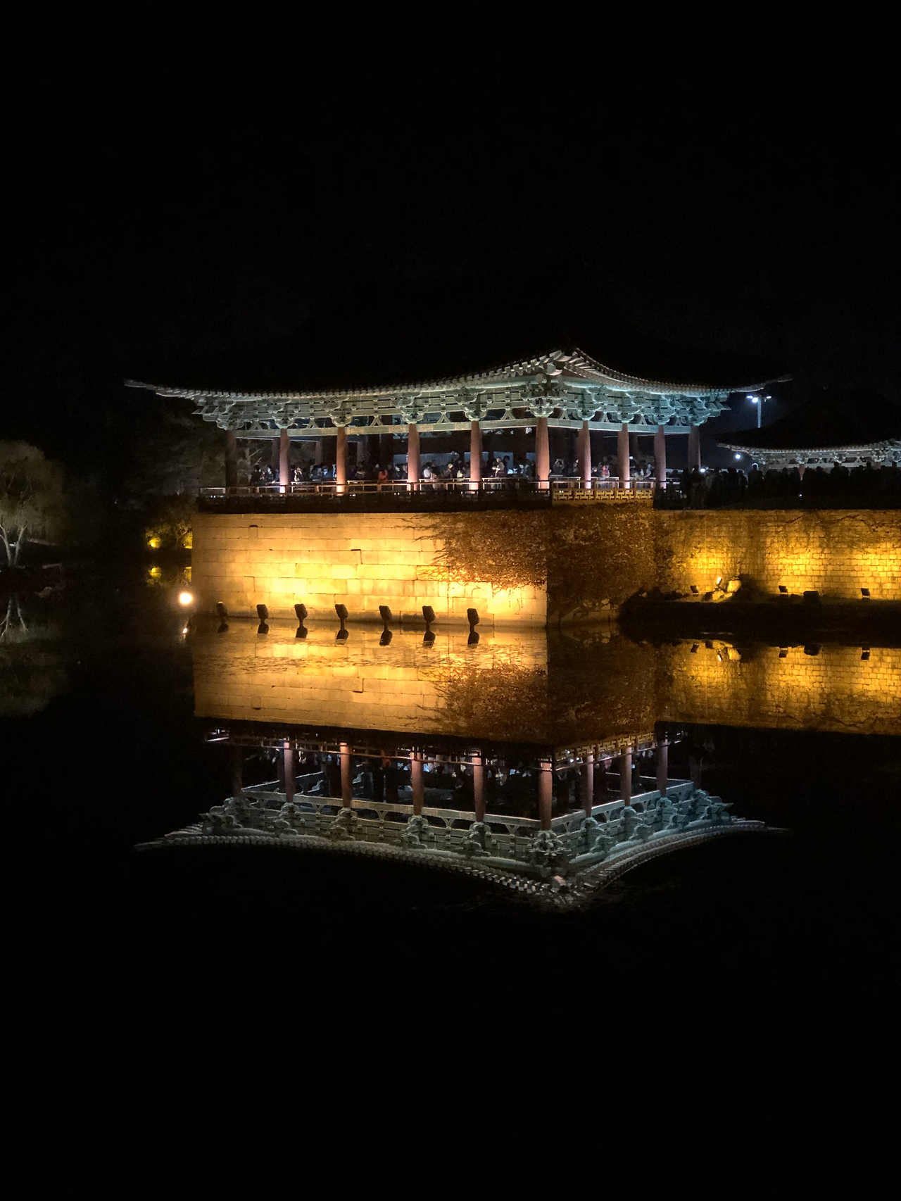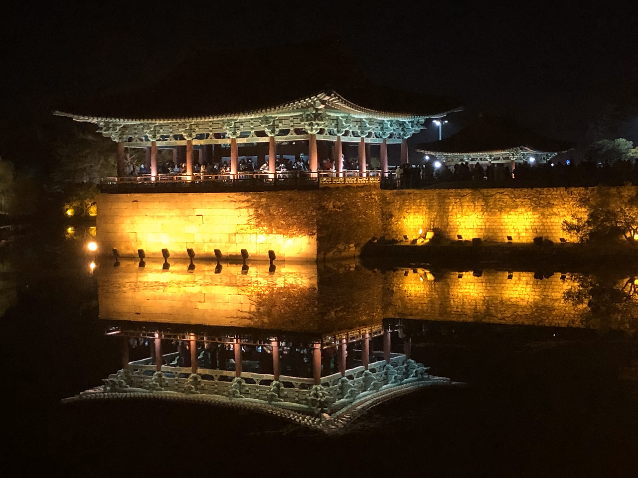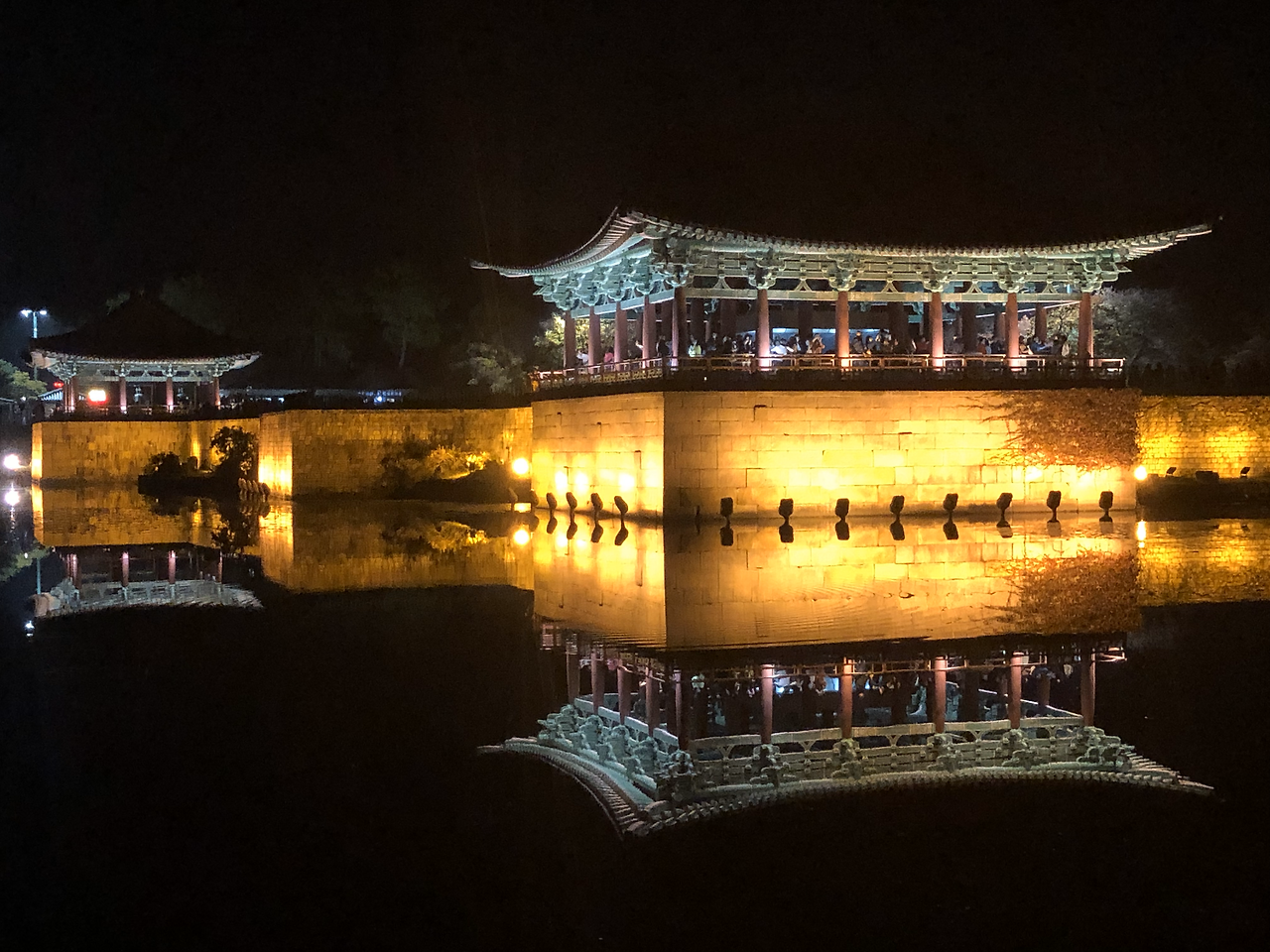 세상 어디에 이런 야경이 또 있을까 싶다. 새까만 하늘과 새까만 연못이 완벽한 대비를 이루며 그 안에 전각을 위아래로 담아버렸다. 그 밤에 만난 동궁의 모습은 고대 건축물로 늘 보아왔고 늘 예상해왔던 그 모습이 절대 아니었다. 연못을 만나서 아름다운 불빛을 입어서 판타스틱하게 다시 태어난 것. 아 이래서 사람들이 이렇게 많았구나. 시간이 지나도 줄어들지 않는 사람들로 인해 오롯이 혼자서 멋진 사진을 찍기가 쉽지 않았지만 그래도 어떻게든 멋진 사진을 건져보리라.