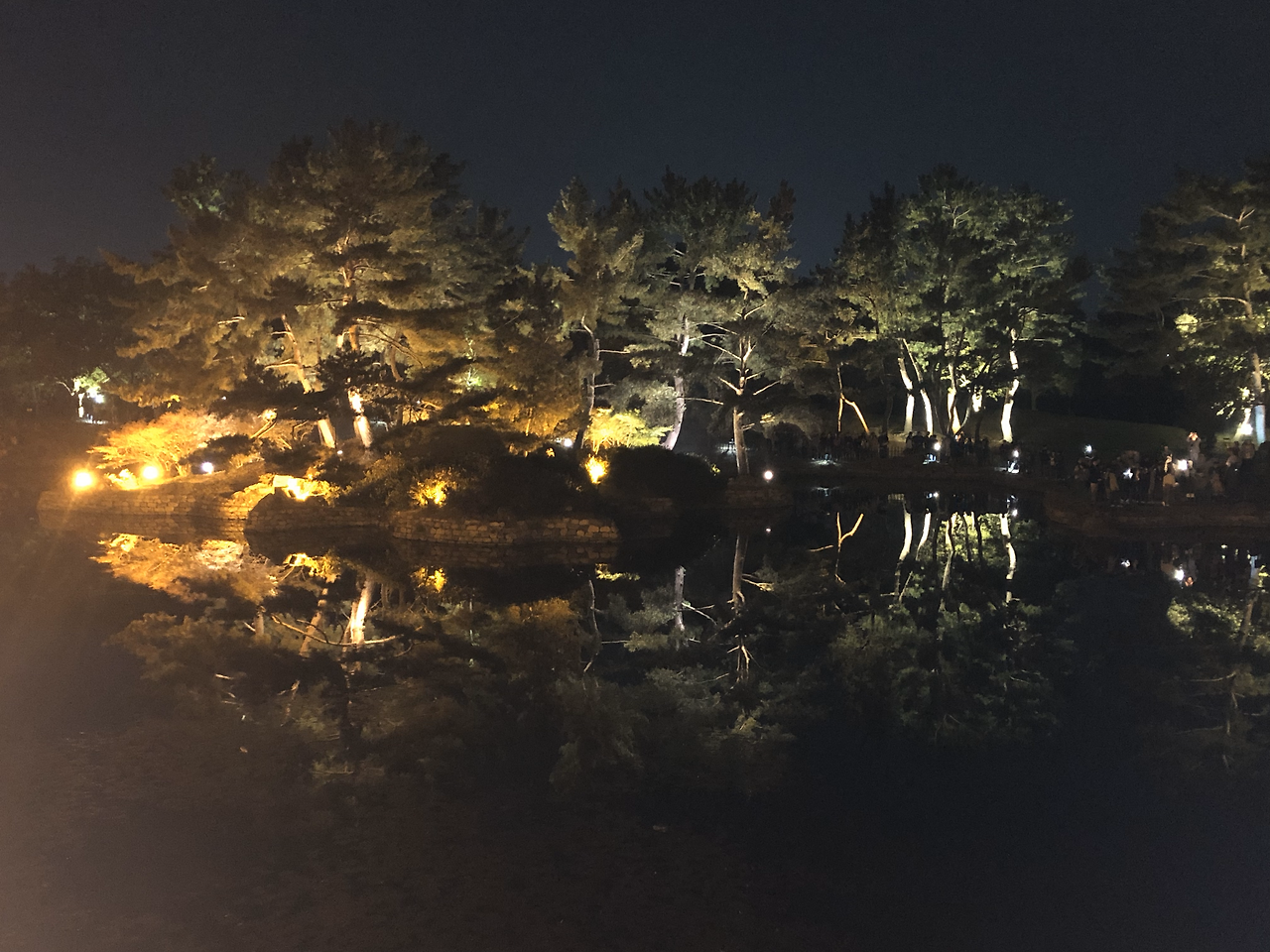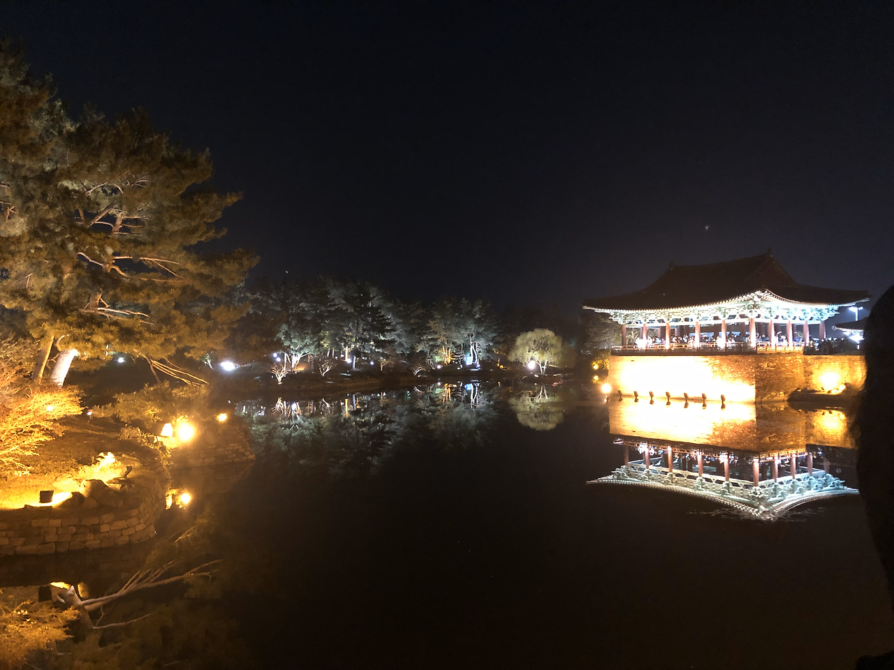 정말 판타스틱한 풍경이다. 우리나라 옛 건축물들이 이렇게 눈을 사로잡는 환상적인 아름다움을 만들어냈었나 싶다. 늘 익숙한 색감과 모습이어서 안봐도 훤히 그려지는 그런 모습이었는데 지금 이 야경은 보고 또 봐도 새롭고 신비롭고 사람들로 하여금 아름다운 몽상에 사로잡히게 하는 마력을 뽐내고 있었다. 동궁의 살짝 들어올려진 처마가 아래서부터 온 몸으로 받아들인 빛을 깜깜한 하늘 쪽으로 슬쩍 무심한 듯 끌어올린다. 이로인해 날렵하지만 과하지 않은 곡선의 미학이 살아나며 오래된 건축물에 누구도 범접치 못할 우아한 카리스마를 한껏 선사한다. 이런 야경에 서양의 건장한 석조 건축믈들은 재미가 없을것이다. 주변의 나무들도 역시 위아래로 데칼코마니를 이루고 있며 비현실적인 아름다움을 만들어내는데 일조하고 있다.