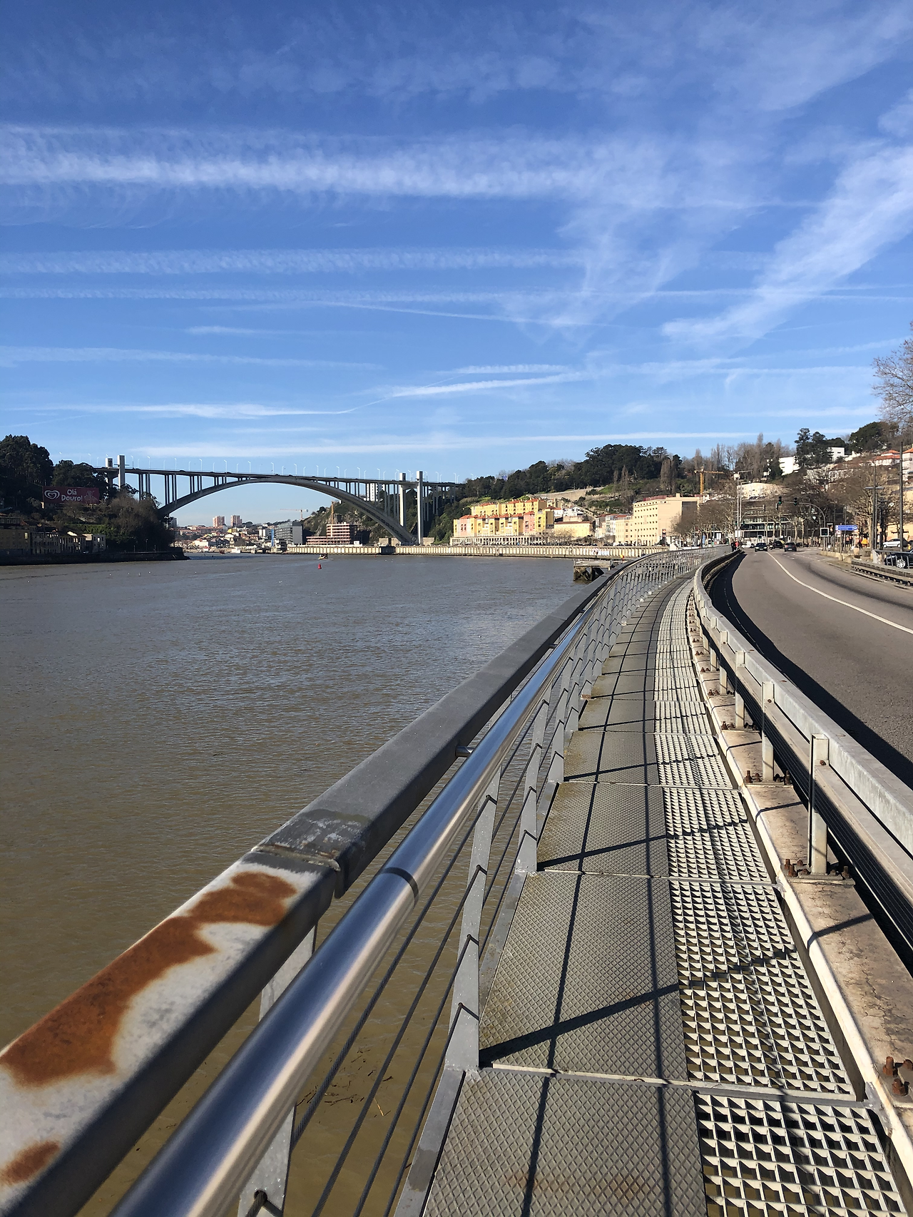 도루강에는 동 루이스 1세 다리말고도 대서양과 가까이에 있는 아라비다 다리[Ponte de Arabida]가 있다. 이 다리까지만 걸으면 어쩌면 대서양이 보일 수도 있다는 생각이 들어 부지런히 발걸음을 옮긴다. 히베이라 광장에서 도루강의 마지막 다리까지 가는 길은 초반에는 그리 좋지 못하다. 강변으로 걷기 좋게 길이 이어진 것이 아니라 오르락 내리락 안쪽으로 들어왔다 나갔다를 해야한다. 그러다 어느 시점이 되면 누가봐도 '제발 강변을 걸어주세요!'라고 애원하듯 이쁘게 만들어진 강변길을 만나게 된다. 그런데 이 길은 사실 강변길이라기보다는 '강위의 길'이라 할 수 있다. 강물 위에 놓여져 있고 심지어 길의 반쪽은 아래로 강물이 보이기까지 한다. 계속 걷다보면 살짝 쫄리는 느낌이 든다. 핸드폰이라도 떨어지는 날에는....사진을 찍을 때 조심조심해야한다.