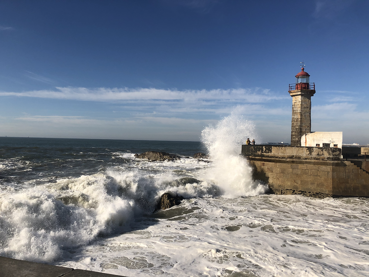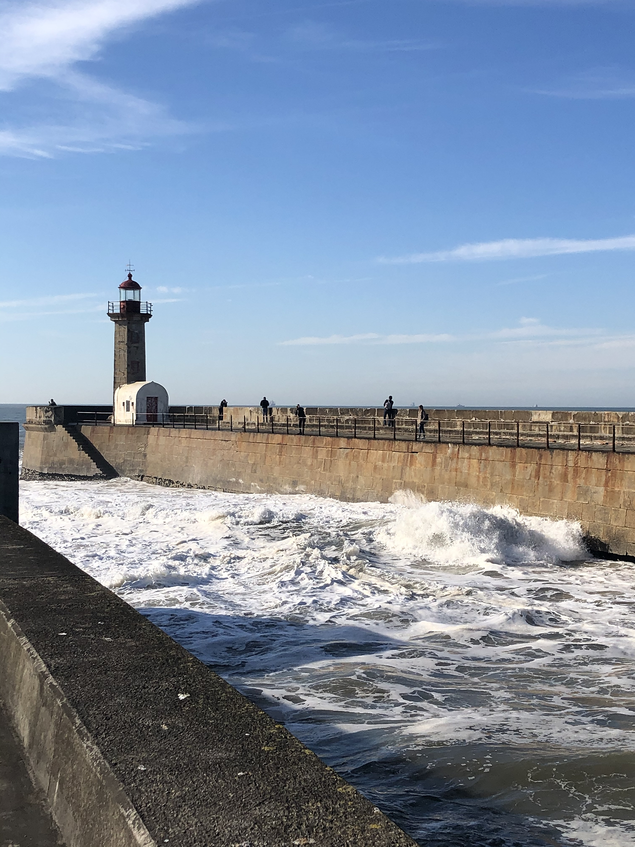 방파제 길을 따라가다 보면 오른쪽으로 등대가 보인다. 구글맵에는 Felgueiras Lighthouse라고 이름이 나와 있다. 하지만 내가 걸어가는 이 길은 이 등대를 지나 더더 깊숙이 대서양으로 들어간다. 놀라운 것은 중간에 파도가 치는데 정말 사람키를 몇 배나 넘어서는 파도가 방파제에 부딫쳐 새하얗게 산산이 부서진다는 것이다. 그런 파도가 지나가면 바닷물이 사람들이 다니는 길에 들어오게 되고 그 물을 생명수 삼아 이끼들이 낀다. 그래서 바닥이 매우매우 미끄럽다. 정말 조심해야한다.