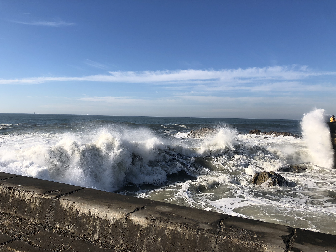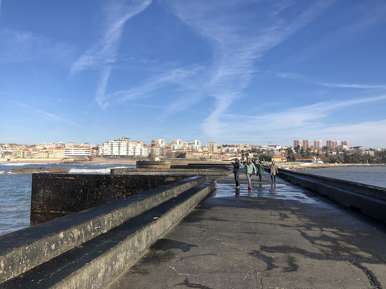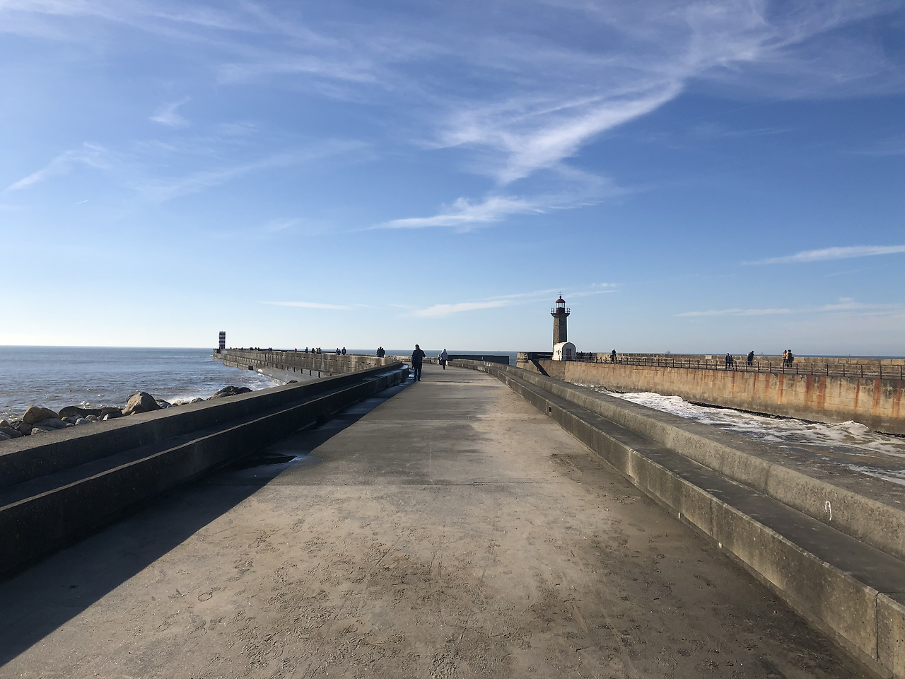 걷다가 뒤를 돌아보면 포즈 두 도루 지역이 아주 멀리 보인다. 마치 내가 대서양 바다 한복판에 있는 느낌이 들었다. 우와!! 대서양쪽으로 뻗어나온 길이가 상당하다 정말. 펠게이라 등대를 지나 훨씬 깊숙이 들어간다. 파도가 세차게 치는 구간을 지나면 마른 길이 나오며 드디어 끝에 도달한다. 대서양의 진정한 땅끝. 이곳의 이름은 Farolins da Barra Douro이며 구글 평점이 4.7이다. 배의 안전운행을 유도하는 무선 송신소 및 등대의 역할을 하는 곳. 이상하게 끝까지 오면 오히려 파도가 잔잔하고 진짜 광활한 대서양이 사방으로 펼쳐진다. 수평선 끝에 배가 하나 걸려 있는데 오는 건지, 가는 건지 분간이 안갔다. 너무 멀어서겠지. 진짜 그 끝에 걸린 배가 꼭 조금 있으면 고꾸라지듯 앞쪽으로 떨어질것만 같은 느낌이다. 시원하고 광활하고 멋지고 유니크하지만 성난 파도가 나를 덮칠것 같은 두려움이 실제로 살짝 느껴지기도 하는 곳. 정말 멋진 곳이라 구글평점 이상을 주고 싶다.