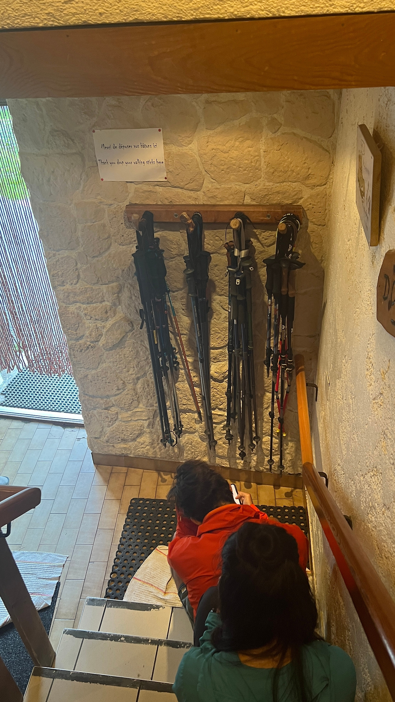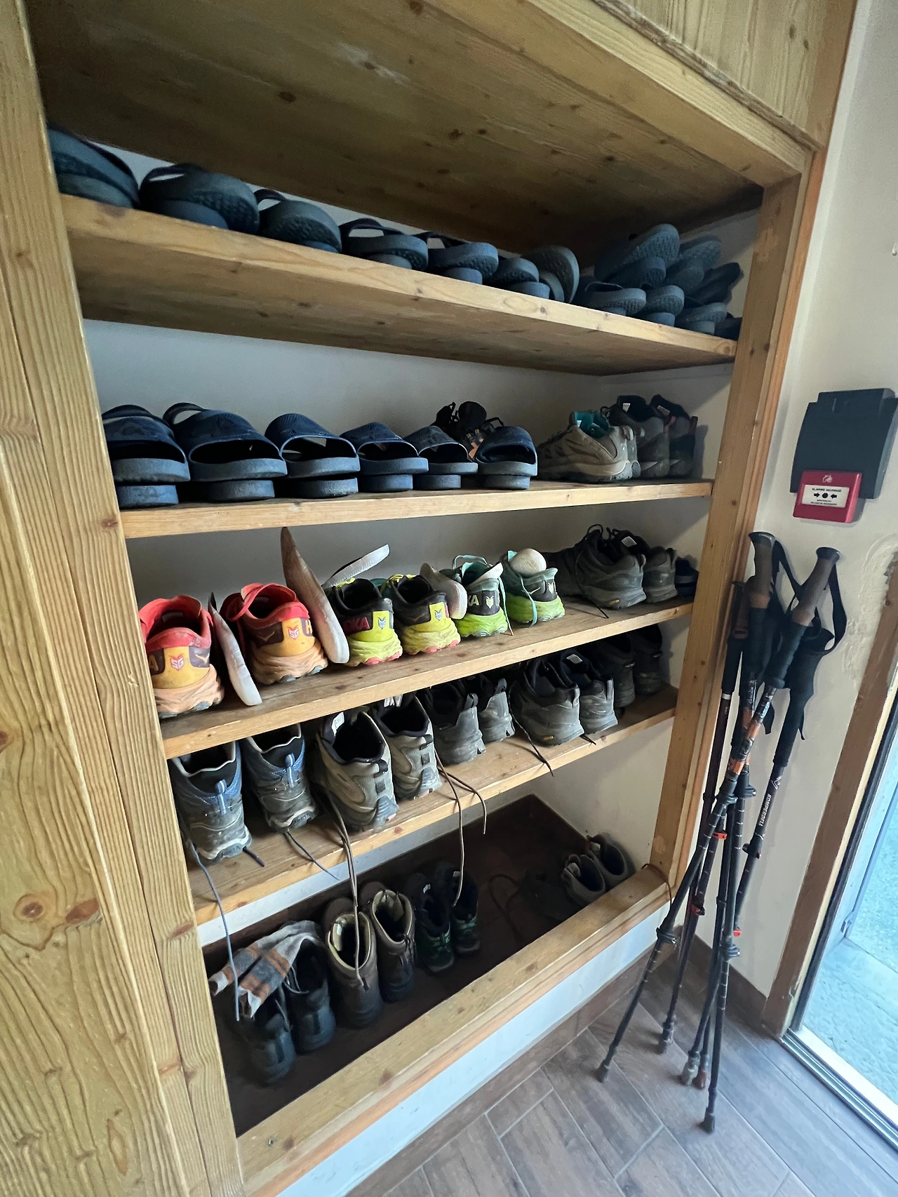 내 경우는 보통 아침 8시쯤 시작해서 오후 2시~4시 사이에 주로 산장에 도착을 한다. 내가 묵을 산장에 도착을 하면 가장 먼저 해야 할 일은 등산화를 벗고 슬리퍼로 갈아 신는 일이다. 그리고 스틱을 지정된 장소에 걸어 두어야 한다. 이렇게 한 후 산장 건물 안에 들어 갈 수 있게 되어 있는 곳이 대부분이다. 처음에는 내 스틱 누가 가져가지 않을까 걱정되기도 했지만 13일 동안 그런 일은 일어나지 않았고 다들 귀신같이 자신의 스틱을 잘 찾아 간다.