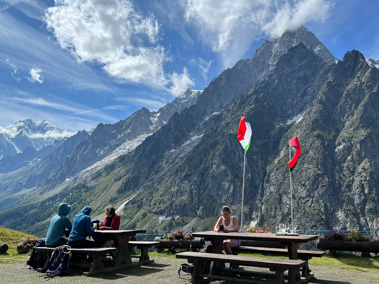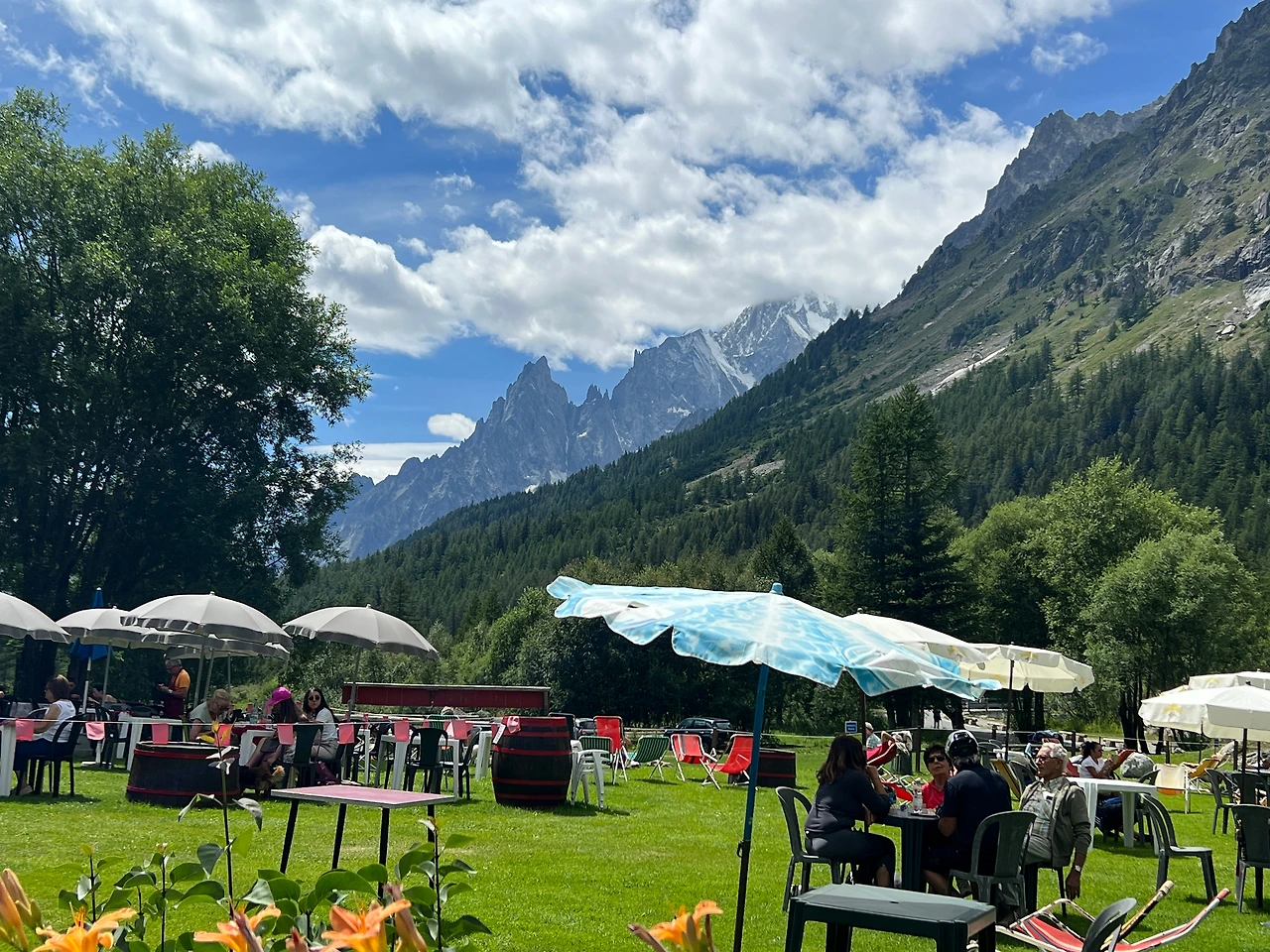 그저 멍때리며 가까이에 우뚝솟은 봉우리를 바라보거나 한 여름에도 하얗게 눈 덮인 몽블랑을 바라보며 힐링을 한다. 뼛 속까지 시원한 맥주 한 잔과 달달한 타르트 한 조각이 행복감을 배가 시킨다. 이보다 더 완벽할 수는 없다는 생각이 정말 여러번 들었다. 내년에도 다시 올까? 아니 매년 오고 싶다는 생각이 간절해지는 시간이다.