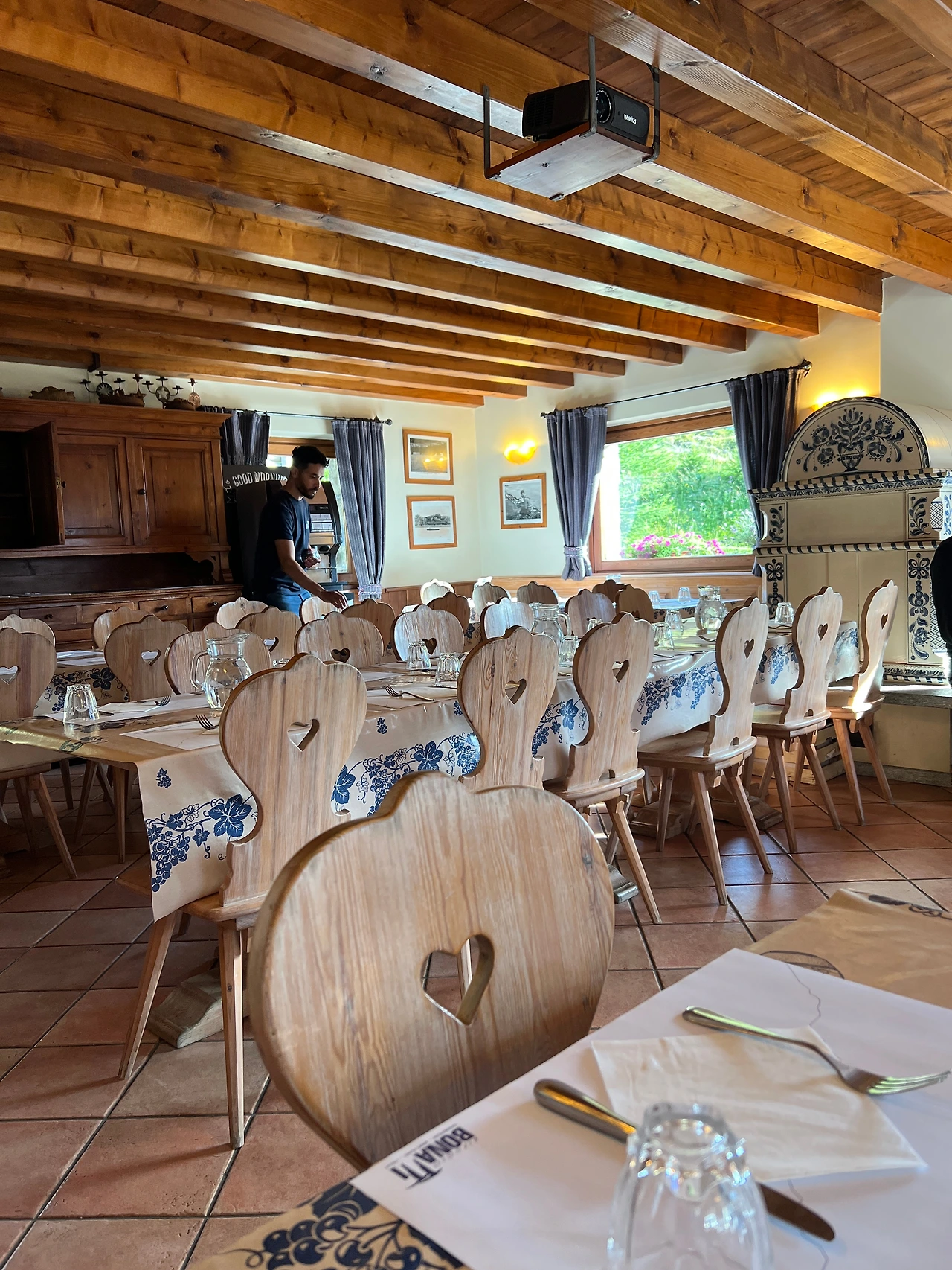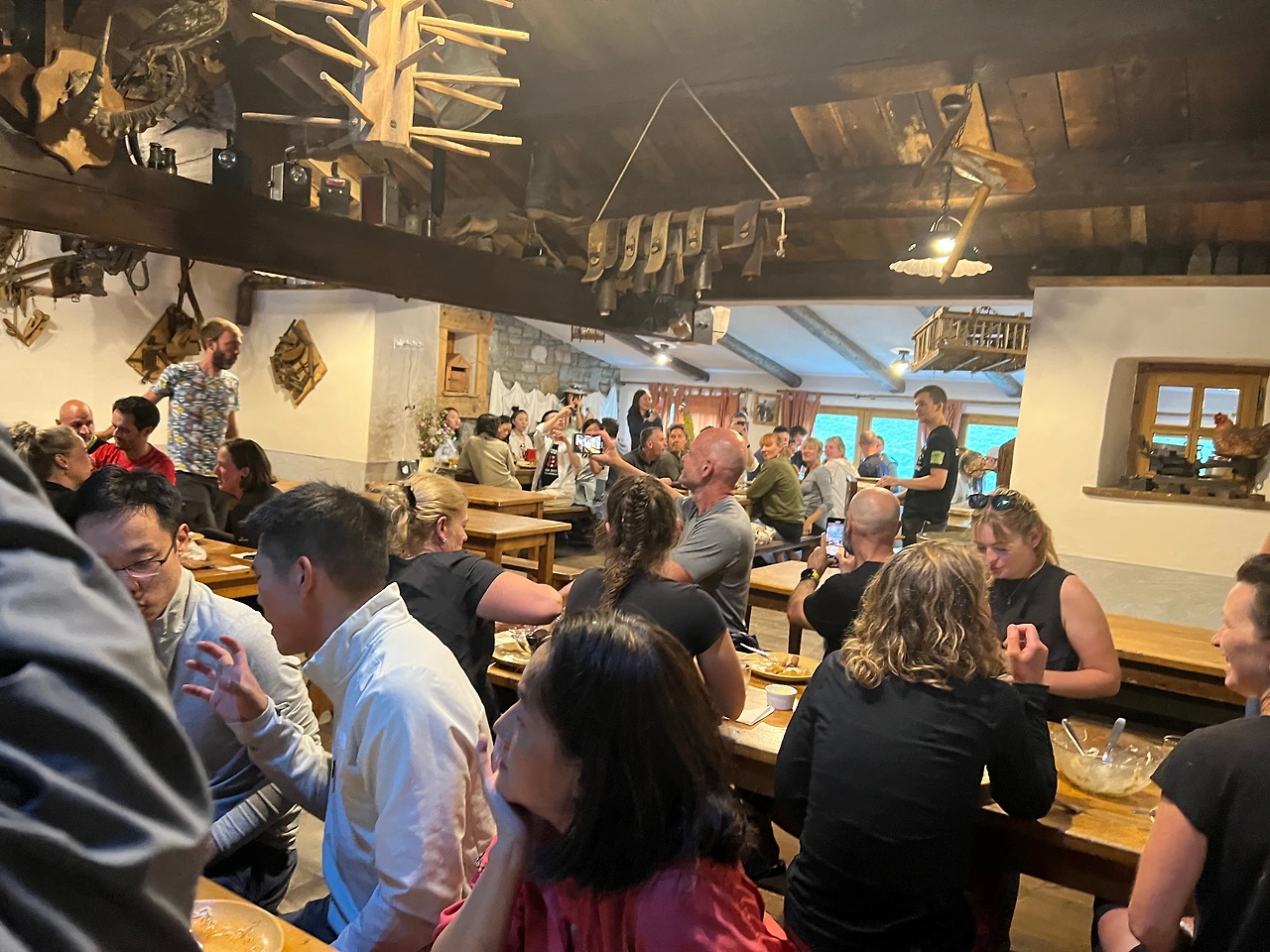 대부분의 산장은 저녁시간이 7시에 시작된다. 그러니 누구든지 이 시간 전에 산장에 도착해야 한다. 만약 늦는다면...아무리 디너까지 예약을 했더라도 먹을 수 없다고 한다. 시간이 다 되어 레스토랑에 가면 테이블에 내 이름이 적혀있다. 보통 4~6인용 테이블에 자리마다 이름표가 붙어 있다. 오늘 나랑 저녁 먹을 사람들 이름. 한 두명씩 얼굴을 내밀면 서로의 이야기 보따리가 풀린다. 순식간에 산장 안은 왁자지껄 경쾌한 소음으로 가득찬다. 참으로 절묘하다. 혼자만의 힐링 타임으로 행복감이 충만해지고 난 뒤에 찾아오는 사람들과의 교감. 어찌나 재밌고 신나는지 모른다. 대화 주제는 당연히 뚜르 드 몽블랑이다. 각자의 스토리와 그날 있었던 사건들이 첫 코스가 시작되기 전에 줄줄이 소환된다.