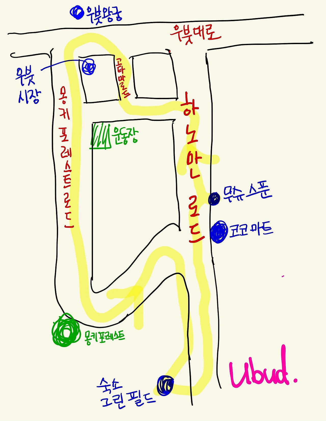 자자, 하노만 로드 중간에서 왼쪽으로 꺾었다가 다시 오른쪽으로 꺾어 고타마 로드로 갈 거야. 거기에 예쁜 것들이 많거든. 그래서 조심해야 해. 다 사고 싶어질 수도 있으니까. 무사히 고타마 로드를 통과하면 우붓 대로가 나오지. 젤라토를 먹으며 걷다 보면 우붓 왕궁과 우붓 시장이 나올 거야. 그리고 다시 몽키 포레스트 로드로 내려오자. 조금 내려오면 초록 잔디가 깔린 커다란 운동장이 나와. 처음 발리에 여행을 왔을 때 저 운동장이 보이는 카페에 앉아 생각했지. 여기서 살아보리라. 남편과 아이를 호텔에 놓고 혼자 나와서 말이야. 결국 살았고 또 떠났네. 거기 가서 추억의 커피를 한 잔 더 마실까? 아니 무슈 스푼에서 이미 마셨잖아. 그렇네! 그럼 점심 메뉴는? 당연히 나시 짬뿌르지! 어디서? 단골집에서? 거긴 좀 멀지 않나? 멀면 어때? 오토바이가 있는데! 그래 좋아! 부릉부릉 윙윙! 짬뿌르 집아, 기다려라, 아리가 간다! 부릉부릉 윙윙~ 어머, 졸린데 노래가 막 나오네. 너무 신이 나서 그런가, 아유 졸려.