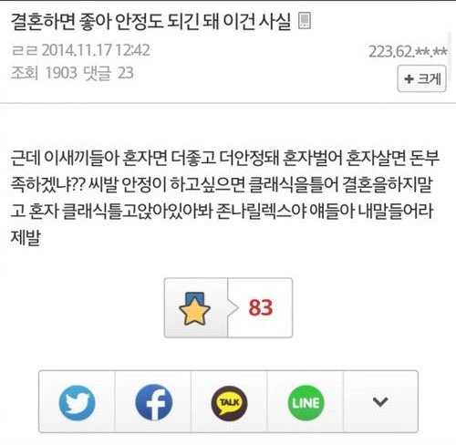 Q) 결혼하면 안정되잖아