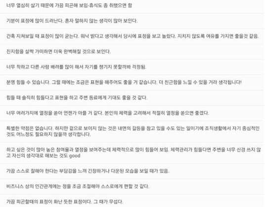 1년 만에 다시 보니까 참 묘한 감정이 드는 동시에 고마운 평가들을 뒤집어버리지 않게, 스스로를 형편없게 만들지 말자고 마음먹었다. 어떻게 보면 지금만큼 독립심을 키우기 좋은 환경도 없다고. 내가 운이 나쁘다거나 회사가 너무하다며 칭얼거리지 않으려고 부단히 노력 중이다. 그러니까 지금은 꽤 괜찮아졌다. 이 글을 쓰는 토요일 오전에도 틈틈이 일을 처리하고 있지만. 미련하게 들리겠지만 앞으로 더 힘들어지더라도 스스로를 놓아버리고 홀대하지는 말기를. 진짜로 이 곳이 혹은 일이 내게 맞지 않다고 느낄 때, 후회 없이 끝낼 수 있도록 있기를 바라며 글을 마친다.