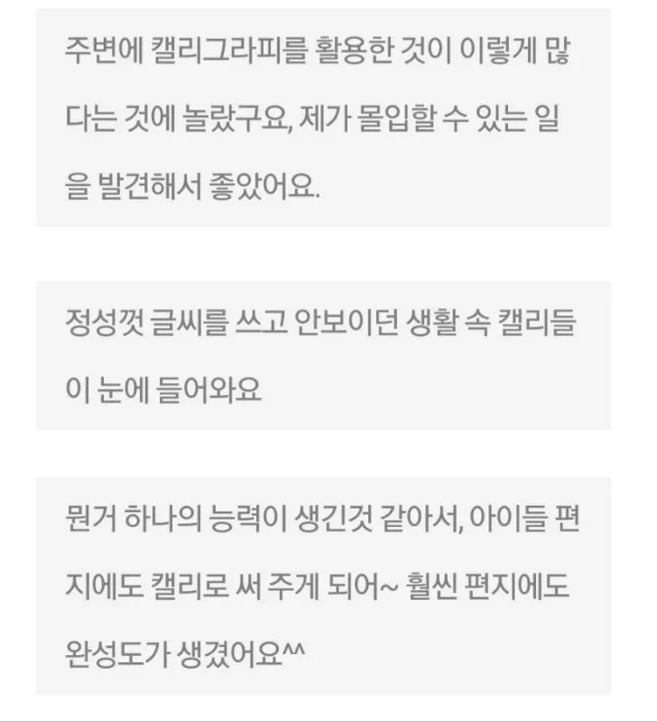 글씨를 쓰며 자존감이 생겼다는 분들, 아이들에게 캘리로 편지를 써줄 수 있어 기쁘다는 분들, 나만의 몰입하는 시간이 생겼다는분들, 그저 즐겁다는 분들. 이분들을 통해 순수했던 초심이 되살아난다. 누군가에게 글씨를 가르치겠다고 생각한건 나의 오만이었던 것이다. 우리는 함께 글씨를 쓰는 동행자이고 나는 조금 먼저 길을 나섰던 길잡이 역할을 할 뿐이다.