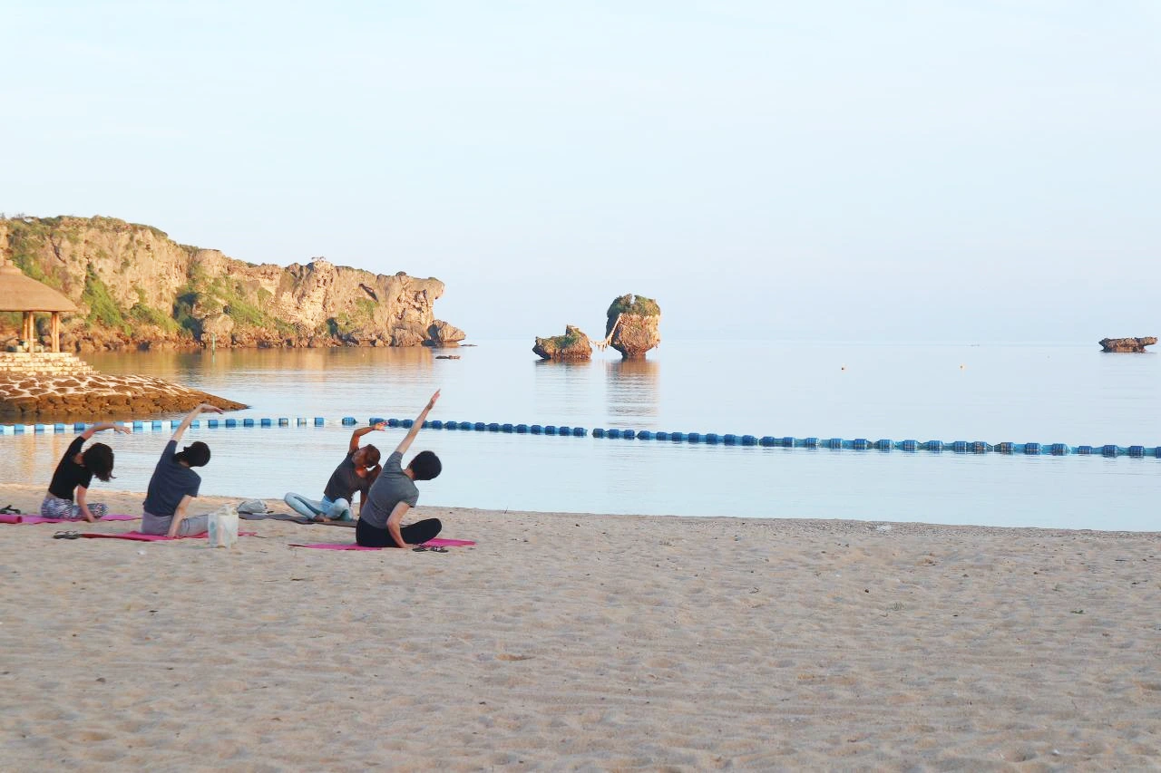 저는 오키나와 중부에 자리한 온나촌(恩納村)에 숙소를 잡아서요. 요가 수업도 차로 5분 거리인 온나 나비 비치에서 들었어요. 막 해가 떠오르는 5시 30분에 집을 나서서 집합장소인 해변 앞 주차장에 무사히 도착.