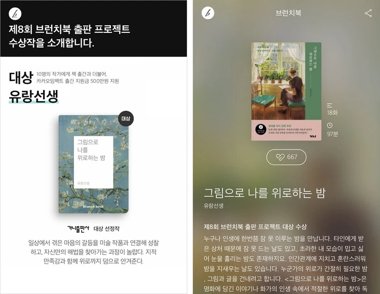 <그림으로 나를 위로하는 밤>은 감사하게도 2020년 12월 제 8회 브런치북 프로젝트 대상을 수상하면서 가나출판사에서 올해 7월 출간되었습니다. 특히 저는 이 책 속 글들이 브런치 이웃분들 그리고 구독자분과 함께 만들어온 것이라고 생각해요. 댓글로 독자분들과 소통하며 아이디어를 얻고 다듬어 온 이야기인데, 코로나 사태 때문에 독자분들과 직접 만나뵐 기회가 없었다는 점이 무척 아쉬웠어요.