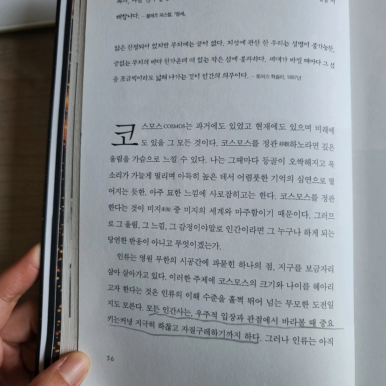 그런데 이 700쪽이 넘는 이 과학책을 읽으며 의외의 수확을 얻었다. 마음의 위안이었다. 책 속 한 문장이 마음에 들어왔다. "모든 인간사는, 우주적 입장과 관점에서 바라볼 때 중요하기는커녕 지극히 하찮고 자질구레하기 까지 하다."는 길지 않은 글귀였다.