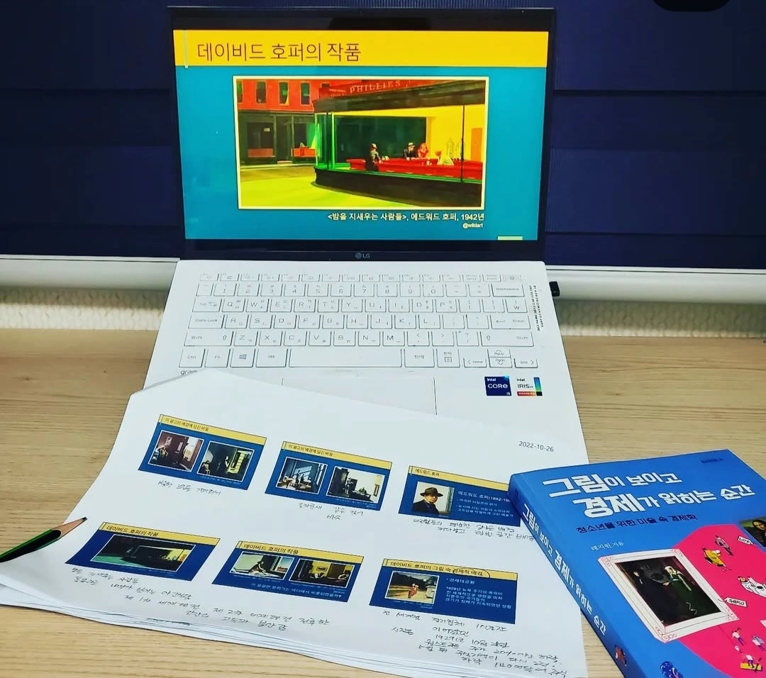 3. 방학과 가을 시즌에 도서관과 학교 강의를 이곳저곳 다녔습니다. 제 첫 책인 『그림이 보이고 경제가 읽히는 순간』 (자음과 모음, 2019)을 주제로 학부모님과 학생들을 만났는데, 성인 분들이 많이 오셨어요. 에드워드 호퍼와 경제 대공황, 렘브란트와 초기 자본주의 시기의 부르주아 이야기 등등을 엮어서 말씀을 드렸습니다. 일단 그림 관련 원고를 쓰거나 강연 준비를 하면 기분이 좋아요. 그림 파일 담으면서 눈호강을 할 수 있거든요.