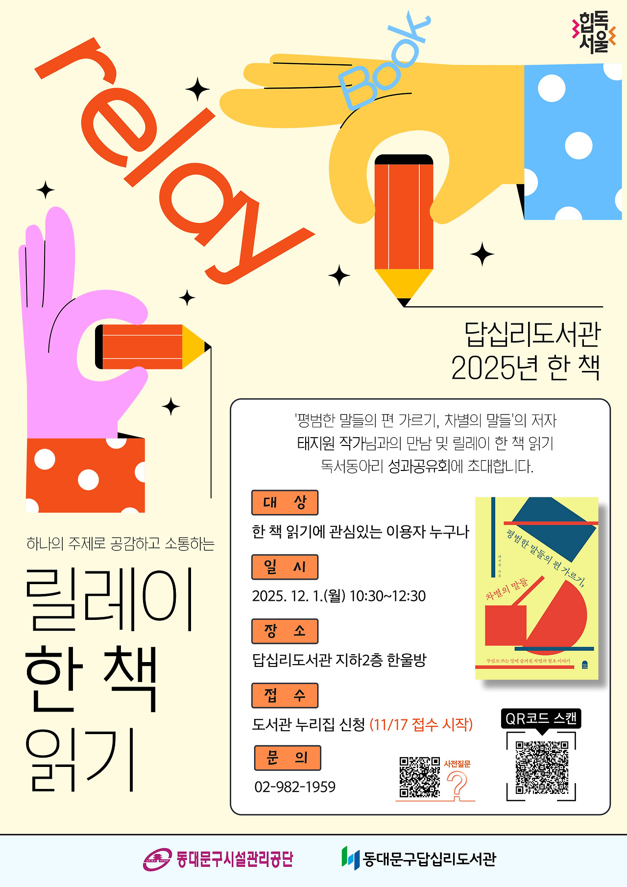 ✅신청방법 : 동대문구답십리도서관 누리집 신청 또는 02-982-1959(동대문구 회원이 아닐 경우 전화 신청)