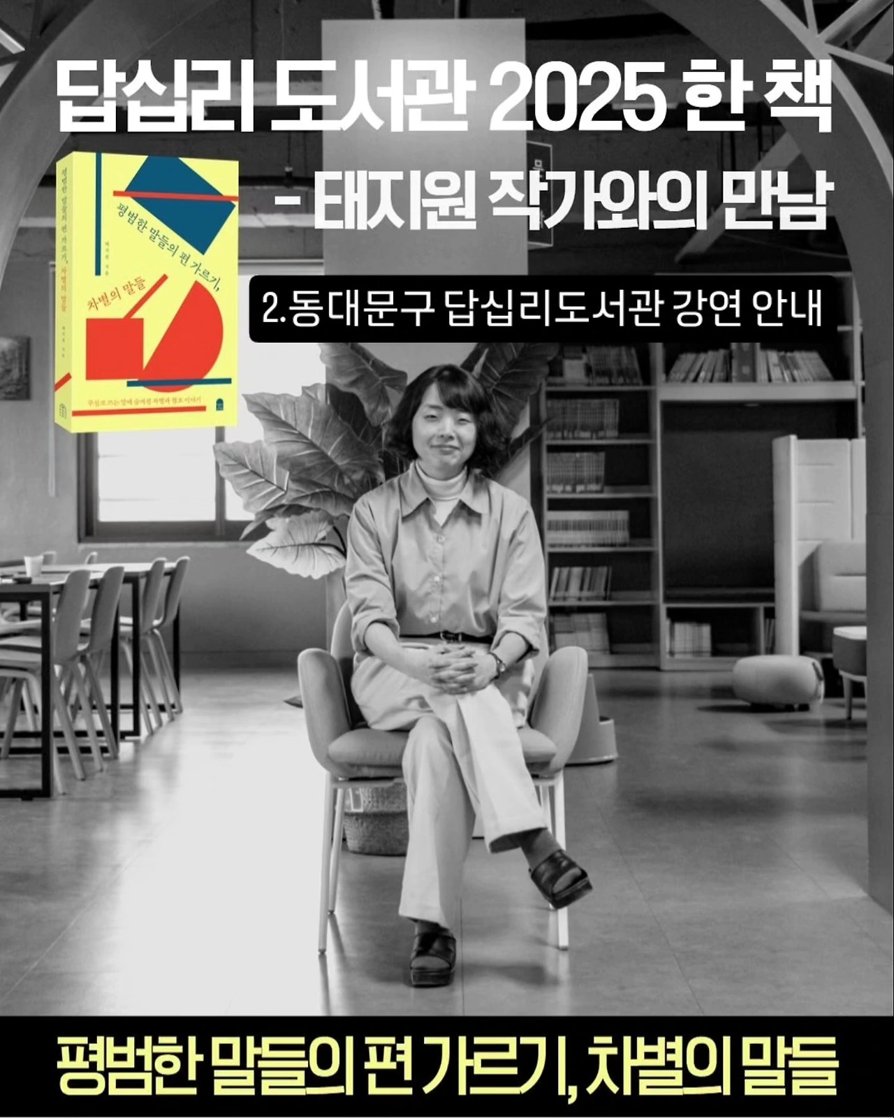 2. 12월 1일(월) 오전 10시에는 동대문구 답십리 도서관에서 강연이 있습니다. 감사하게도 올해 상반기, 답십리도서관에서 <차별의 말들> 책을 2025년 올해의 한 책으로 선정을 해주셨어요. 도서관 회원 분들이 릴레이로 이 책을 읽어주셨고, 그 성과 공유회의 일환으로 제 강연을 준비해 주셨습니다. 사실 작년에 이 곳 도서관에서 그림 인문학 강의를 한 적이 있는데( 그 때의 얘기에요 https://brunch.co.kr/@aring/257), 이렇게 또 다시 한 번 가게 되어서 뜻깊은 마음입니다.