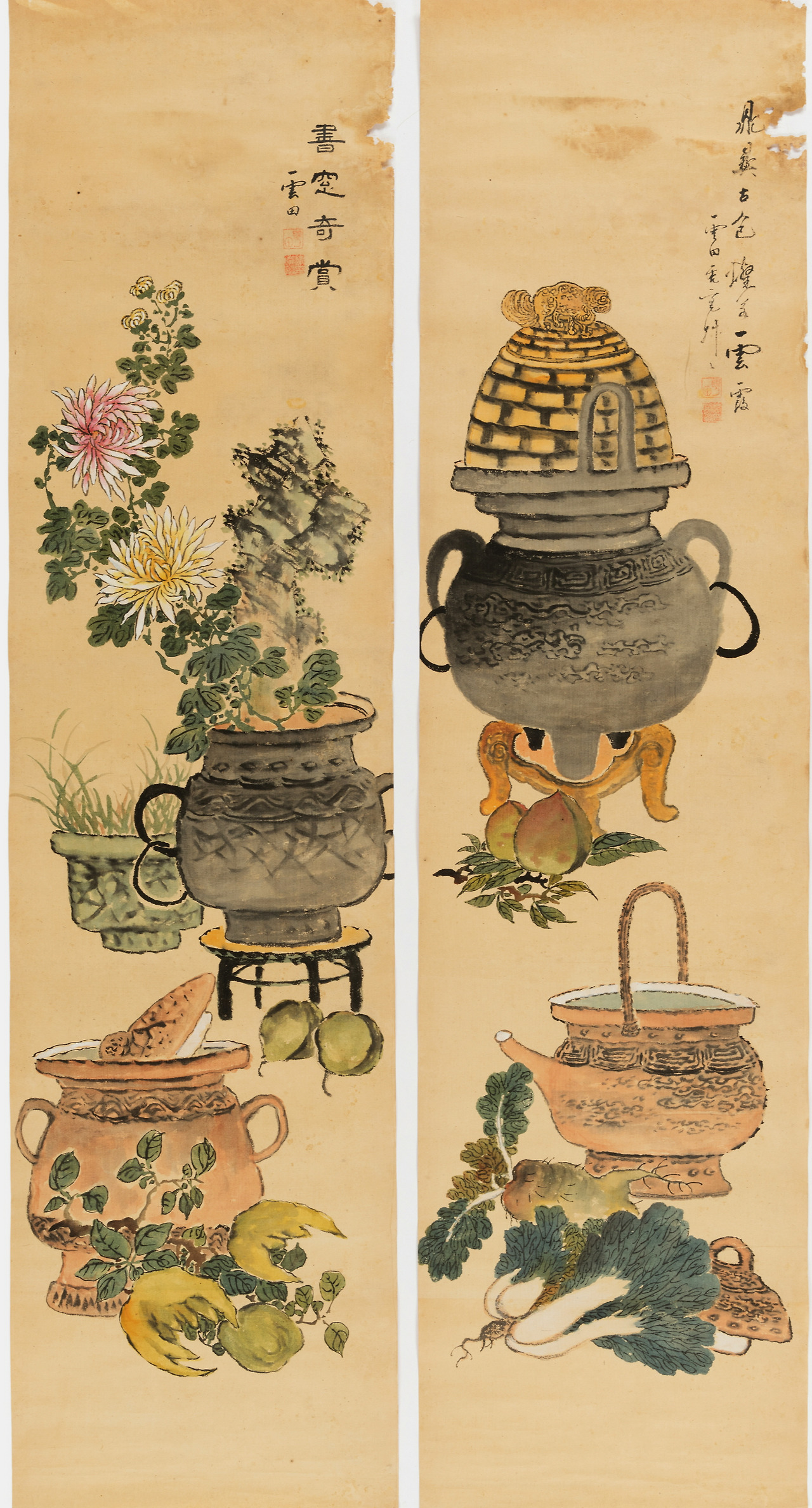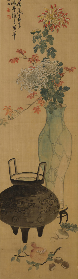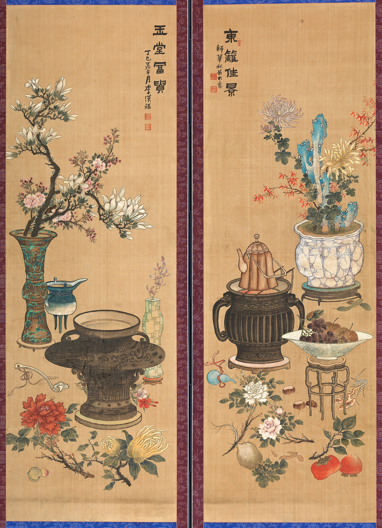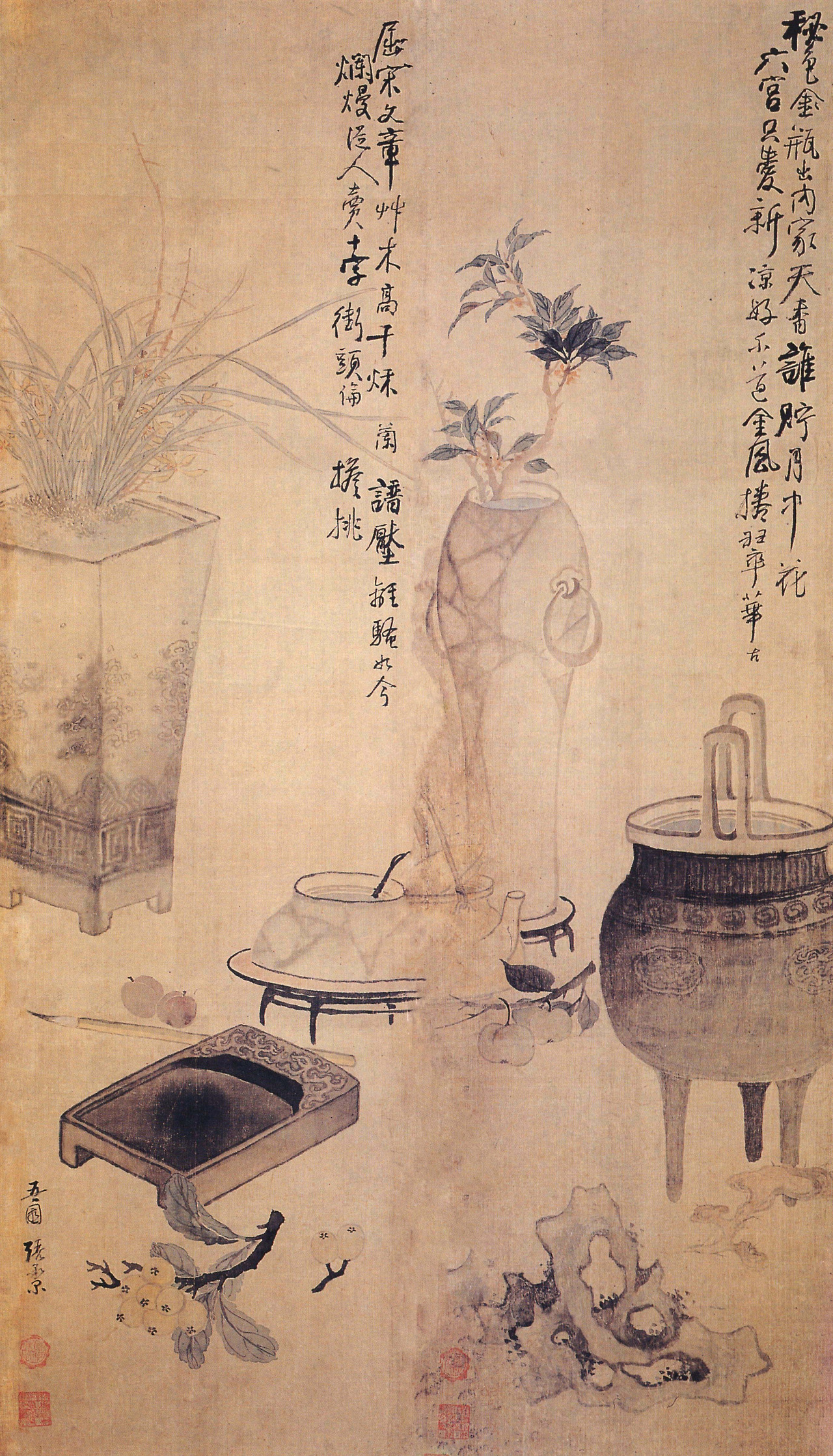 그림의 정체는 기명절지도(器皿折枝圖)다. 기명(器皿)은 진귀하고 기이한 옛 그릇을 말하며 절지(折枝)는 도자기에 꽂힌 꽃가지를 뜻한다. 한 마디로 중국 고대의 청동기(고동기 古銅器)나 도자기, 각종 그릇, 꽃가지, 과일과 채소 등을 곁들인 동양의 정물화 양식이다.