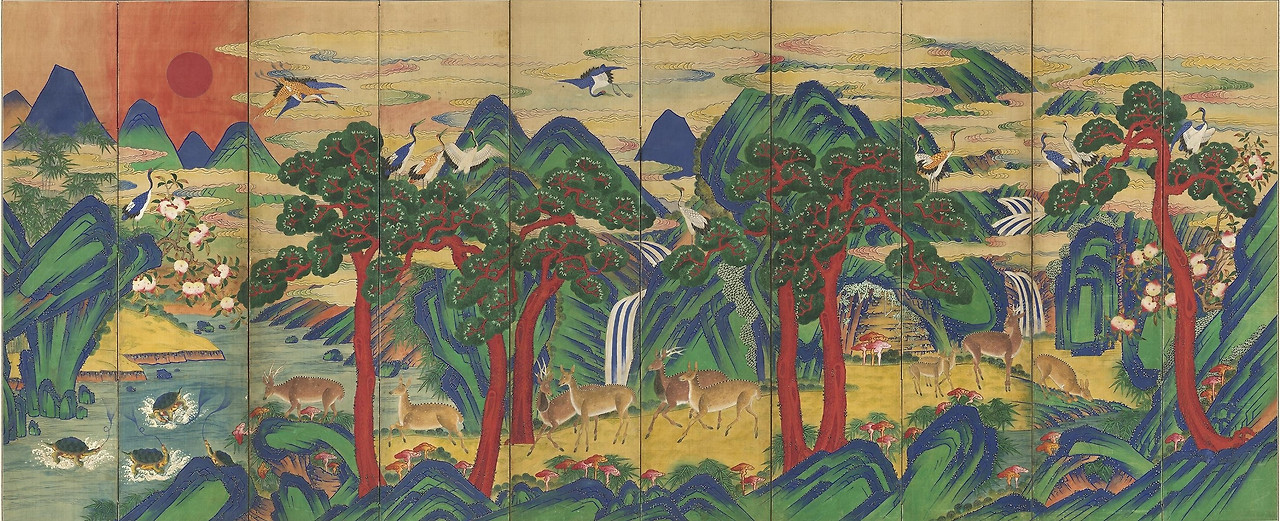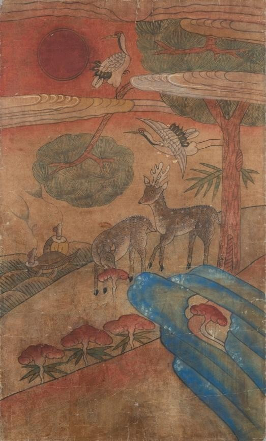 이 엄격하고 화려한 궁중의 그림은 조선 후기 민간의 영역으로 흘러들어 민화의 대표 소재가 된다. 질병이나 재해가 시시때때로 삶을 덮쳐오던 시대였다. 당연하게도 장수(長壽)는 민중의 큰 염원이었다. 영원불멸을 담은 그림은 고단한 삶을 보듬는 대중적인 위로로 자리 잡는다.