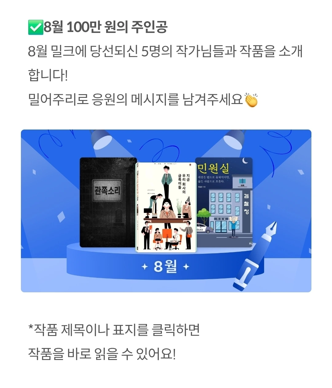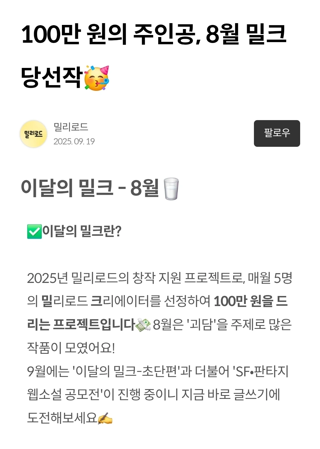 "밀리로드 8월 밀크"에 당선이 되었습니다. ^^